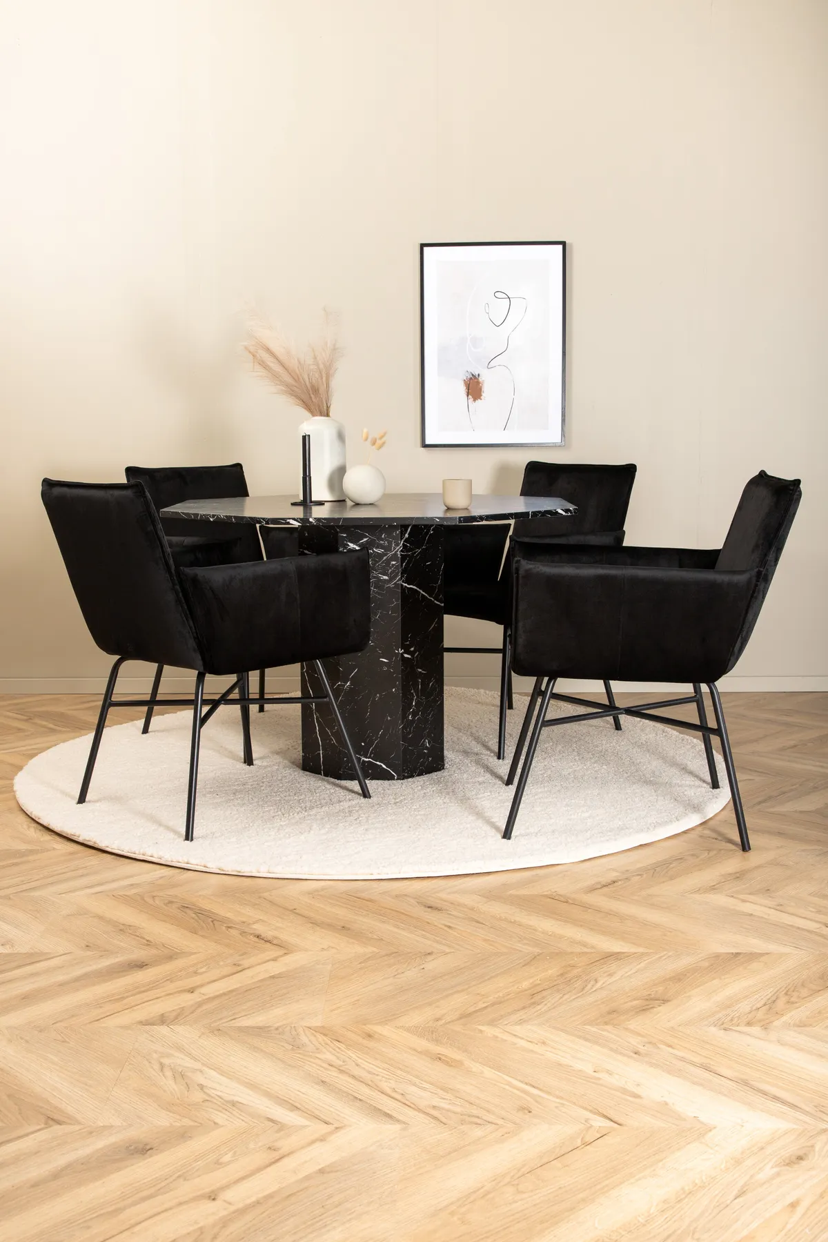 Schaffen Sie einen Blickfang, der beeindruckt! Die Esszimmerstühle Petra haben ein köstliches Design mit geraden nordischen Formen, weichem Samtstoff in schwarzer Farbe und Stuhlbeinen aus schwarzem Eisen. Stuhl Abmessungen: Höhe: 87cm, Sitzhöhe: 48cm, Breite: 57cm, Tiefe: 60cm. Hier werden die 4 Stühle mit dem Esstisch Marbs kombiniert – ein Designtisch mit herrlichem Design. Der Tisch hat die Form eines Achtecks und ist komplett verkleidet mit einer Platte aus schwarzem Marmorglas mit weißem Sprenkelmuster und Tischbeinen aus MDF und Marmorpapier. Tischabmessungen: Durchmesser: 110cm, Höhe: 75cm.