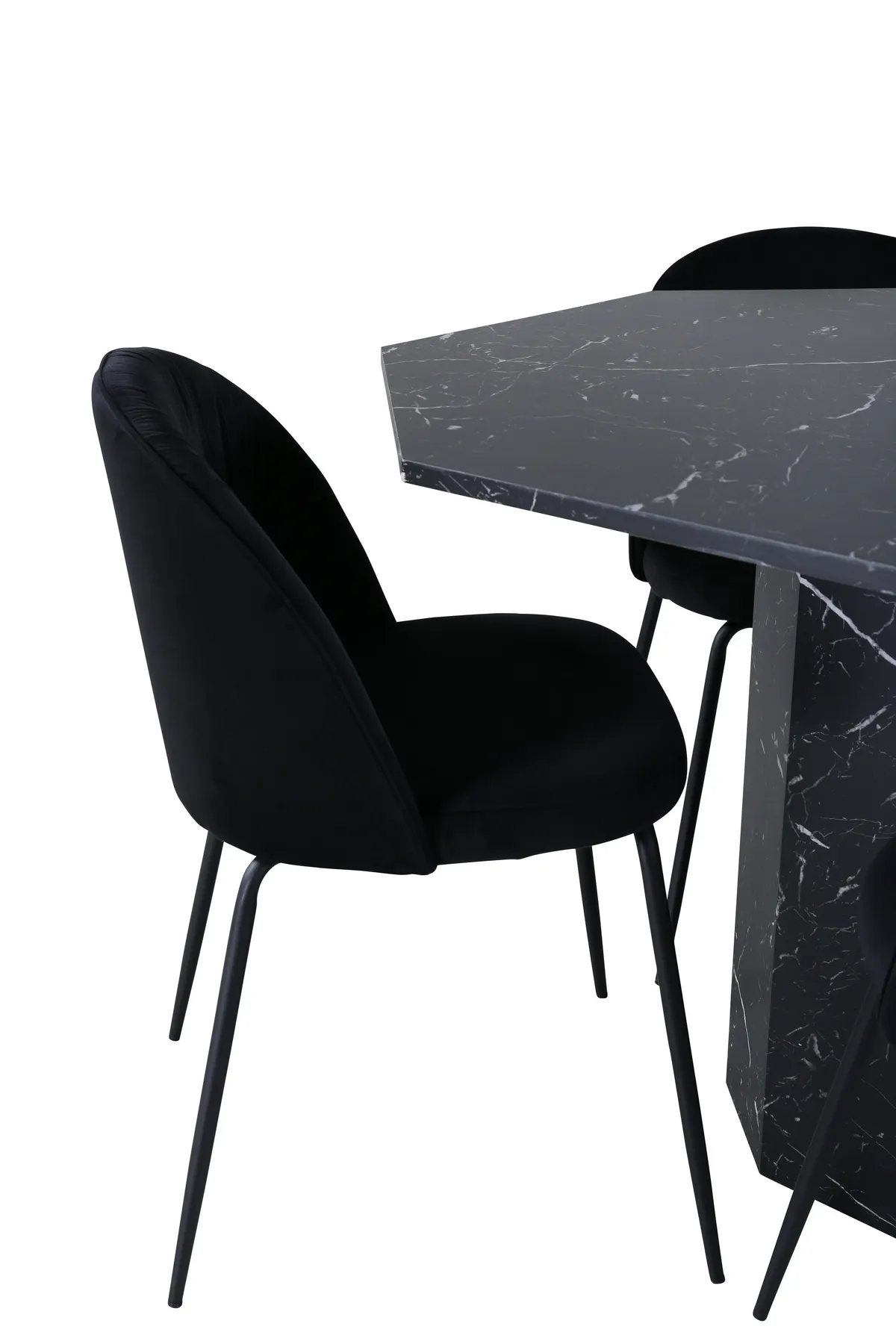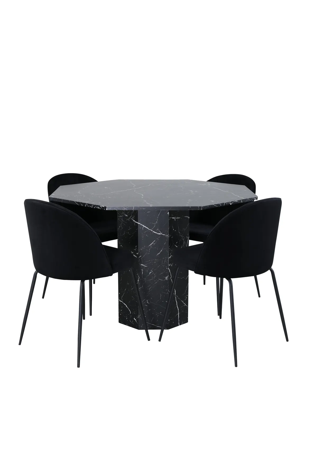 Schaffen Sie eine einladende Gemeinschaft um einen runden Esstisch! Der Esstisch Marbs hat die Form eines Achtecks und ist komplett verkleidet mit einer Platte aus schwarzem Marmorglas mit weißem Sprenkelmuster und Tischbeinen aus MDF und Marmorpapier. Tischabmessungen: Durchmesser: 110cm, Höhe: 75cm. Dazu passen 4 Esszimmerstühle aus der Serie Wrinkles – ein Stuhl mit hohem Sitzkomfort und schlankem Design. Die Stuhlbeine sind aus schwarzem Metall und der Sitz aus weichem Samtstoff. Maße des Stuhls: Höhe: 79,5cm, Sitzhöhe: 49,5cm, Breite: 49cm, Tiefe: 50cm. Lassen Sie das Herz Ihres Zuhauses durch diese auffällige Sitzgruppe verschönern.