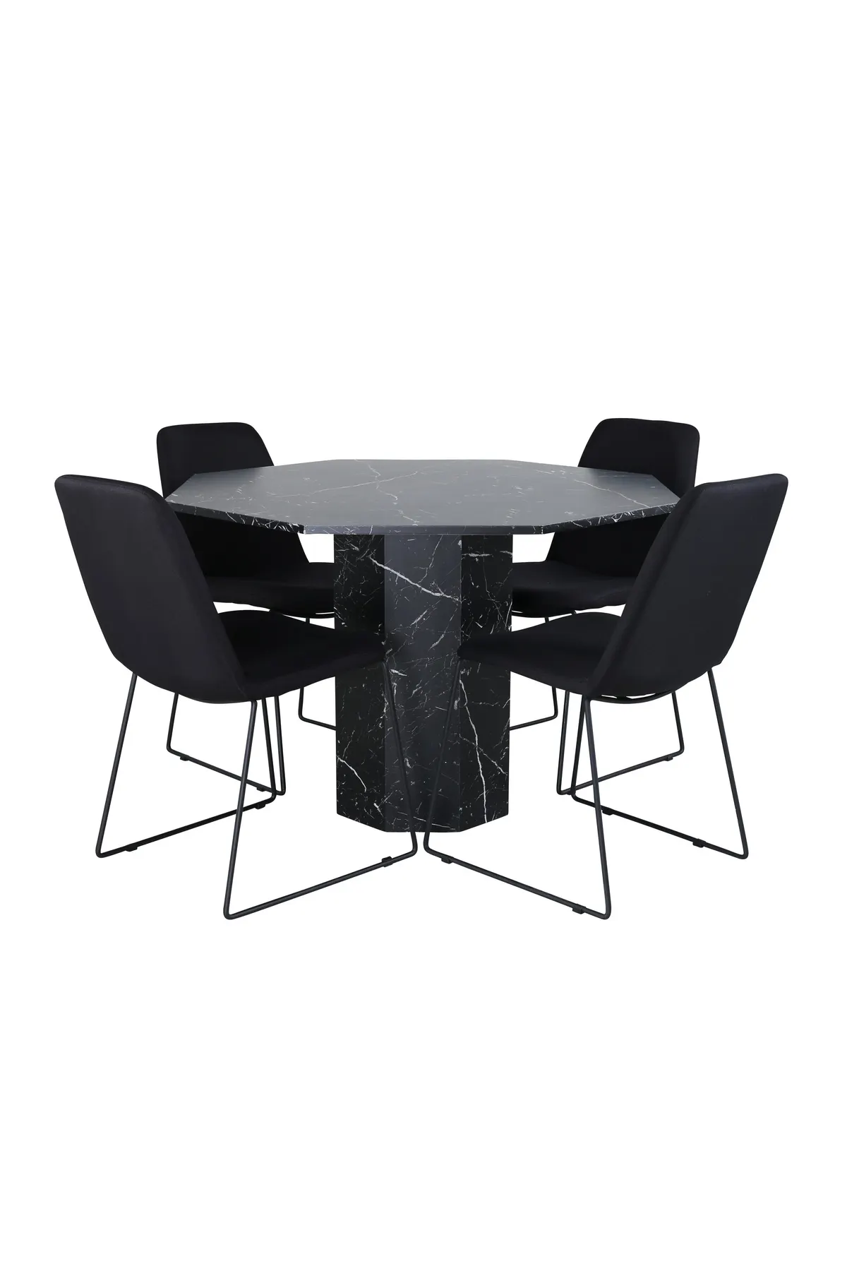 Erhöhen Sie das Einrichtungsniveau mit einer modernen Essgruppe in schickem Design! Der Esstisch Marbs hat die Form eines Achtecks und ist vollständig mit einer Platte aus schwarzem Marmorglas mit weißem Sprenkelmuster und Tischbeinen aus MDF und Marmorpapier ausgestattet. Tischabmessungen: Durchmesser: 110cm, Höhe: 75cm. Kombiniert mit 4 Muce Esszimmerstühlen in stilvollem Design. Die Stuhlbeine sind schmal in Metall und die Sitze in schwarzem Polyestergewebe. Abmessungen der Stühle: Höhe: 84cm, Sitzhöhe: 47cm, Breite: 43cm, Tiefe: 63cm. Richten Sie das Wohnzimmer mit einer familiären Essgruppe mit modernem Feeling ein!