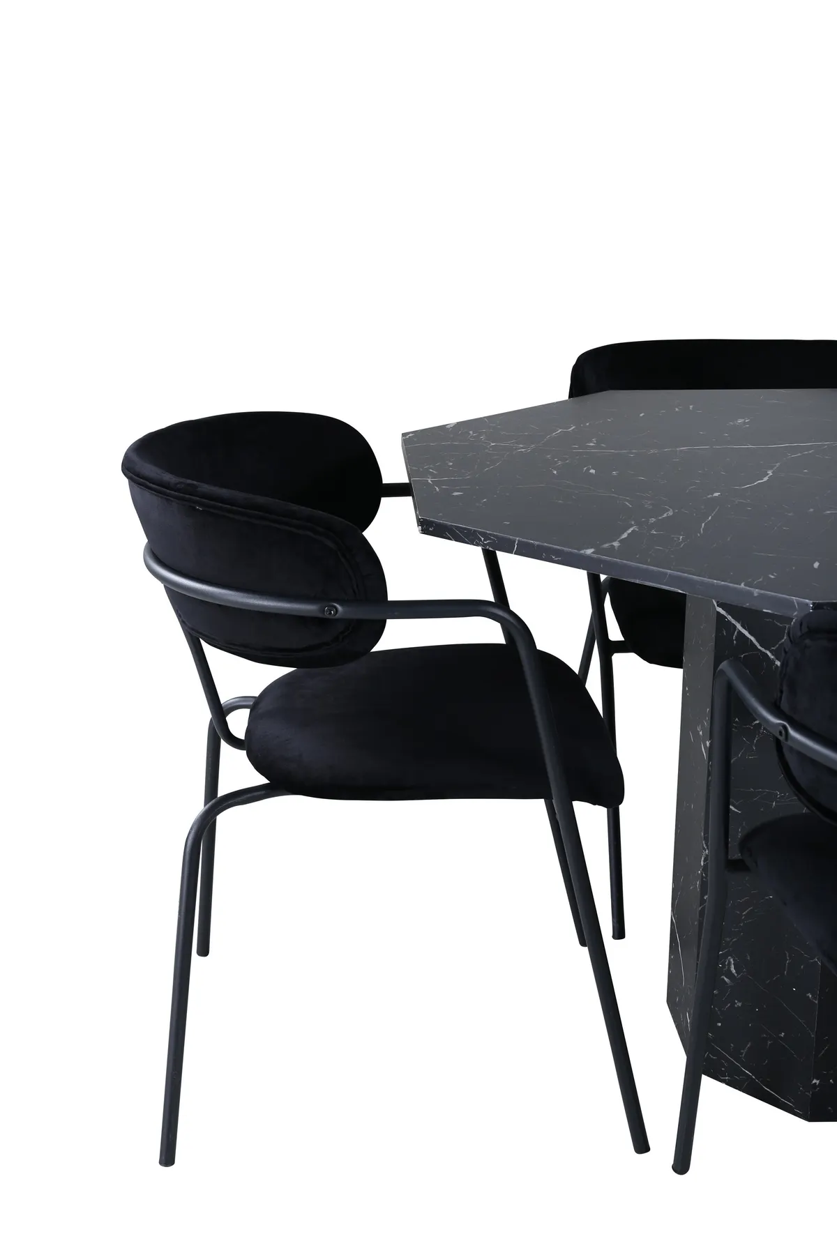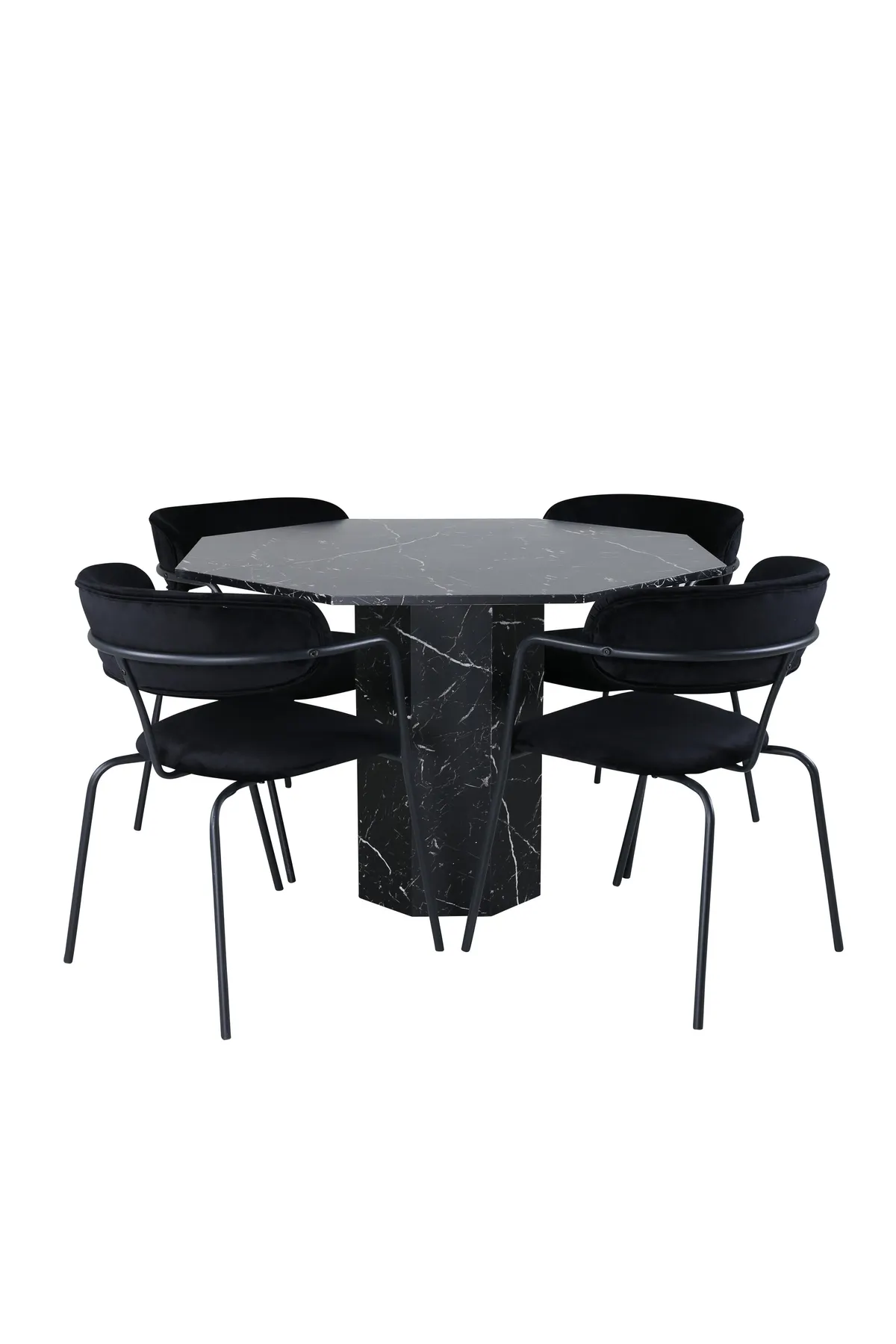 Eine schöne passende und einladende Essgruppe in modernem Design! Der Esstisch Marbs hat die Form eines Achtecks und ist komplett verkleidet mit einer Platte aus schwarzem Marmorglas mit weißem Sprenkelmuster und Tischbeinen aus MDF und Marmorpapier. Tischabmessungen: Durchmesser: 110cm, Höhe: 75cm. Hier zusammen mit 4 Pfeil-Esszimmerstühlen mit einem weichen Sitz aus schwarzem Samtstoff und integrierten Armlehnen sowie den schwarzen Metallstuhlbeinen. Stuhl-Maße: Höhe: 79cm, Sitzhöhe: 47cm, Breite: 58cm, Tiefe: 61cm. Lassen Sie das Herz Ihres Zuhauses von dieser auffälligen Essgruppe schmücken.