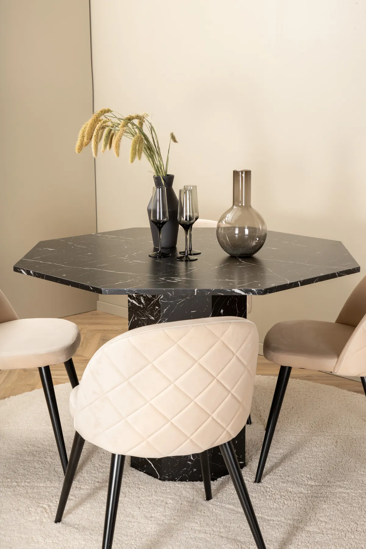 Der Esstisch Marbs – eine Stilikone für das Wohnzimmer! Der Tisch hat die Form eines Achtecks und ist komplett verkleidet mit einer Platte aus schwarzem Marmorglas mit weißem Sprenkelmuster und Tischbeinen aus MDF und Marmorpapier. Tischabmessungen: Durchmesser: 110cm, Höhe: 75cm. Hier in Kombination mit 4 Velvet Stitches Esszimmerstühlen. Die Stühle haben ein einladendes Design mit Sitzflächen aus beigem Samt mit Ziernähten und leicht ausgestellten Stuhlbeinen aus schwarzem Metall. Maße der Stühle: Höhe: 76,5cm, Sitzhöhe: 46,5cm, Breite: 50cm, Tiefe: 57cm. Schaffen Sie einen charmanten Mittelpunkt im Herzen Ihres Zuhauses!