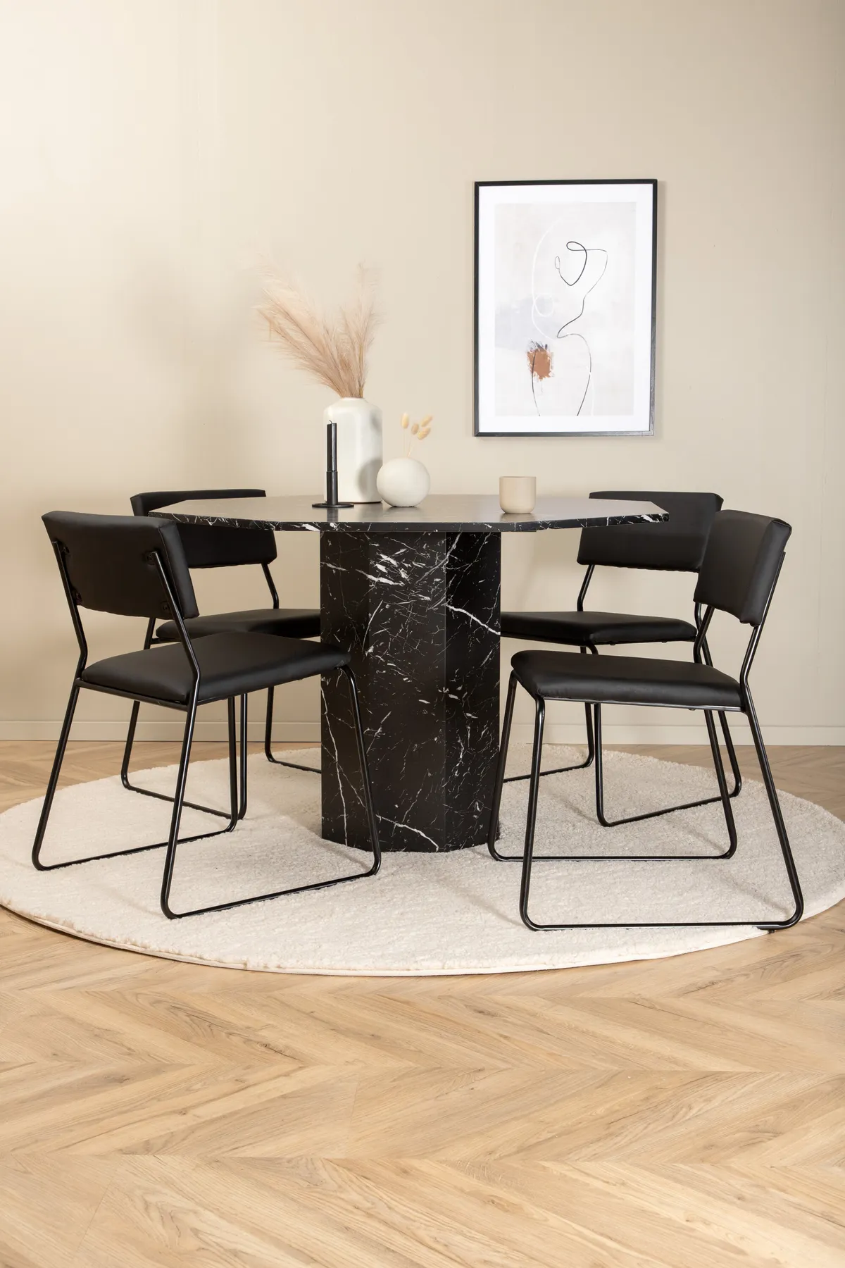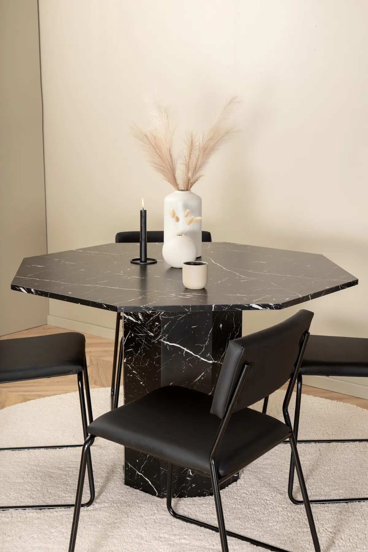Einladend und stilvoll – Esstisch Marbs schafft einen modebewussten Eindruck in Ihrem Zuhause! Der Tisch hat die Form eines Achtecks und ist komplett verkleidet mit einer Tischplatte aus schwarzem Marmorglas mit weißem Sprenkelmuster und Tischbeinen aus MDF und Marmorpapier. Tischabmessungen: Durchmesser: 110cm, Höhe: 75cm. Kombiniert mit 4 Kenth Esszimmerstühlen in schwarzer Farbe mit Stuhlbeinen aus Eisen und Sitzen aus Kunstleder. Stuhl Abmessungen: Höhe: 76cm, Sitzhöhe: 48,5cm, Breite: 40cm, Tiefe: 52cm. Lassen Sie das Herz Ihres Zuhauses von dieser auffälligen Essgruppe schmücken!