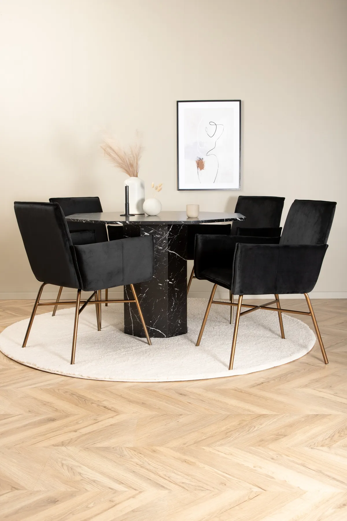 Schaffen Sie einen Blickfang, der beeindruckt! Die Esszimmerstühle Petra haben ein köstliches Design mit geraden nordischen Formen, weichem Samtstoff in schwarzer Farbe und Stuhlbeinen aus kupferfarbenem Eisen. Stuhl Abmessungen: Höhe: 87cm, Sitzhöhe: 48cm, Breite: 57cm, Tiefe: 60cm. Hier werden die 4 Stühle mit dem Esstisch Marbs kombiniert – ein Designtisch mit herrlichem Design. Der Tisch hat die Form eines Achtecks und ist komplett verkleidet mit einer Platte aus schwarzem Marmorglas mit weißem Sprenkelmuster und Tischbeinen aus MDF und Marmorpapier. Tischabmessungen: Durchmesser: 110cm, Höhe: 75cm.