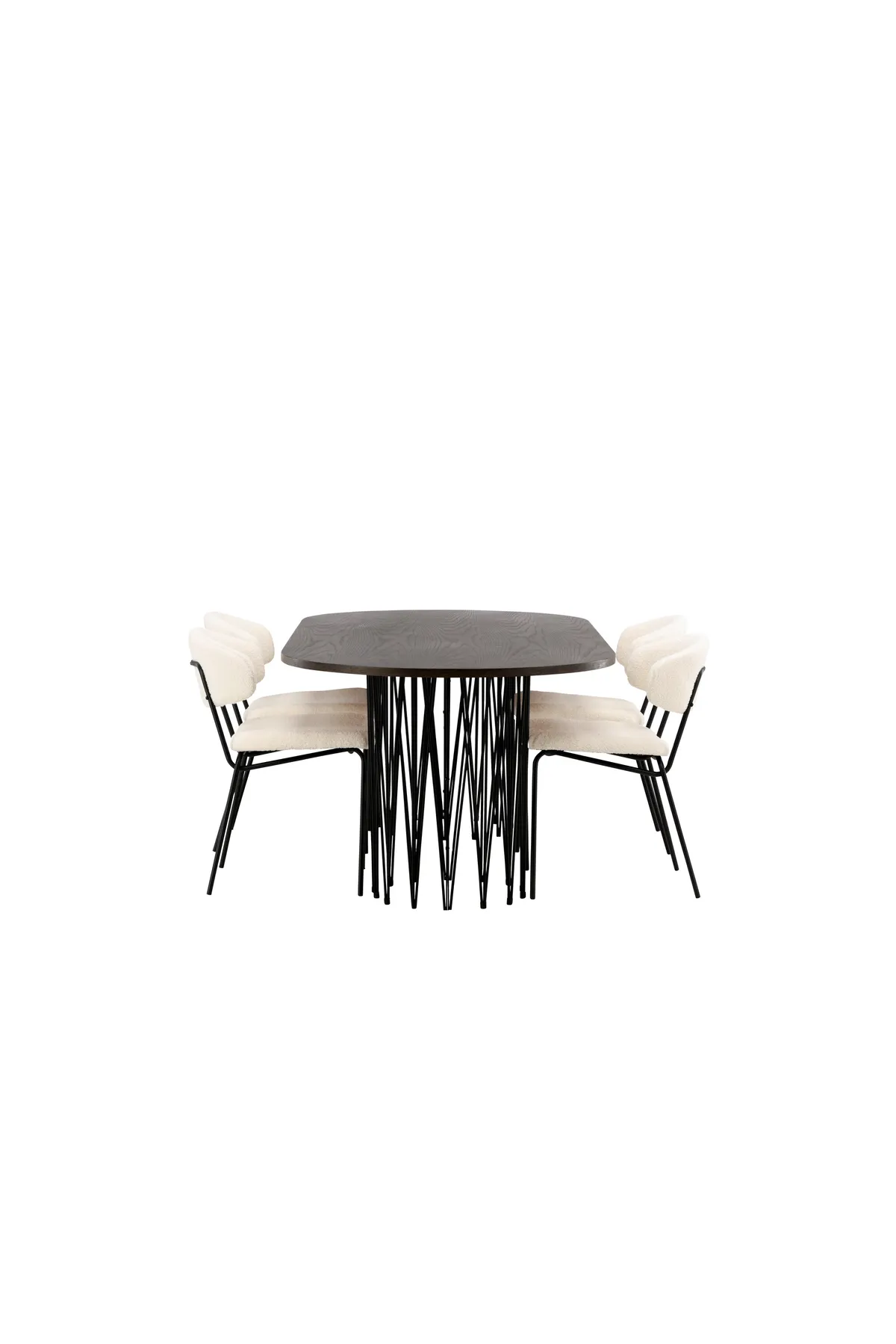 Ebenso stilvoll wie praktisch – diese gemütliche Essgruppe strahlt sowohl Komfort als auch modebewusstes Design aus! Unser ovaler Esstisch Stone hat ein fantastisches, skandinavisches Design, das in die Menge passt. Der Tisch hat eine schöne braunfarbene Tischplatte aus MDF mit Furnier und zwei dekorative zylinderförmige Gestelle aus schwarzem Metall. Hier zusammen mit unseren trendigen Esszimmerstühlen aus der Chico-Serie. Die Stühle haben ein minimalistisches und bequemes Design mit einer Rückenlehne und Sitzfläche aus weißem Bouclestoff und einem schmalen Gestell aus schwarzem Stahl. Hier bekommen Sie ein gemütliches Herzstück in Ihrem Zuhause!