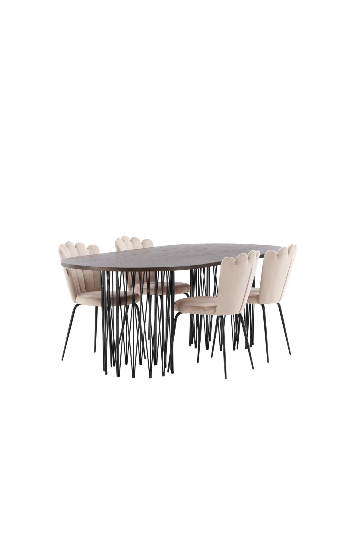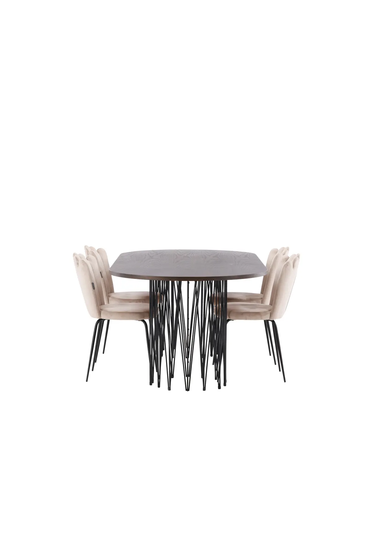 Richten Sie das Herzstück Ihres Hauses mit einer Essgruppe ein, die Luxus und Komfort ausstrahlt! Unser ovaler Esstisch Stone hat ein fantastisches skandinavisches Design, das in die Menge passt. Der Tisch hat eine schöne braunfarbene Tischplatte aus MDF mit Furnier und zwei dekorative zylinderförmige Gestelle aus schwarzem Metall. Hier in perfekter Kombination mit unseren schönen Stühlen aus der Limhamn-Serie. Der Stuhl ist ein moderner Favorit in vielen Haushalten mit seinem einladenden Design, der dekorativen muschelförmigen Rückenlehne mit Ziernähten und einem runden Sitz aus geschmackvollem beigem Samtstoff. Die Beine sind aus schwarz pulverbeschichtetem Metall. Sitzen Sie bequem und herrschaftlich!