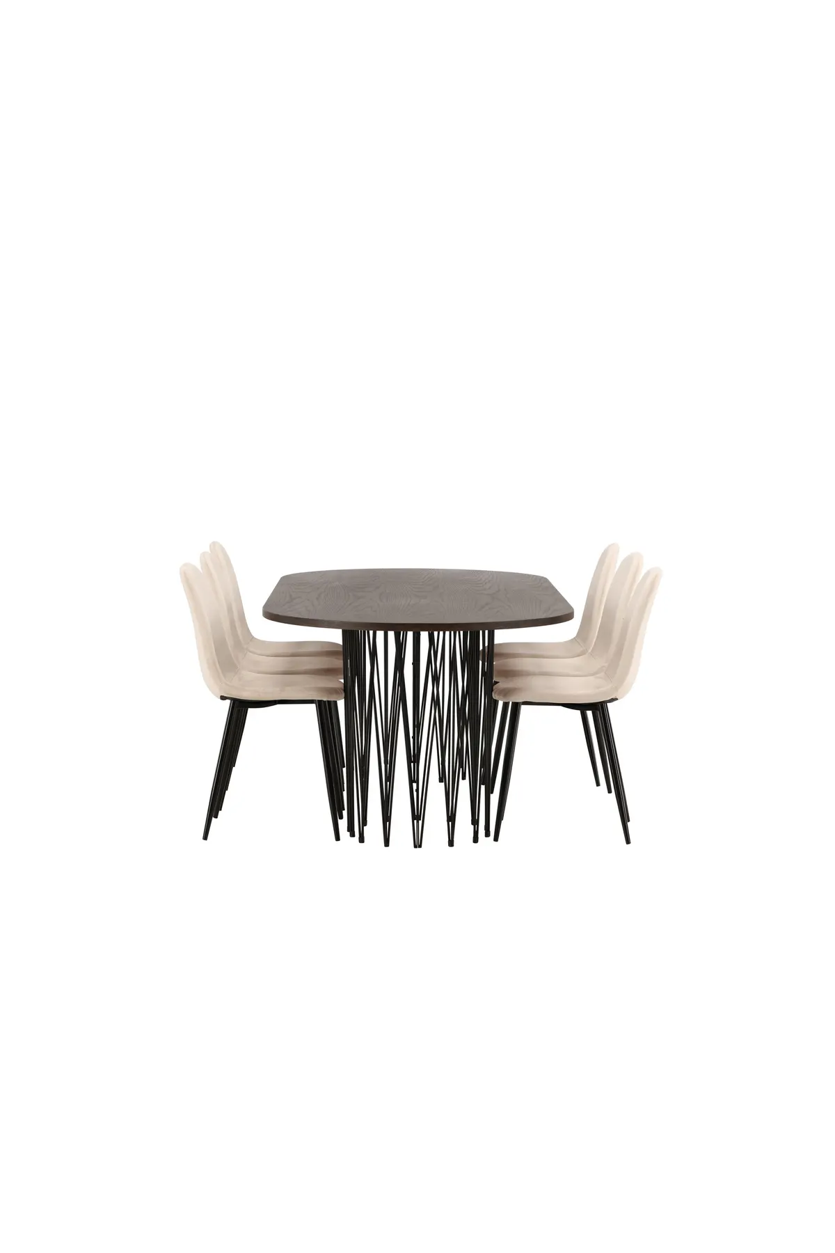 Richten Sie das Herzstück Ihres Hauses mit einer Essgruppe ein, die Luxus und Komfort ausstrahlt! Unser ovaler Esstisch Stone hat ein fantastisches, skandinavisches Design. Der Tisch hat eine schöne braune Tischplatte aus MDF mit Furnier und zwei dekorative zylinderförmige Gestelle aus schwarzem Metall. Hier in perfekter Kombination mit Esszimmerstühlen aus der Serie Polar. Der Stuhl hat ein vollgepolstertes Design mit einer abgerundeten Rückenlehne und Sitzfläche aus beigem Samtstoff mit weicher Polsterung und Beinen aus schwarzem pulverbeschichtetem Metall. Gehen Sie keine Kompromisse zwischen Bequemlichkeit und stilvollem Design ein!