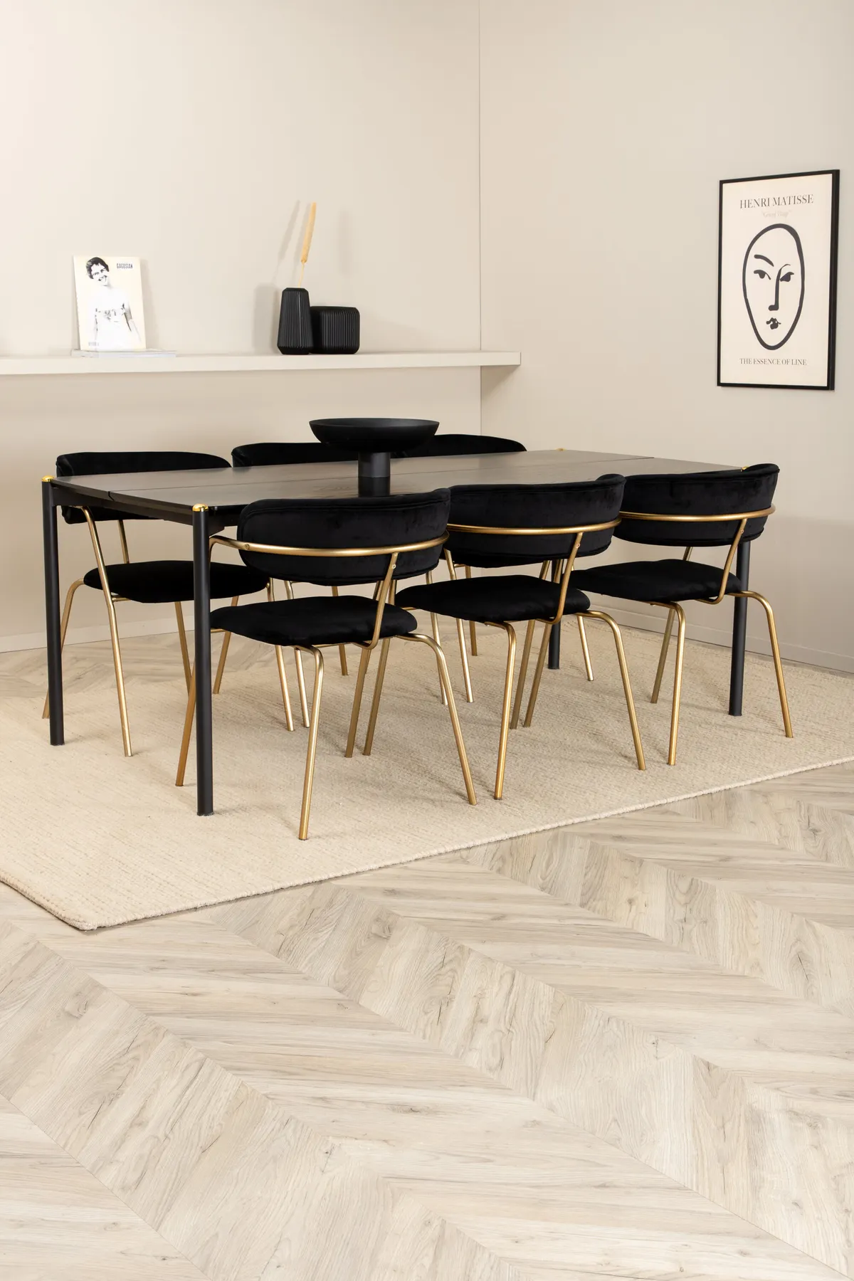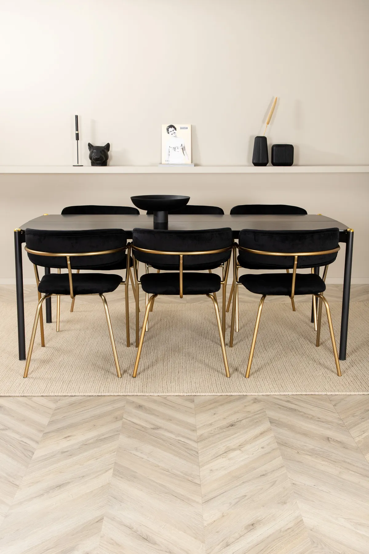 Stilvoll, luxuriös und zeitlos – Esstisch Pelle schafft einen modebewussten Eindruck in Ihrem Zuhause! Das Design ist gut durchdacht mit geraden nordischen Formen, die ein stilvolles Gefühl vermitteln, schmalen Beinen aus Eisen, die oben eine dekorative Messingknospe haben, und einem Lauf in der Mitte der Tischplatte, der zu einem köstlichen Detail wird. Die Tischplatte ist aus schwarzem MDF mit Furnier und die Tischmaße: Länge: 190cm, Breite: 90cm, Höhe: 75cm. Dazu gibt es 6 Pfeil-Esszimmerstühle mit messingfarbenen Metallbeinen und schwarzen Sitzen aus weichem Samtstoff. Stuhl-Maße: Höhe: 79cm, Sitzhöhe: 47cm, Breite: 58cm, Tiefe: 61cm.