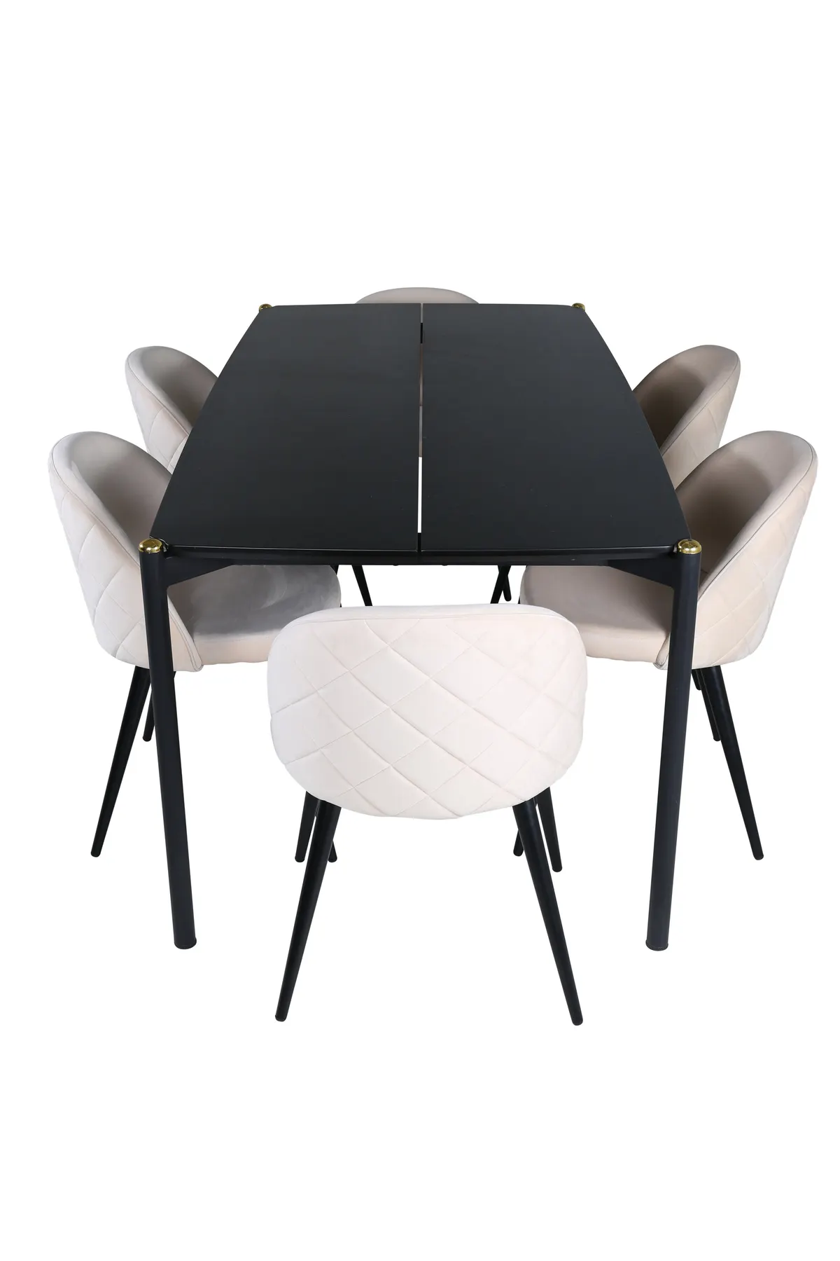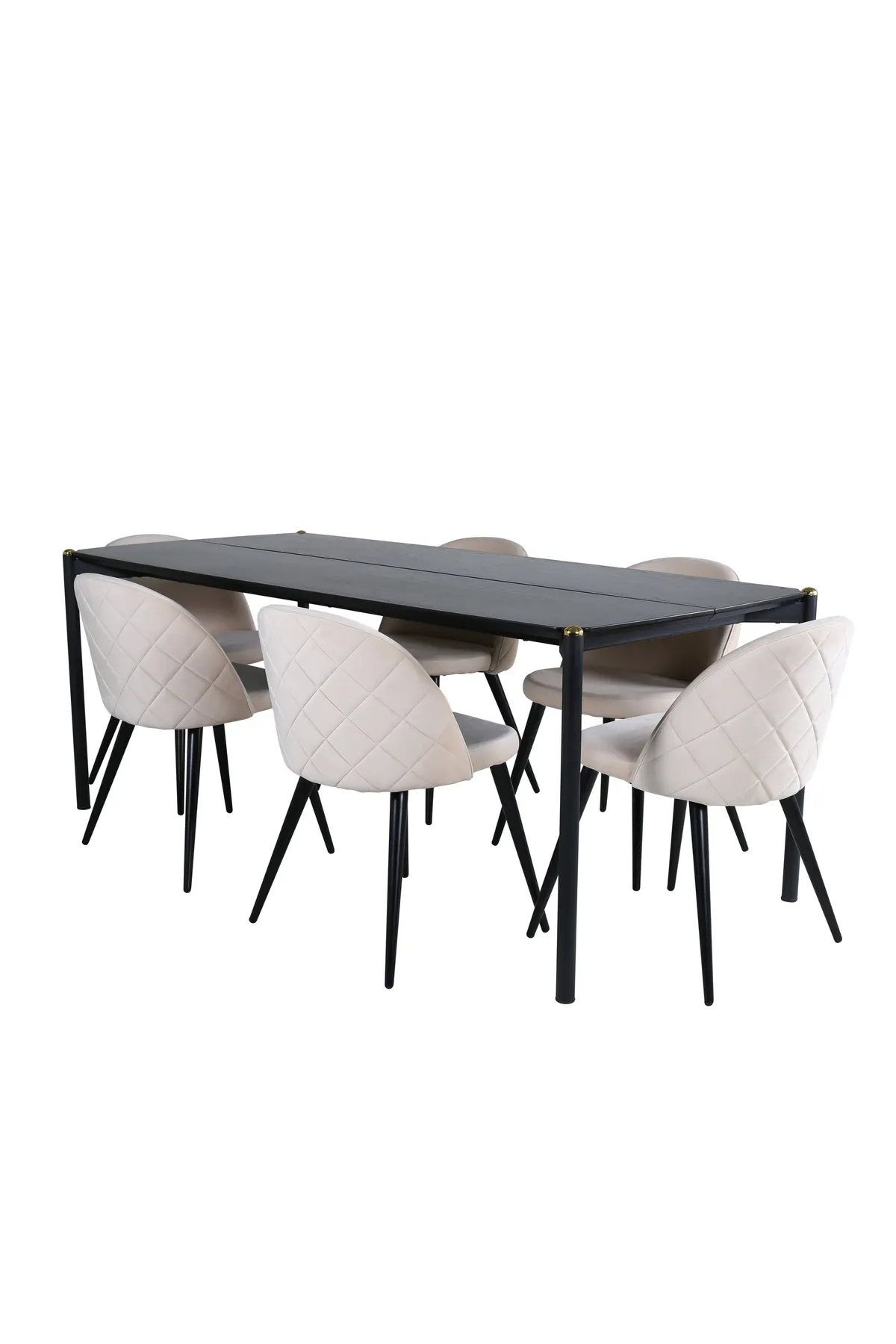 Stilvoll, luxuriös und zeitlos – Esstisch Pelle schafft einen modebewussten Eindruck in Ihrem Zuhause! Das Design ist gut durchdacht mit geraden nordischen Formen, die ein stilvolles Gefühl vermitteln, schmalen Beinen aus Eisen, die oben eine dekorative Messingknospe haben, und einem Lauf in der Mitte der Tischplatte, der zu einem köstlichen Detail wird. Die Tischplatte ist aus schwarzem MDF mit Furnier und die Tischmaße: Länge: 190cm, Breite: 90cm, Höhe: 75cm. Hier in köstlicher Kombination mit 6 Velvet Stitches Esszimmerstühlen. Die Stuhlbeine sind leicht ausgestellt in schwarzem Eisen und der Sitz beige in weichem Samtstoff mit dekorativer Naht auf der Rückseite des Stuhls. Stuhl Abmessungen: Höhe: 76,5cm, Sitzhöhe: 46,5cm, Breite: 50cm, Tiefe: 57cm.