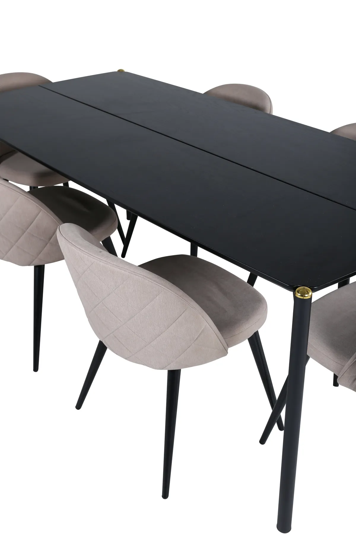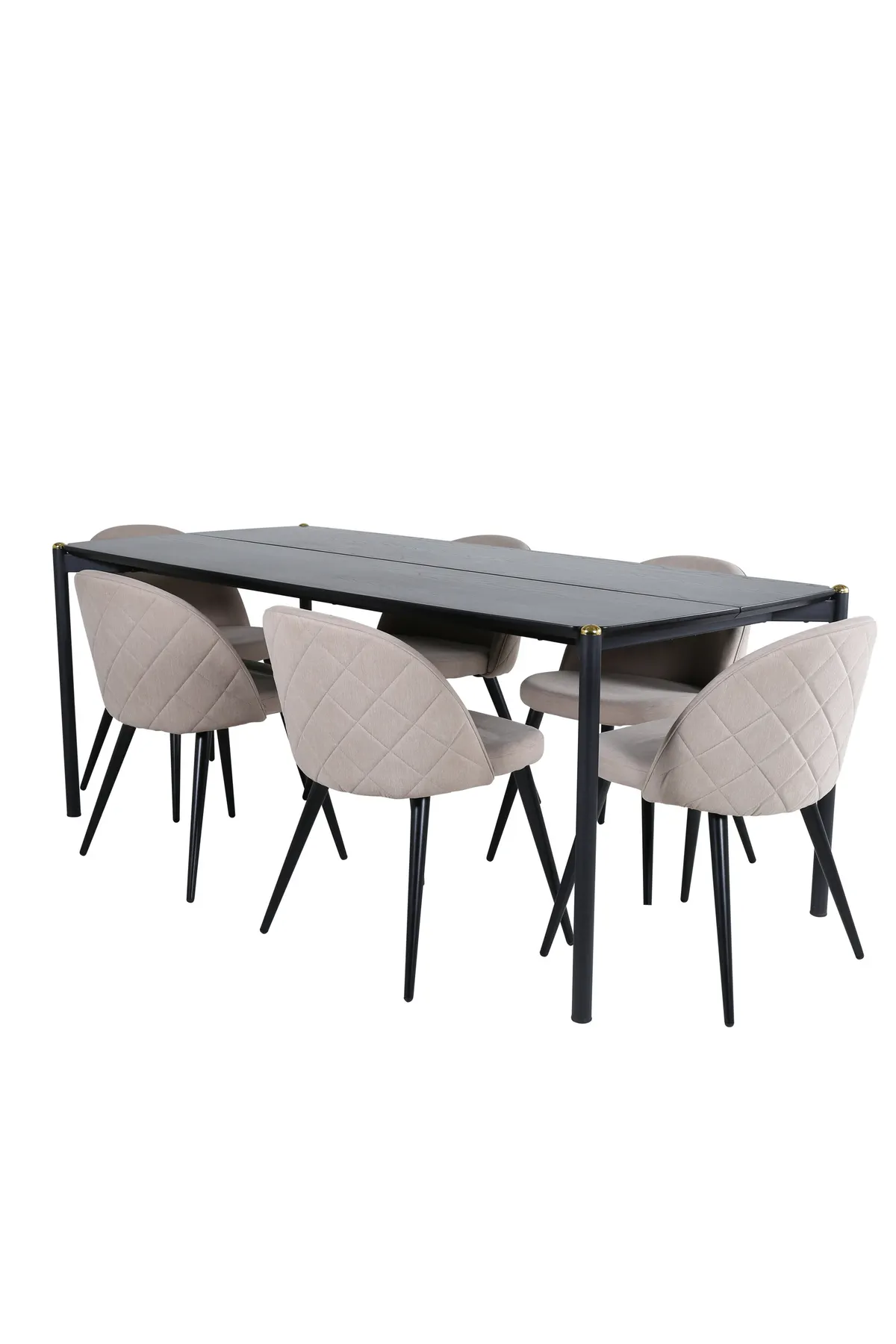 Stilvoll, luxuriös und zeitlos – Esstisch Pelle schafft einen modebewussten Eindruck in Ihrem Zuhause! Das Design ist gut durchdacht mit geraden nordischen Formen, die ein stilvolles Gefühl vermitteln, schmalen Beinen aus Eisen, die oben eine dekorative Messingknospe haben, und einem Lauf in der Mitte der Tischplatte, der zu einem köstlichen Detail wird. Die Tischplatte ist aus schwarzem MDF mit Furnier und die Tischmaße: Länge: 190cm, Breite: 90cm, Höhe: 75cm. Hier in köstlicher Kombination mit 6 Velvet Stitches Esszimmerstühlen. Die Stuhlbeine sind leicht ausgestellt in schwarzem Eisen und die Sitzfläche beige in weichem Polyesterleinen mit Ziernähten auf der Rückseite des Stuhls. Stuhl Abmessungen: Höhe: 76,5cm, Sitzhöhe: 46,5cm, Breite: 50cm, Tiefe: 57cm.