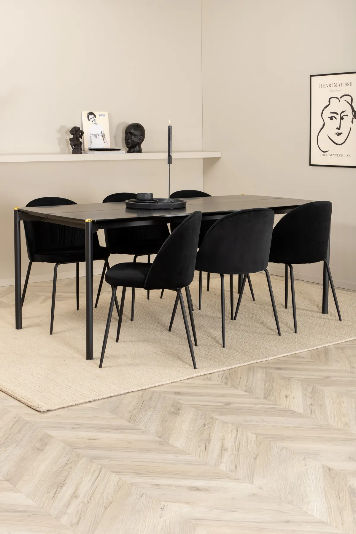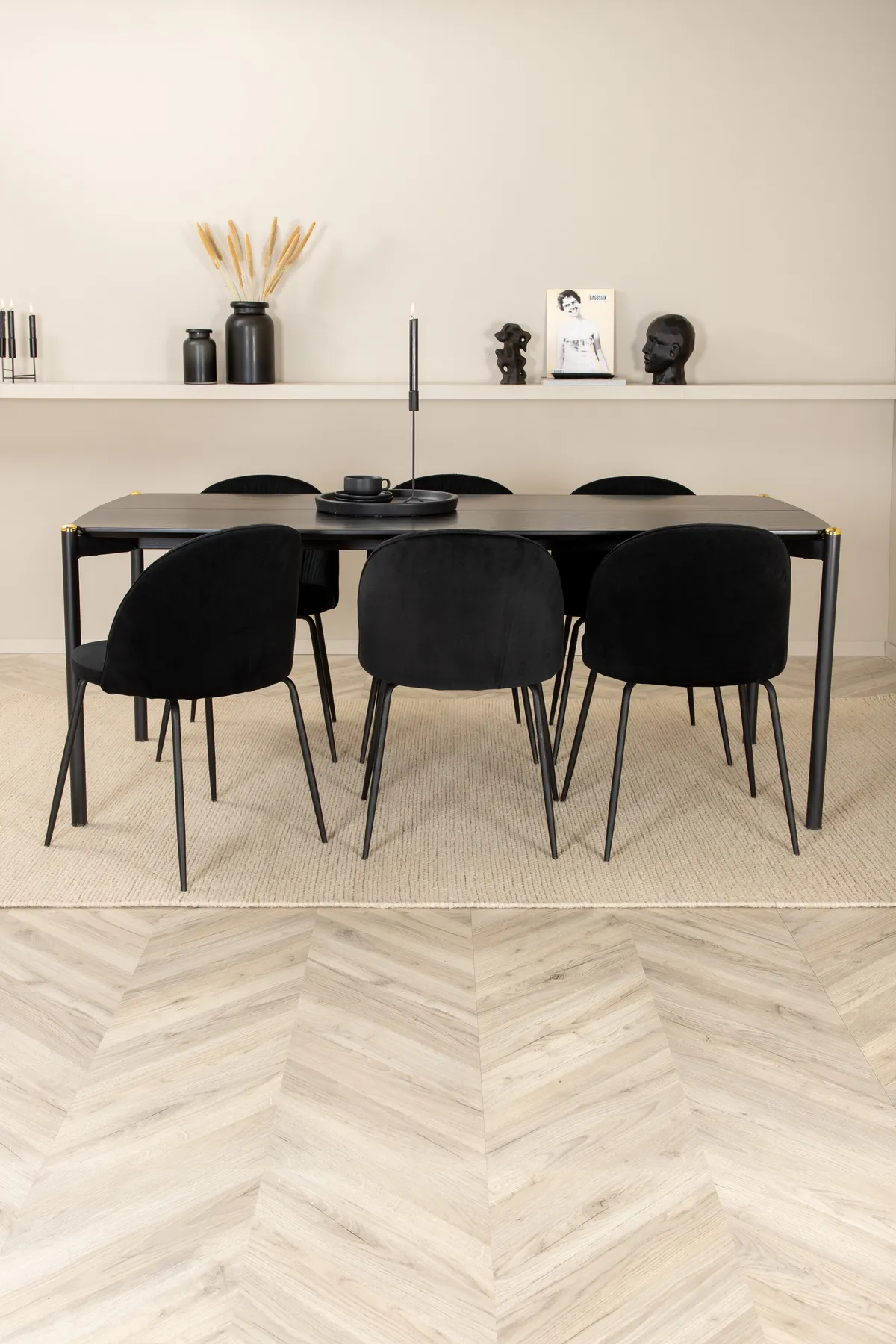 Ein moderner Stuhl mit allem Drum und Dran – Esszimmerstuhl Wrinkles in schwarzem Samtstoff und Metallstuhl hat ein exklusives, vollverkleidetes Design, das einen einladenden Blickfang schafft! Stuhl Abmessungen: Höhe: 79,5cm, Sitzhöhe: 49,5cm, Breite: 49cm, Tiefe: 50cm. Hier sind die 6 Stühle mit dem Esstisch Pelle kombiniert. Die Tischplatte ist aus schwarzem MDF mit Furnier und die Tischmaße: Länge: 190cm, Breite: 90cm, Höhe: 75cm. Das Design ist gut durchdacht mit geraden nordischen Formen, die ein stilvolles Gefühl vermitteln, schmalen Beinen aus Eisen, die eine dekorative Messingknospe auf der Oberseite haben und einem Lauf in der Mitte der Tischplatte, der zu einem köstlichen Detail wird.