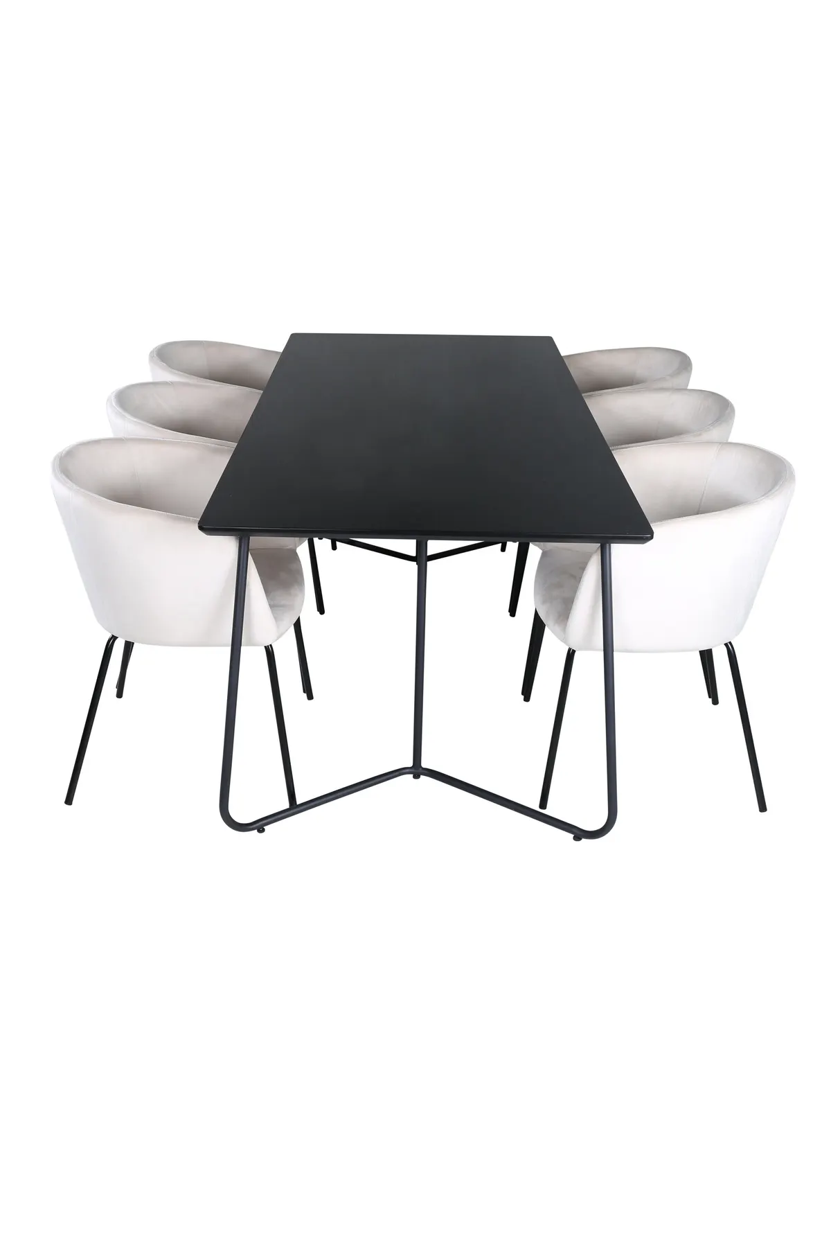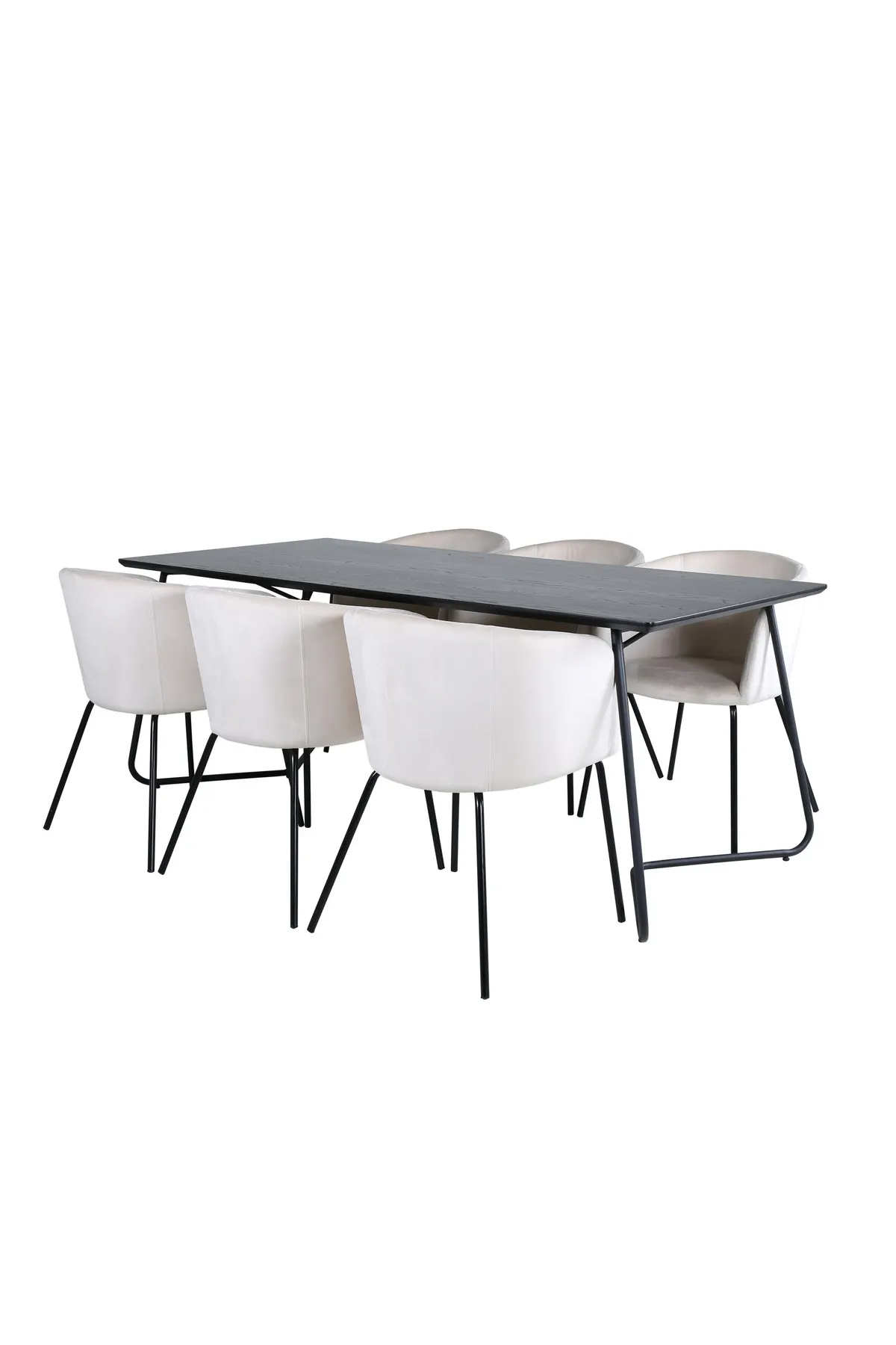 Lassen Sie sich an diesem einladenden und stilvollen Esstisch für lange Abendessen mit Familie und Freunden nieder! Esstisch Petra hat ein gut durchdachtes Design mit skandinavischen Formen, die ein stilvolles Gefühl vermitteln, schmale, leicht ausgestellte Beine aus schwarzem Eisen und eine Tischplatte aus schwarzem MDF mit Furnier. Maße des Tisches: Länge: 190cm, Breite: 90cm, Höhe: 75cm. Hier in perfekter Kombination mit 6 bequemen Esszimmerstühlen aus der Serie Berit. Die Stuhlbeine sind aus schwarzem Eisen und der vollständig bekleidete Sitz aus beigem Samt, der dem Raum einen herrlichen Glanz verleiht. Stuhl Abmessungen: Höhe: 78cm, Sitzhöhe: 49cm, Breite: 55cm, Tiefe: 55cm. Eine luxuriöse und stilvolle Essgruppe, die zu langen Dinner-Momenten einlädt!