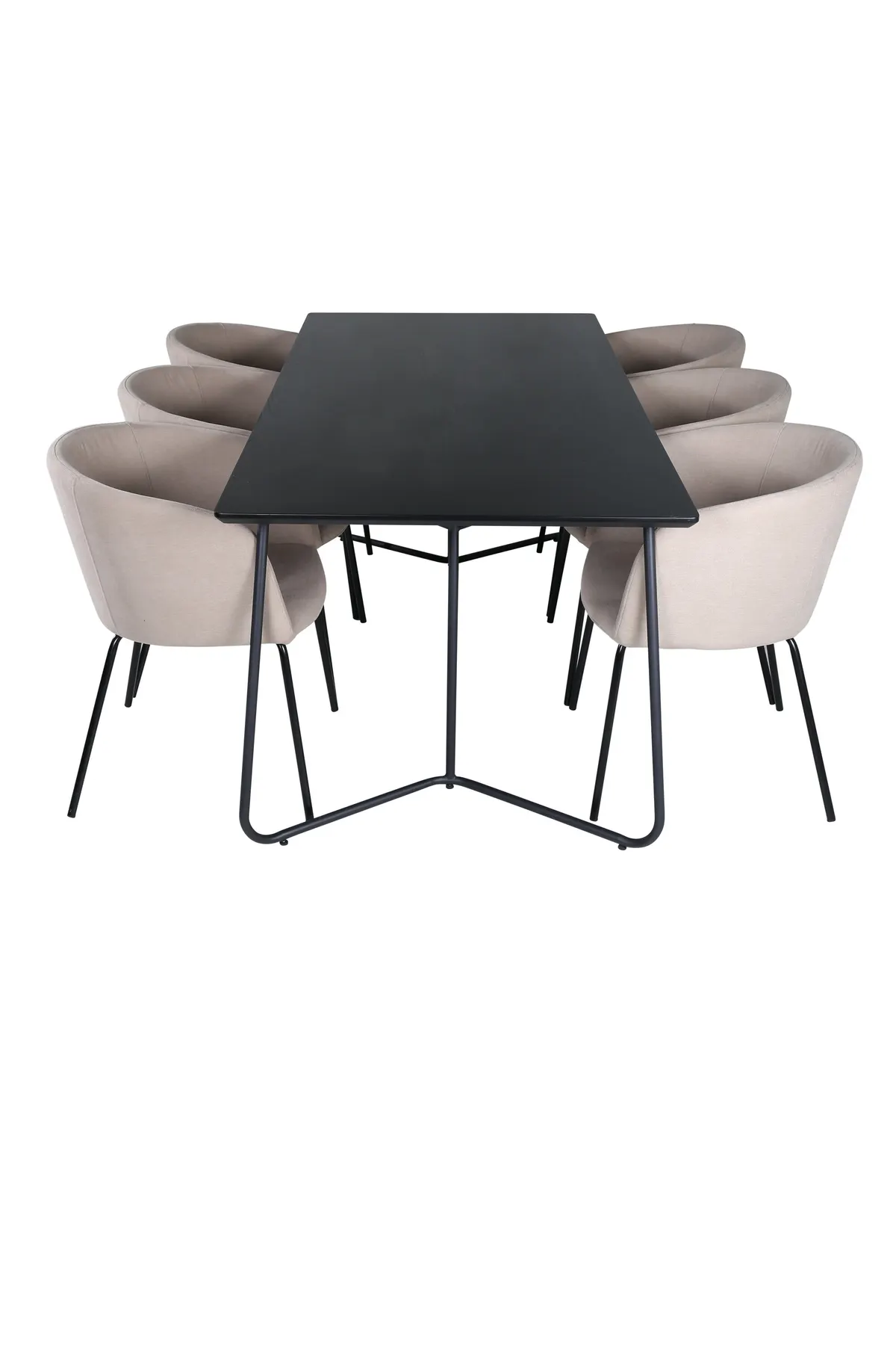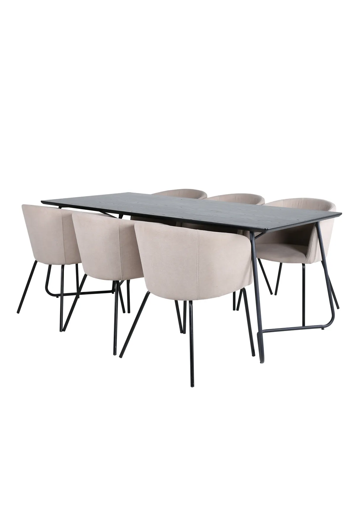 Lassen Sie sich an diesem einladenden und stilvollen Esstisch für lange Abendessen mit Familie und Freunden nieder! Esstisch Petra hat ein gut durchdachtes Design mit skandinavischen Formen, die ein stilvolles Gefühl vermitteln, schmale, leicht ausgestellte Beine aus schwarzem Eisen und eine Tischplatte aus schwarzem MDF mit Furnier. Maße des Tisches: Länge: 190cm, Breite: 90cm, Höhe: 75cm. Hier in perfekter Kombination mit 6 bequemen Esszimmerstühlen aus der Serie Berit. Die Stuhlbeine sind aus schwarzem Eisen und die Sitzfläche ist mit beigem Polyesterleinen bezogen. Stuhl Abmessungen: Höhe: 78cm, Sitzhöhe: 49cm, Breite: 55cm, Tiefe: 55cm. Eine luxuriöse und stilvolle Essgruppe, die zu langen Essensmomenten einlädt!