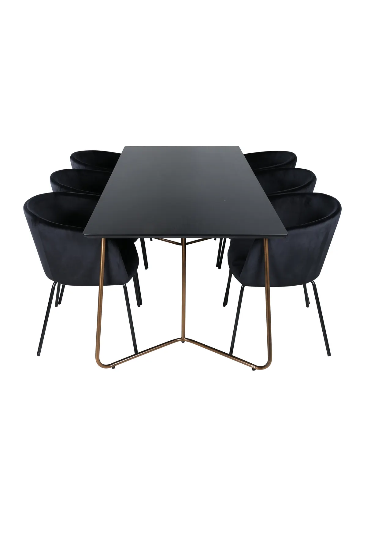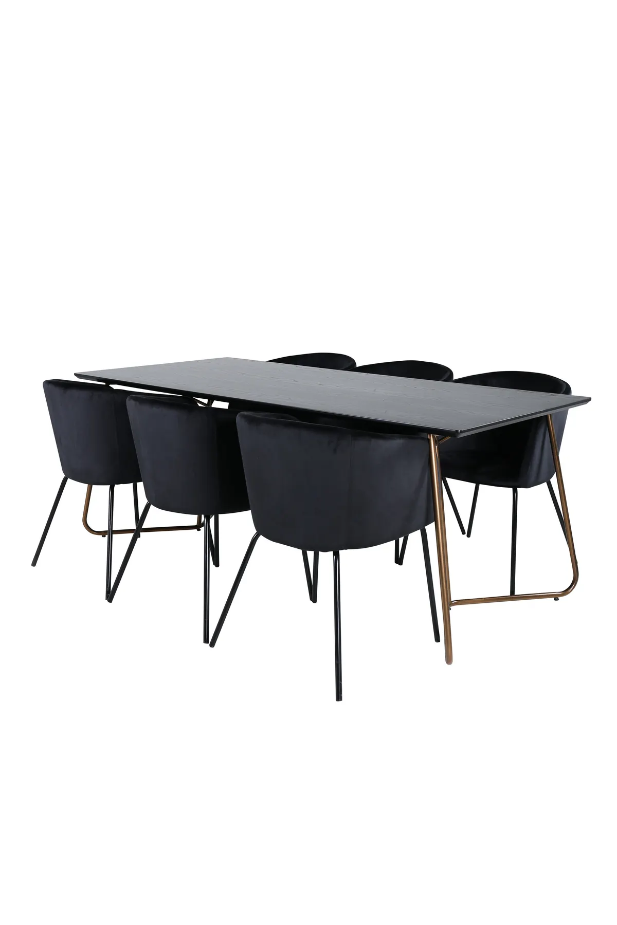 Lassen Sie sich an diesem einladenden und stilvollen Esstisch für lange Abendessen mit Familie und Freunden nieder! Esstisch Petra hat ein gut durchdachtes Design mit skandinavischen Formen, die ein stilvolles Gefühl vermitteln, schmale, leicht ausgestellte Beine aus kupferfarbenem Eisen und eine Tischplatte aus schwarzem MDF mit Furnier. Maße des Tisches: Länge: 190cm, Breite: 90cm, Höhe: 75cm. Hier in perfekter Kombination mit bequemen Esszimmerstühlen aus der Serie Berit. Die Stuhlbeine sind aus schwarzem Eisen und die Sitzfläche ist mit weichem Samtstoff bezogen. Stuhl-Maße: Höhe: 78cm, Sitzhöhe: 49cm, Breite: 55cm, Tiefe: 55cm. Eine luxuriöse und stilvolle Essgruppe, die zu langen Essensmomenten einlädt!