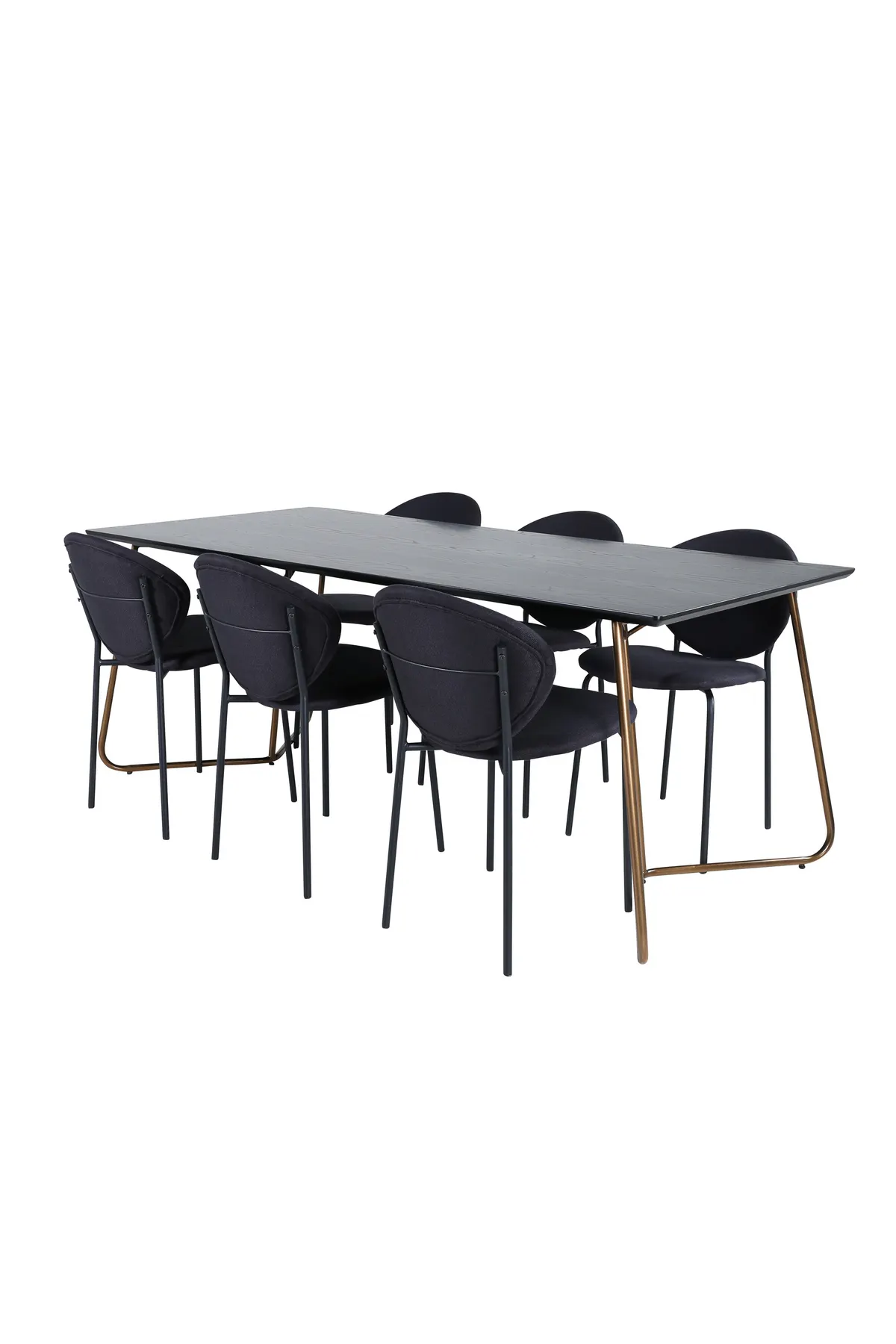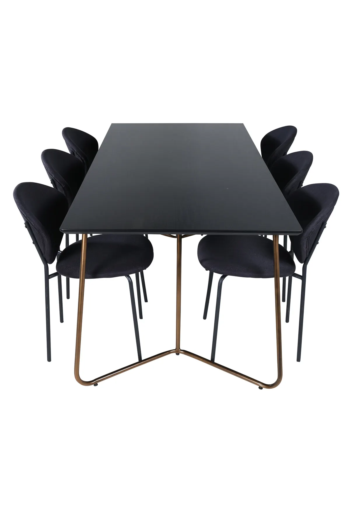 Eine freche vollschwarze Essgruppe in modernem Design! Esstisch Petra hat ein gut durchdachtes Design mit skandinavischen Formen, die ein stilvolles Gefühl, schmale, leicht ausgestellte Beine aus kupferfarbenem Eisen und eine Tischplatte aus schwarzem MDF mit Furnier geben. Maße des Tisches: Länge: 190cm, Breite: 90cm, Höhe: 75cm. Hier zusammen mit 6 Stück Esszimmerstühlen in schlichtem Design, Stuhlbeinen aus Metall und schwarzen Sitzen aus Polyester. Abmessungen der Stühle: Höhe: 80cm, Sitzhöhe: 49cm, Breite: 46cm, Tiefe: 61,5cm. Lassen Sie das Herz Ihres Zuhauses von dieser auffälligen Essgruppe schmücken.