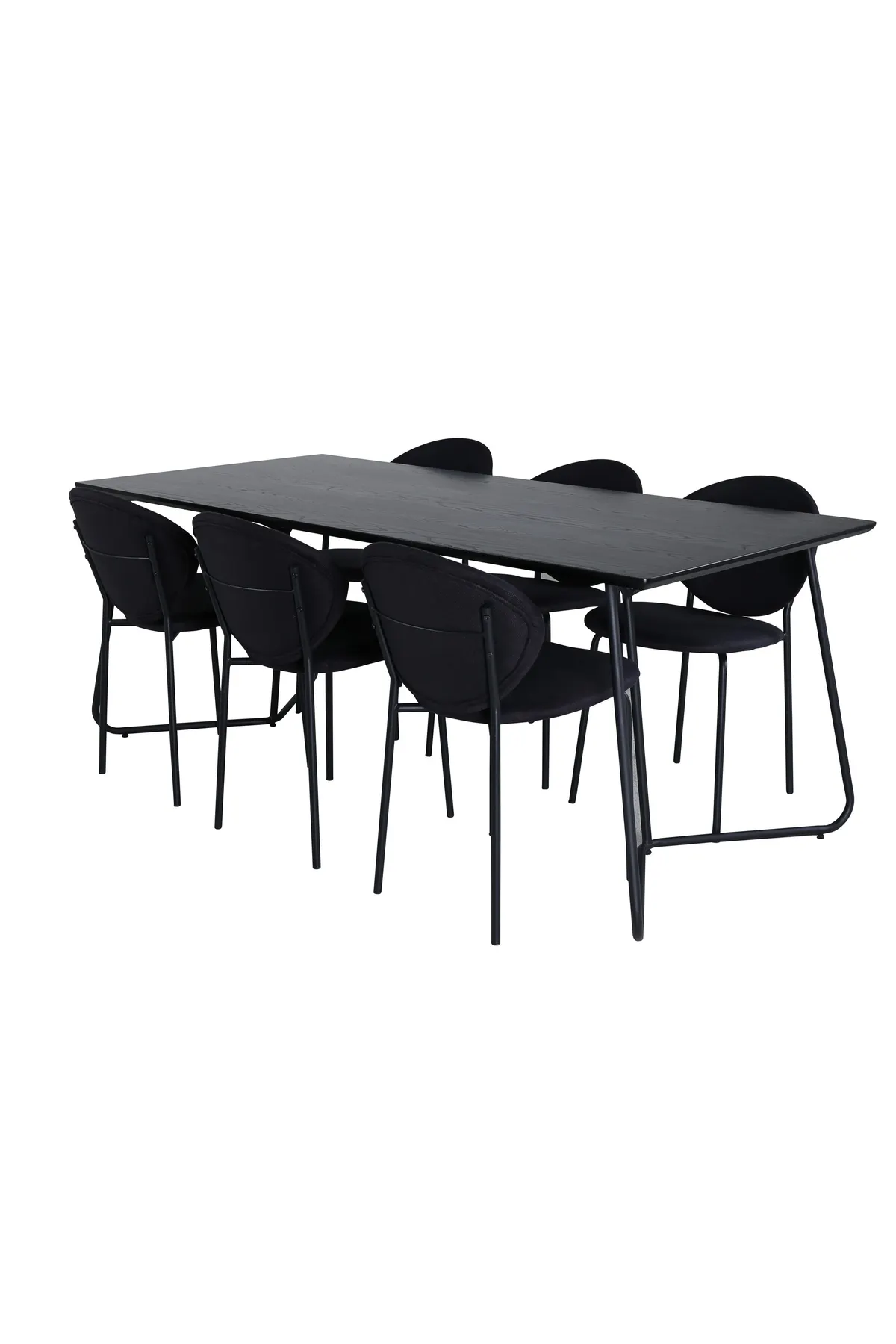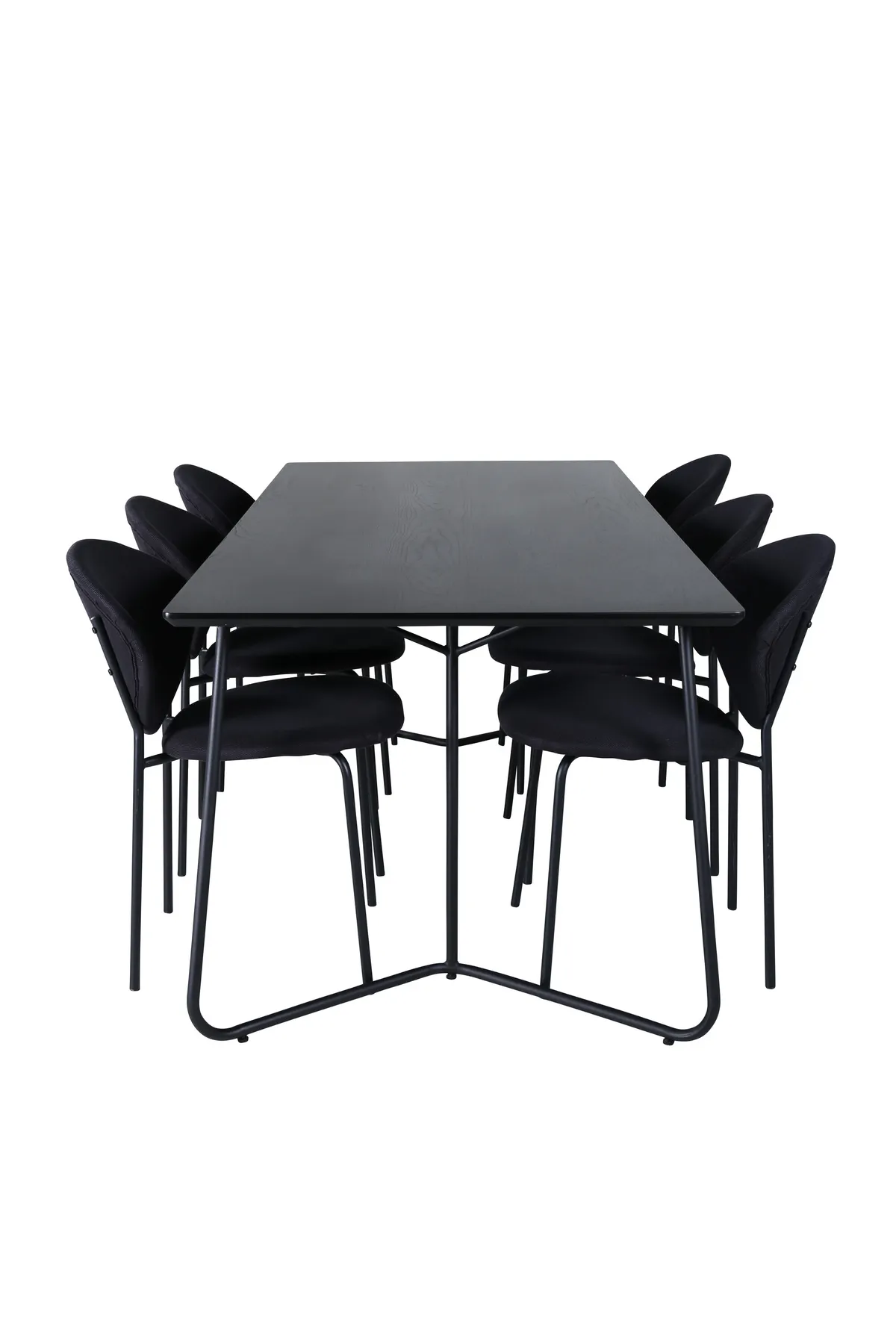 Eine freche vollschwarze Essgruppe in modernem Design! Esstisch Petra hat ein gut durchdachtes Design mit skandinavischen Formen, die ein stilvolles Gefühl, schmale, leicht ausgestellte Beine aus Eisen und eine Tischplatte aus schwarzem MDF mit Furnier geben. Maße des Tisches: Länge: 190cm, Breite: 90cm, Höhe: 75cm. Hier zusammen mit 6 Esszimmerstühlen in schlichtem Design, Stuhlbeinen aus Metall und schwarzen Sitzen aus Polyester. Abmessungen der Stühle: Höhe: 80cm, Sitzhöhe: 49cm, Breite: 46cm, Tiefe: 61,5cm. Lassen Sie das Herz Ihres Zuhauses von dieser auffälligen Essgruppe schmücken.