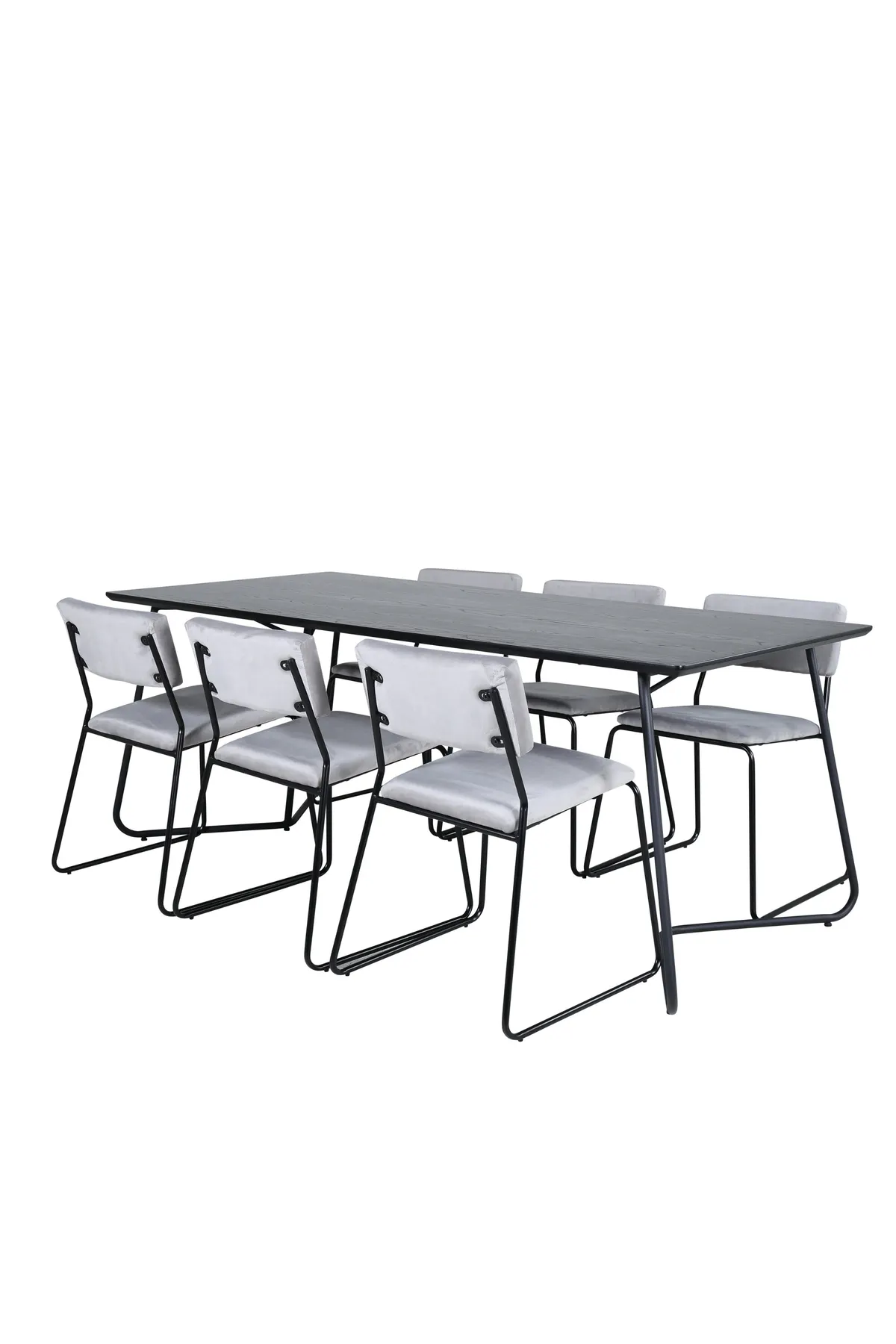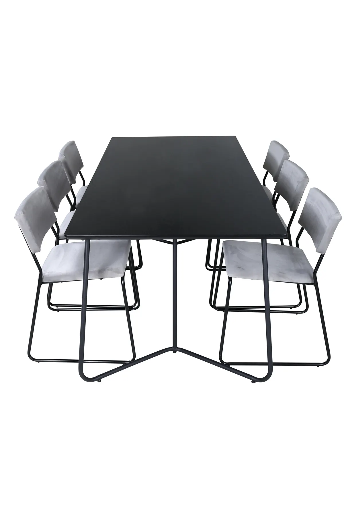 Einladend, stilvoll und zeitlos – Esstisch Petra schafft einen modebewussten Eindruck in Ihrem Zuhause! Das Design ist gut durchdacht mit skandinavischen Formen, die ein stilvolles Gefühl vermitteln, schmalen, leicht ausgestellten Beinen aus Eisen und einer Tischplatte aus schwarzem MDF mit Furnier. Maße des Tisches: Länge: 190 cm, Breite: 90 cm, Höhe: 75 cm. Hier kombiniert mit 6 Kenth Esszimmerstühlen in Grau mit Stuhlbeinen aus schwarzem Eisen und Sitzen aus weichem Samtstoff. Stuhl Abmessungen: Höhe: 76cm, Sitzhöhe: 48,5cm, Breite: 40cm, Tiefe: 52cm. Lassen Sie das Herz Ihres Zuhauses von dieser auffälligen Essgruppe schmücken!