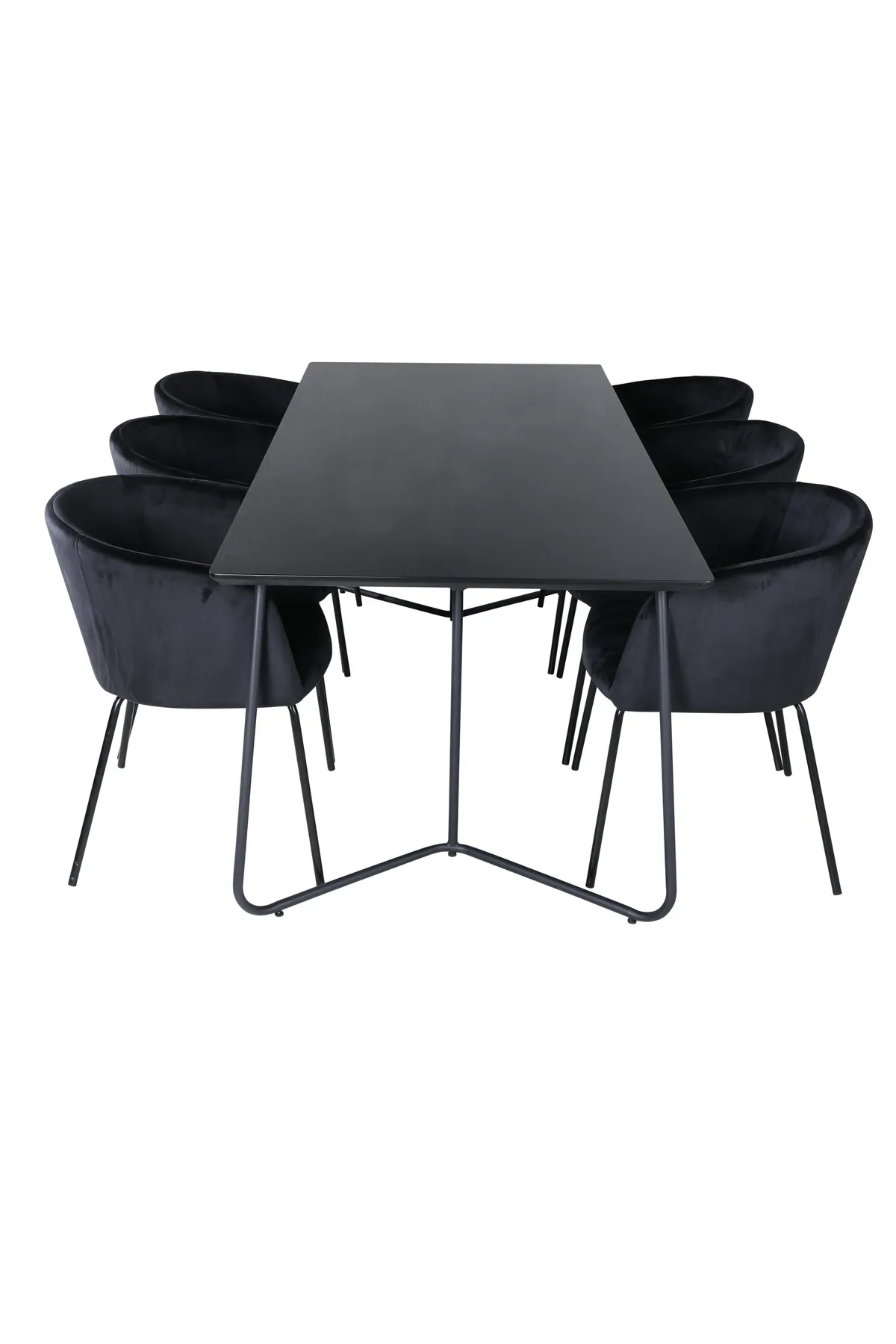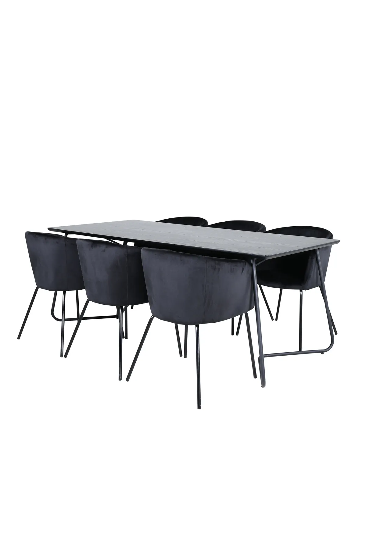 Lassen Sie sich an diesem einladenden und stilvollen Esstisch für lange Abendessen mit Familie und Freunden nieder! Esstisch Petra hat ein gut durchdachtes Design mit skandinavischen Formen, die ein stilvolles Gefühl vermitteln, schmale, leicht ausgestellte Beine aus schwarzem Eisen und eine Tischplatte aus schwarzem MDF mit Furnier. Maße des Tisches: Länge: 190cm, Breite: 90cm, Höhe: 75cm. Hier in perfekter Kombination mit 6 bequemen Esszimmerstühlen aus der Serie Berit. Die Stuhlbeine sind aus schwarzem Eisen und die vollständig bekleidete Sitzfläche aus schwarzem Samt, der dem Raum einen herrlichen Glanz verleiht. Maße des Stuhls: Höhe: 78cm, Sitzhöhe: 49cm, Breite: 55cm, Tiefe: 55cm. Eine luxuriöse und stilvolle Essgruppe, die zu langen Dinner-Momenten einlädt!