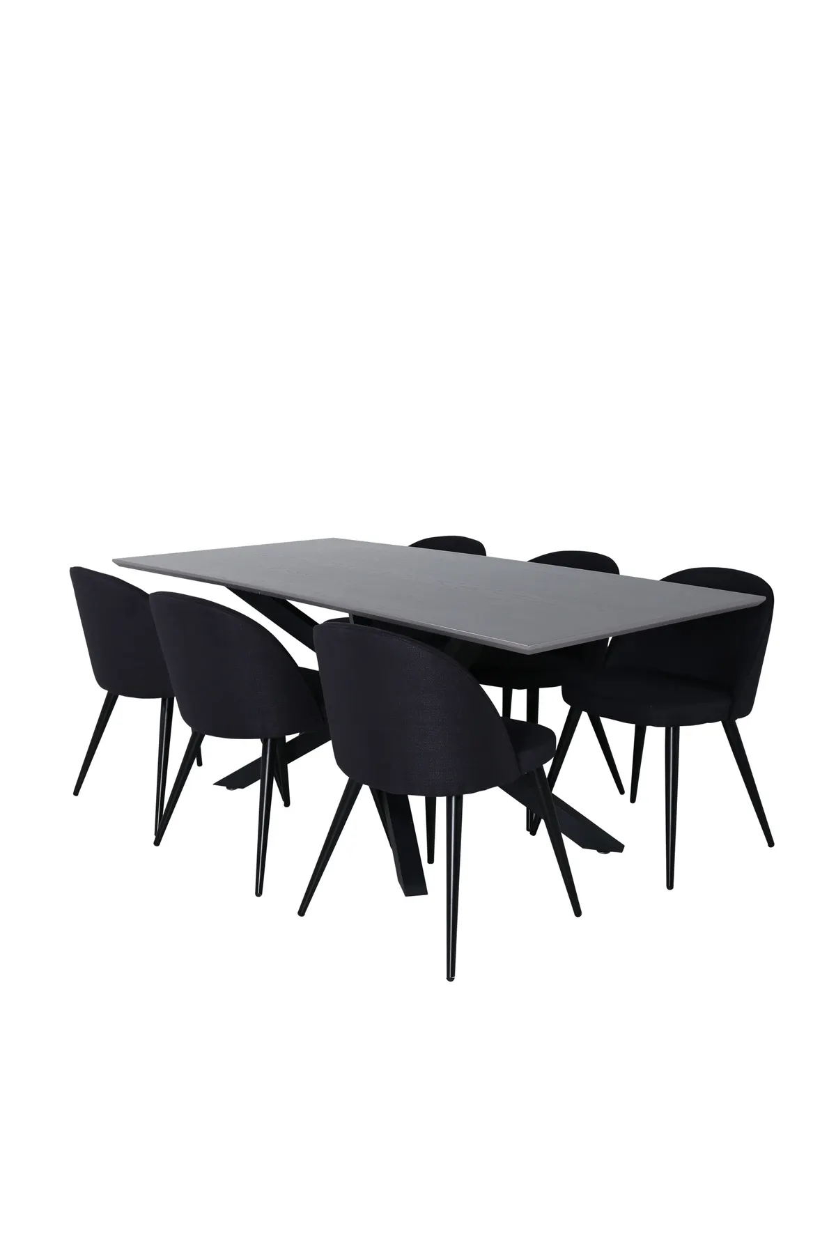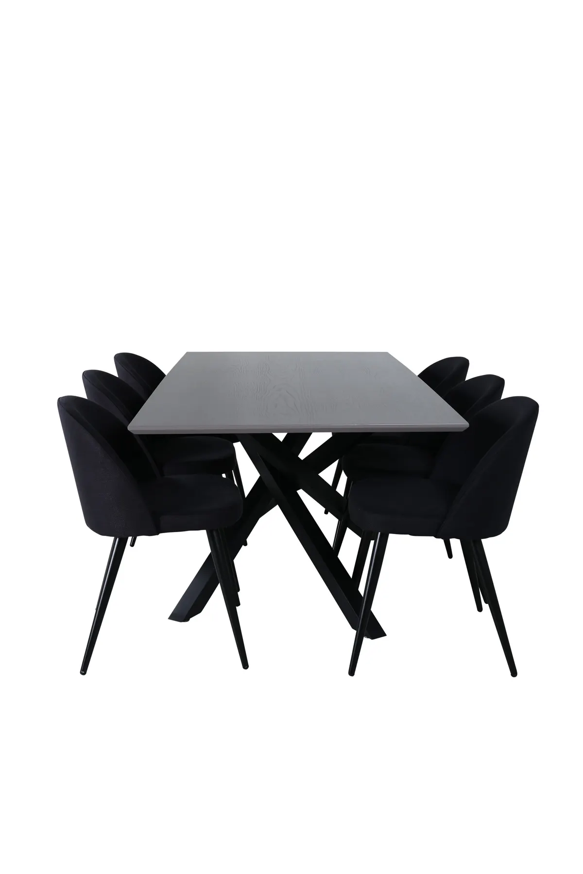 Schmücken Sie das Herz Ihres Zuhauses mit unserem Designtisch Piazza und genießen Sie angenehme Mahlzeiten! Piazza ist ein rechteckiger Tisch mit einer grauen Tischplatte aus MDF und hat ein dekoratives Gestell mit schwarzen Eisen-Kreuzbeinen, die einen ständigen Blickfang bilden. Tischabmessungen: Länge: 190cm, Breite: 90cm, Höhe: 76cm. Hier zusammen mit 6 Samt-Esszimmerstühlen in schwarzem Polyester und ausgestellten Metall-Stuhlbeinen. Maße der Stühle: Höhe: 76,5cm, Sitzhöhe: 46,5cm, Breite: 50cm, Tiefe: 57cm. Richten Sie sich für Goldrand im Alltag ein – es soll sich schön anfühlen, nach Hause zu kommen!