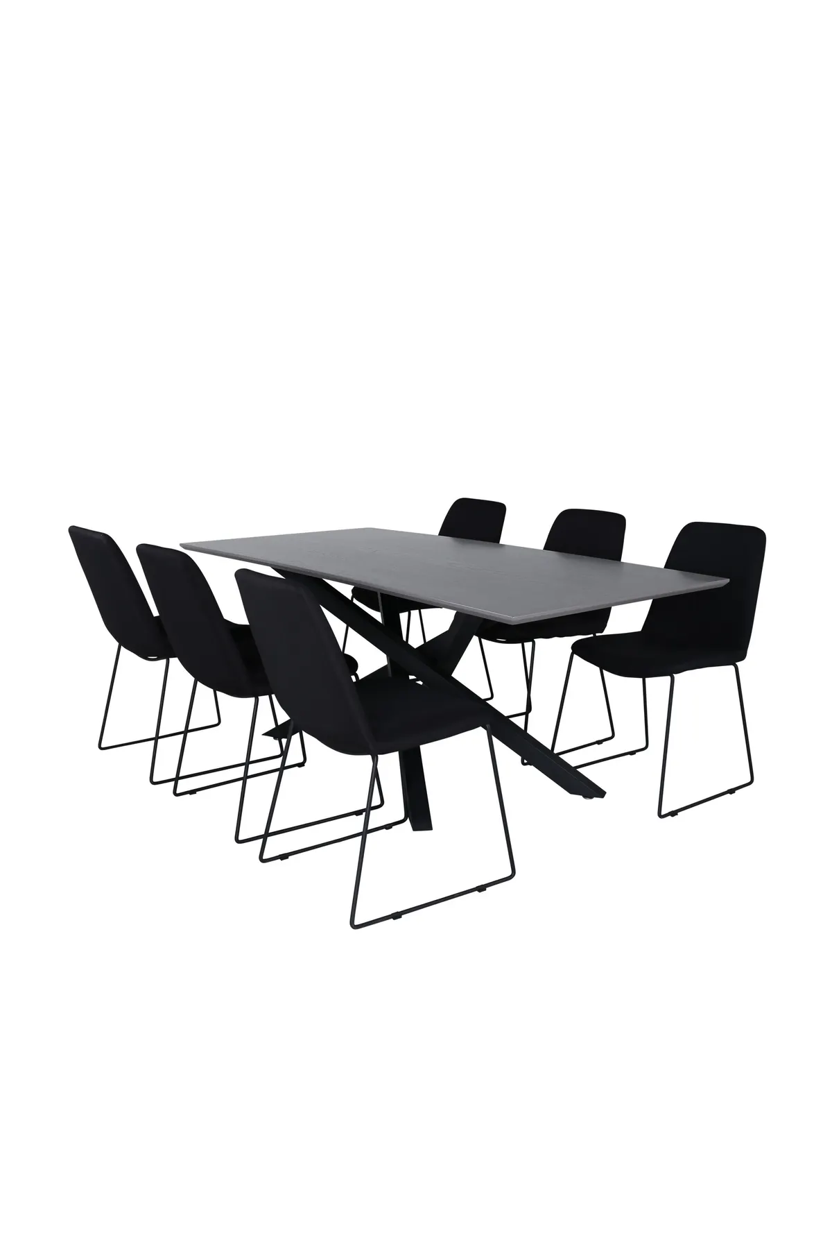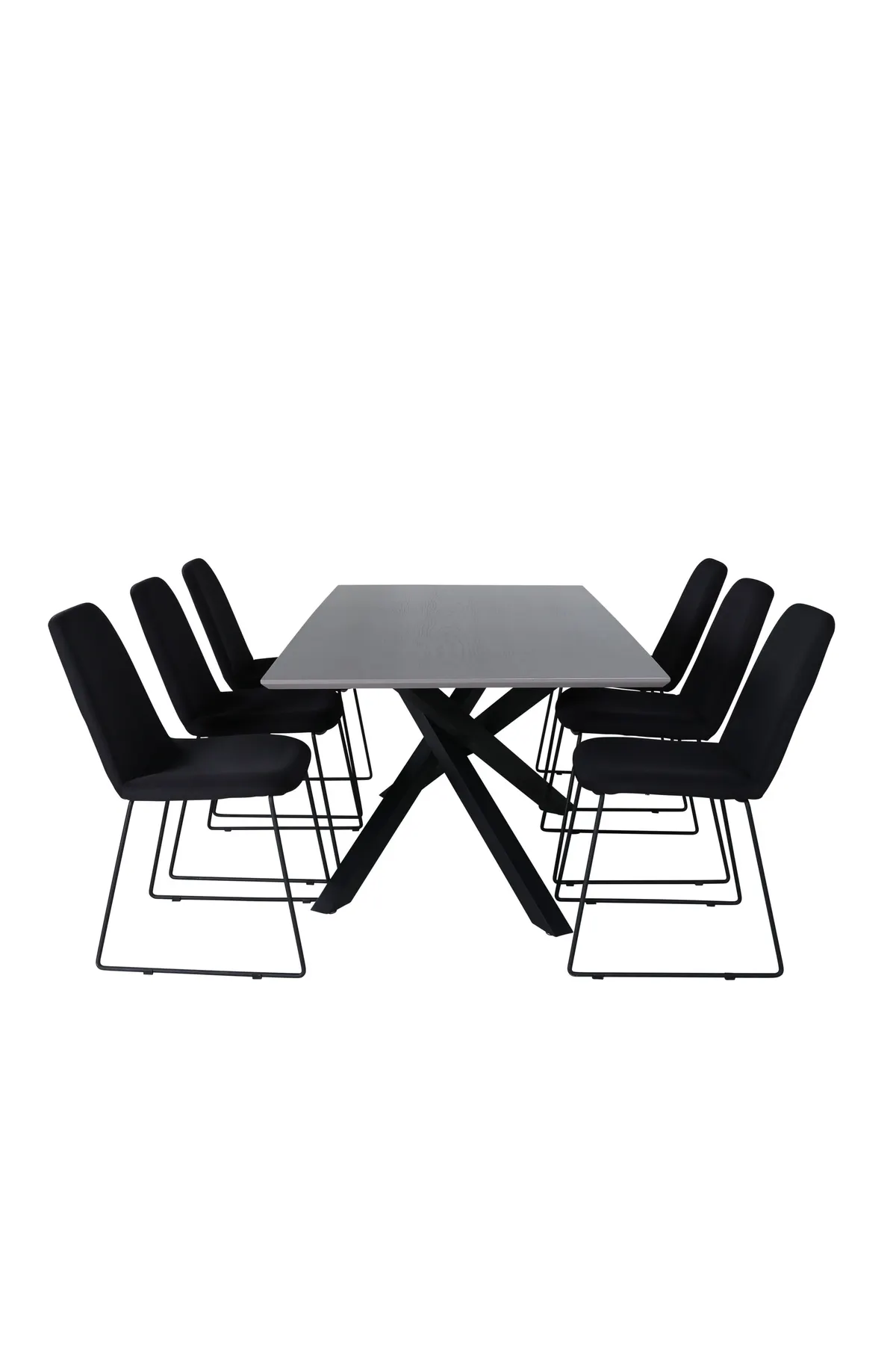 Piazza, unser beliebter rechteckiger Esstisch mit luxuriöser Ausstrahlung und trendigen Details im Design. Die Tischplatte in grauer Farbe ist aus MDF gefertigt. Der Körper hat einen köstlichen Blick mit gekreuzten Beinen in schwarzem Eisen, die einen ständigen Blickfang schafft. Tischabmessungen: Länge: 190cm, Breite: 90cm, Höhe: 76cm. Passend dazu gibt es 6 schwarze Muce-Esszimmerstühle, deren schmale Eisenbeine einen luftigen Eindruck vermitteln und deren weiche Sitzfläche aus Polyester für hohen Komfort sorgt. Maße der Stühle: Höhe: 84cm, Sitzhöhe: 47cm, Breite: 43cm, Tiefe: 63cm. Richten Sie sich für Goldrand im Alltag ein – es soll sich schön anfühlen, nach Hause zu kommen!