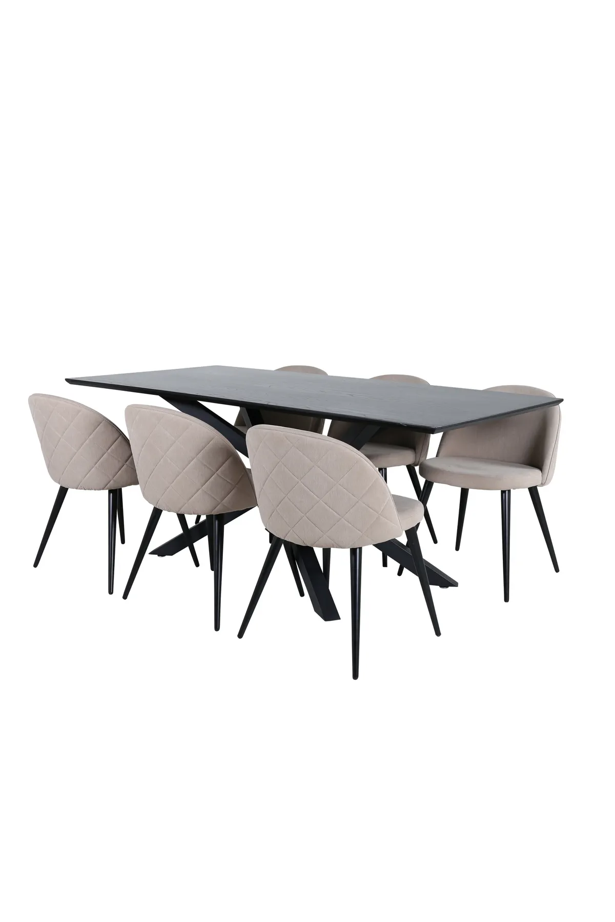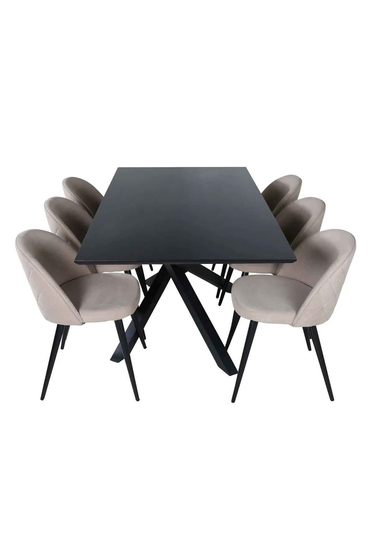 Schaffen Sie eine wohnliche Atmosphäre mit einer charmanten Essgruppe! Piazza ist unser beliebter rechteckiger Esstisch mit luxuriöser Ausstrahlung und trendigen Details im Design. Die Tischplatte ist aus MDF-Furnieren in schwarzer Farbe gefertigt und der Korpus bildet mit den gekreuzten Beinen aus schwarzem Eisen einen ständigen Blickfang. Hier in köstlicher Kombination mit Esszimmerstühlen aus der Serie Velvet Stitches, die zu einem schönen Ganzen im Wohnzimmer beitragen. Die Stuhlbeine sind leicht ausgestellt in schwarzem Eisen und die beigen Sitze sind in Polyster-Leinen. Genießen Sie angenehme Mahlzeiten!