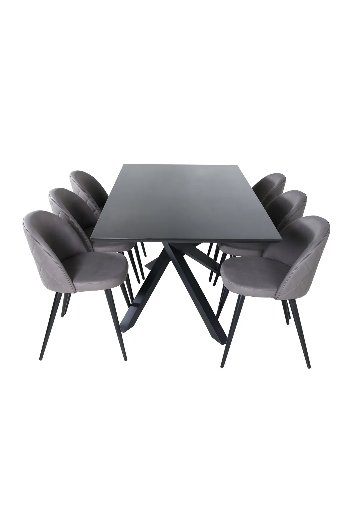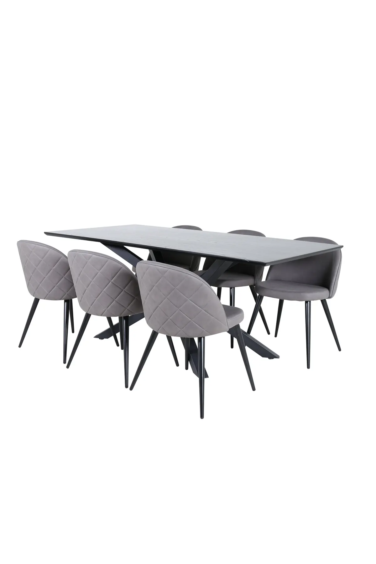 Eine charmante Essgruppe mit köstlichem Design! Piazza ist unser beliebter rechteckiger Esstisch mit luxuriöser Ausstrahlung und trendigen Details im Design. Die Tischplatte ist aus MDF-Furnieren in schwarzer Farbe gefertigt und der Korpus bildet mit den gekreuzten Beinen aus schwarzem Eisen einen ständigen Blickfang. Hier in köstlicher Kombination mit Esszimmerstühlen aus der Serie Velvet Stitches, die zu einem schönen Ganzen im Wohnzimmer beitragen. Die Stuhlbeine sind leicht ausgestellt in schwarzem Eisen und die Sitze sind vollständig mit grauer Mikrofaser überzogen. Sitzen Sie bequem in Ihrem Zuhause!