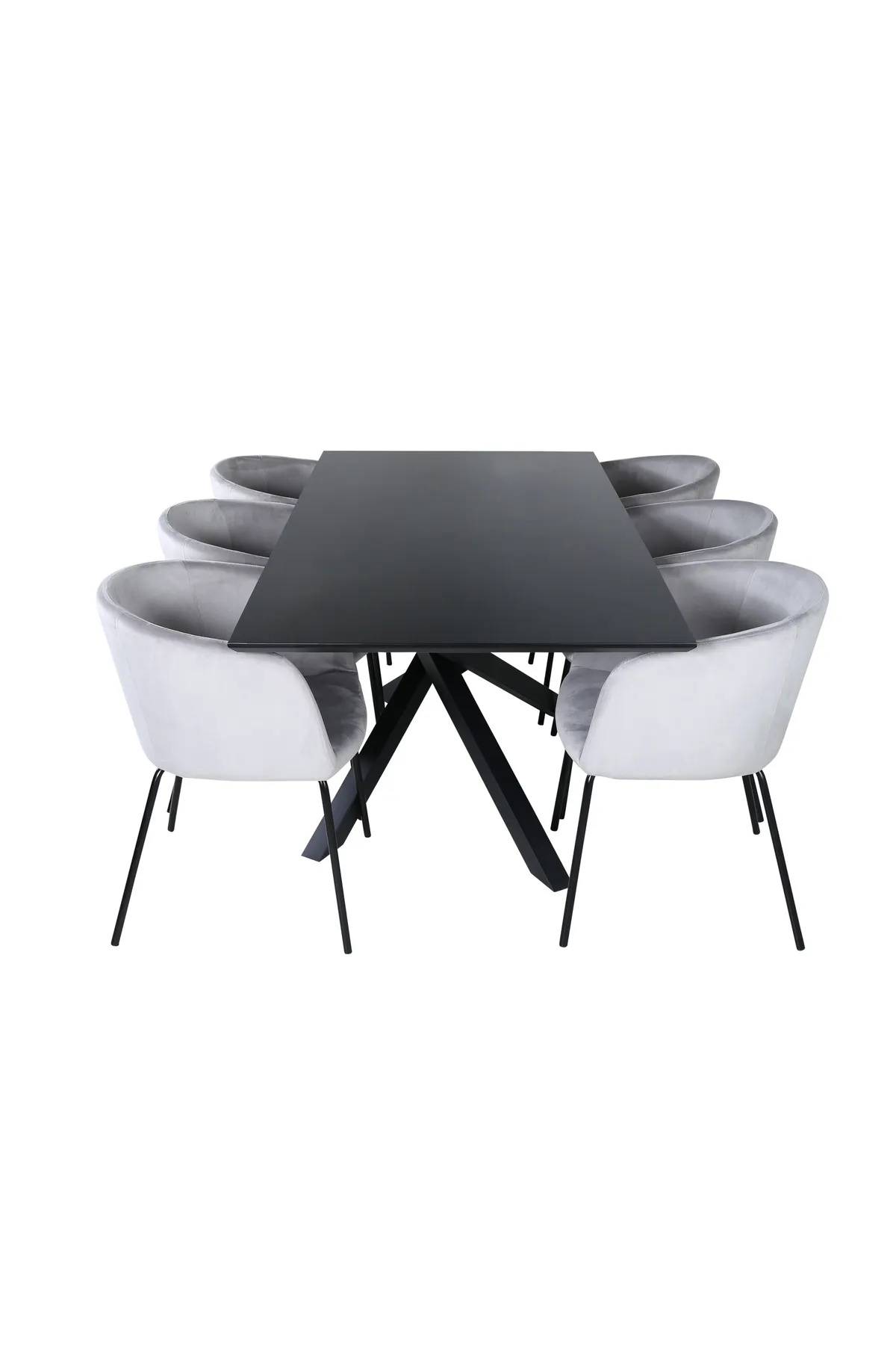 Richten Sie sich einladend ein und schaffen Sie einen stilvollen Look in Ihrem Zuhause! Piazza ist unser beliebter rechteckiger Esstisch mit luxuriöser Ausstrahlung und trendigen Details im Design. Die Tischplatte ist aus MDF-Furnieren in schwarzer Farbe gefertigt und der Korpus bildet mit den gekreuzten Beinen aus schwarzem Eisen einen steten Blickfang. Hier in wunderbarer Kombination mit unseren eleganten Esszimmerstühlen aus der Serie Berit. Der Stuhl hat ein luxuriöses Design in grauem Samtstoff und die Stuhlbeine sind stilvoll schmal in schwarzem Eisen. Sitzen Sie bequem und genießen Sie angenehme Mahlzeiten!