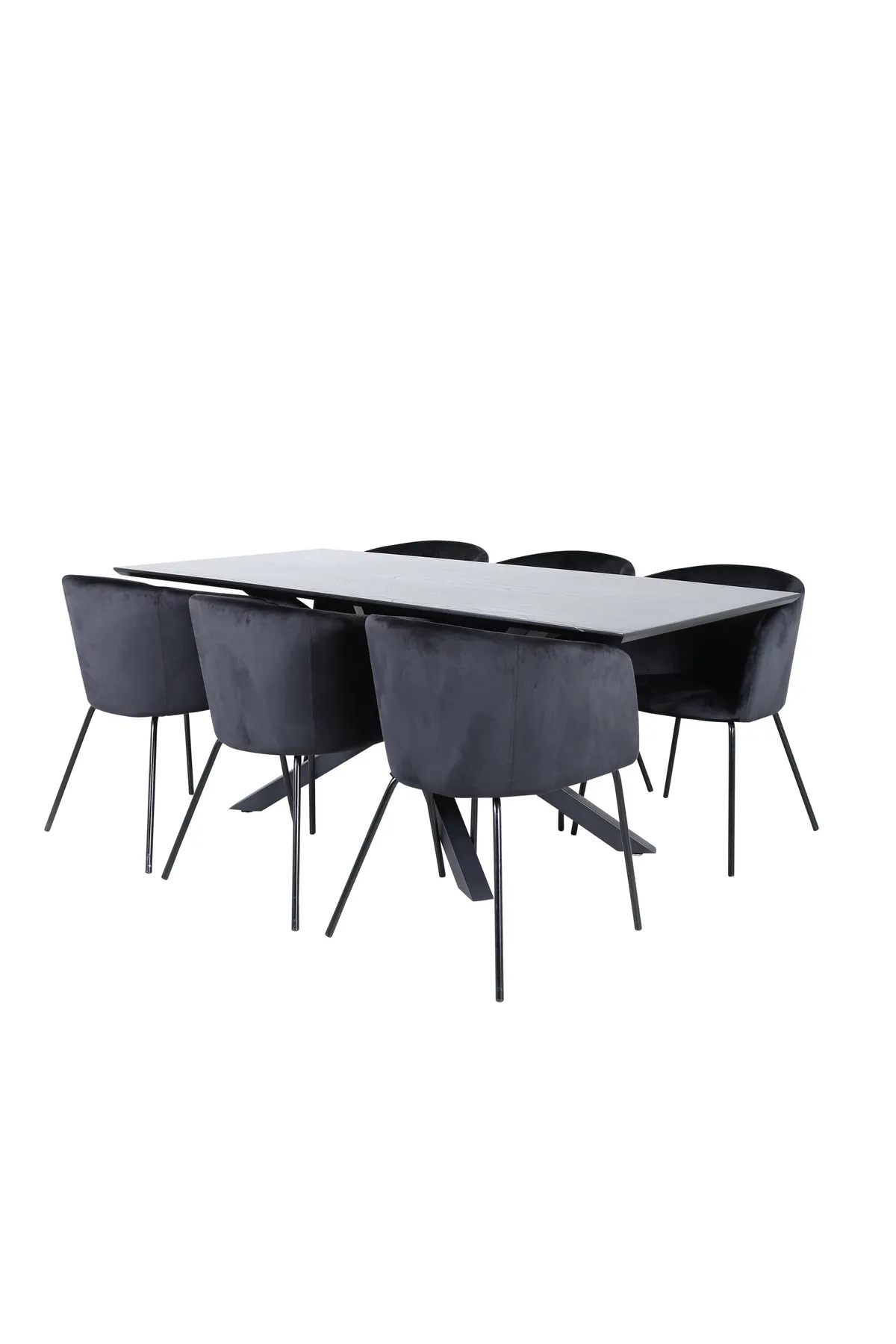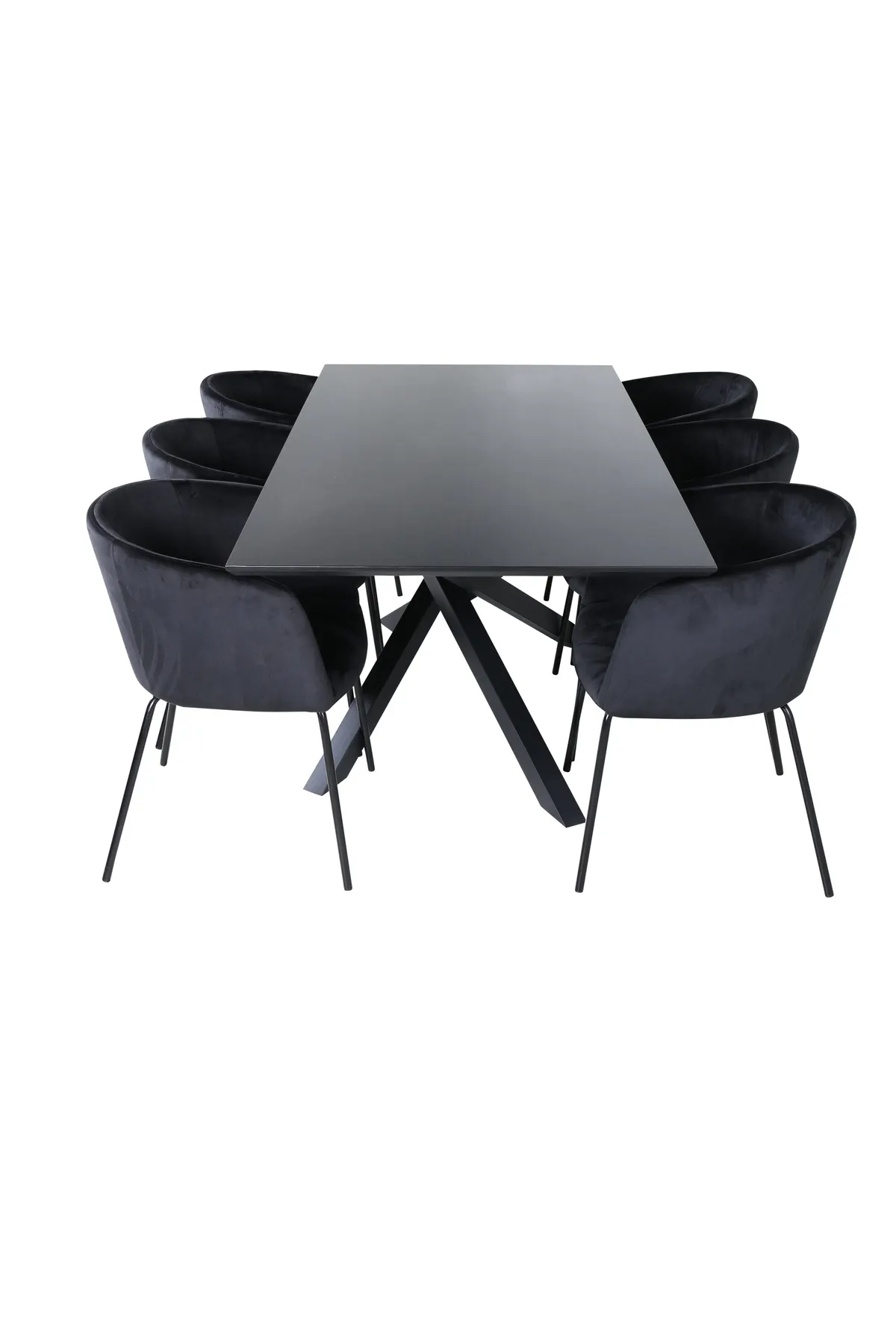 Eine trendige Essgruppe, bei der jeder richtig liegt! Piazza ist unser beliebter rechteckiger Esstisch mit luxuriöser Ausstrahlung und trendigen Details im Design. Die Tischplatte ist aus MDF-Furnieren in schwarzer Farbe gefertigt und der Korpus bildet mit den gekreuzten Beinen aus schwarzem Eisen einen steten Blickfang. Hier in wunderbarer Kombination mit unseren eleganten Esszimmerstühlen aus der Serie Berit. Der Stuhl hat ein luxuriöses Design in schwarzem Samtstoff und die Stuhlbeine sind stilvoll schmal in schwarzem Eisen. Richten Sie sich einladend ein und schaffen Sie einen stilvollen Look in Ihrem Zuhause!
