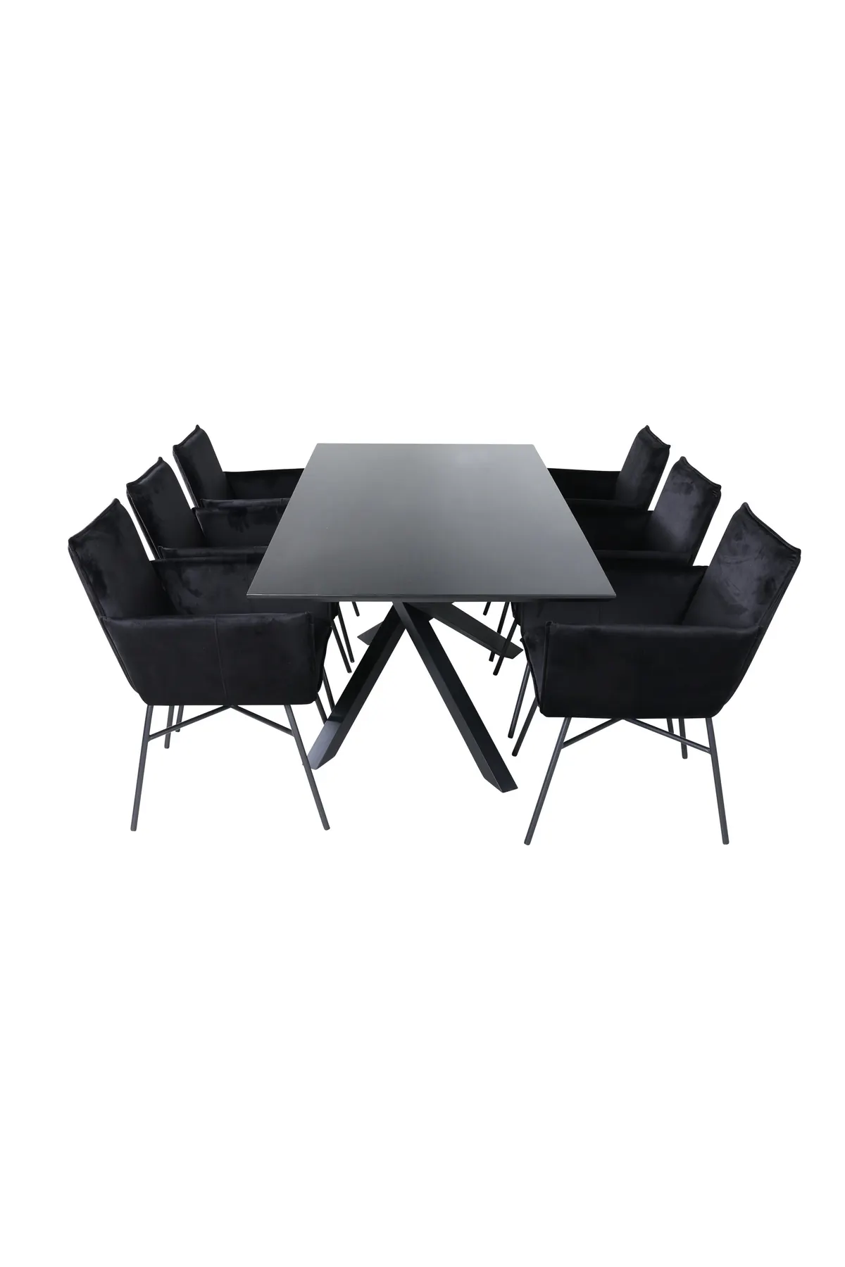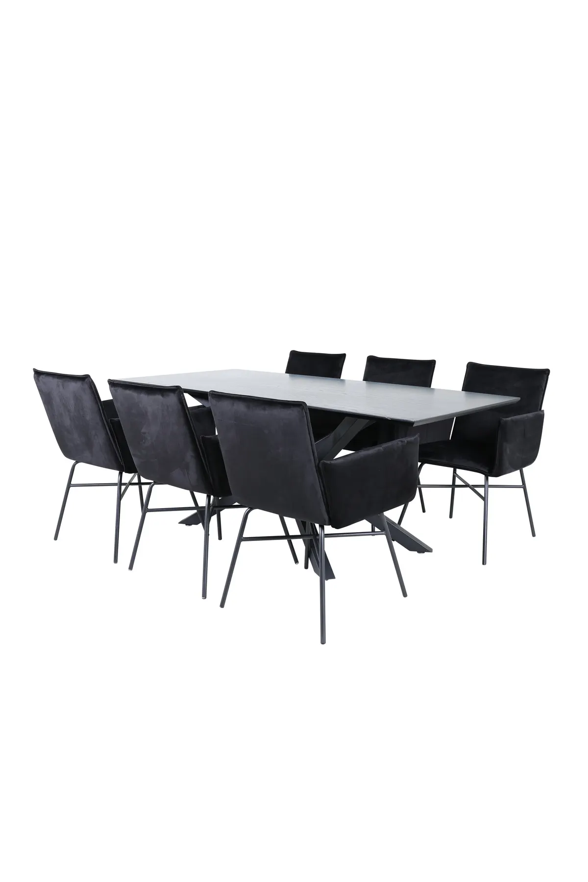 Stilvoll, komfortabel und elegant – was kann man sich mehr wünschen? Piazza ist unser beliebter rechteckiger Esstisch mit luxuriöser Ausstrahlung und trendigen Details im Design. Die Tischplatte ist aus MDF-Furnieren in schwarzer Farbe gefertigt und der Korpus bildet mit den gekreuzten Beinen aus schwarzem Eisen einen ständigen Blickfang. Hier zusammen mit unseren tollen Esszimmerstühlen Petra. Die Stühle haben eine bequeme Sitztiefe, die Stuhlbeine sind stilvoll schmal in Eisen und der Sitz ist in schwarzem Samtstoff, der dem Raum einen schönen Glanz verleiht. Genießen Sie in Zukunft angenehme Mahlzeiten!