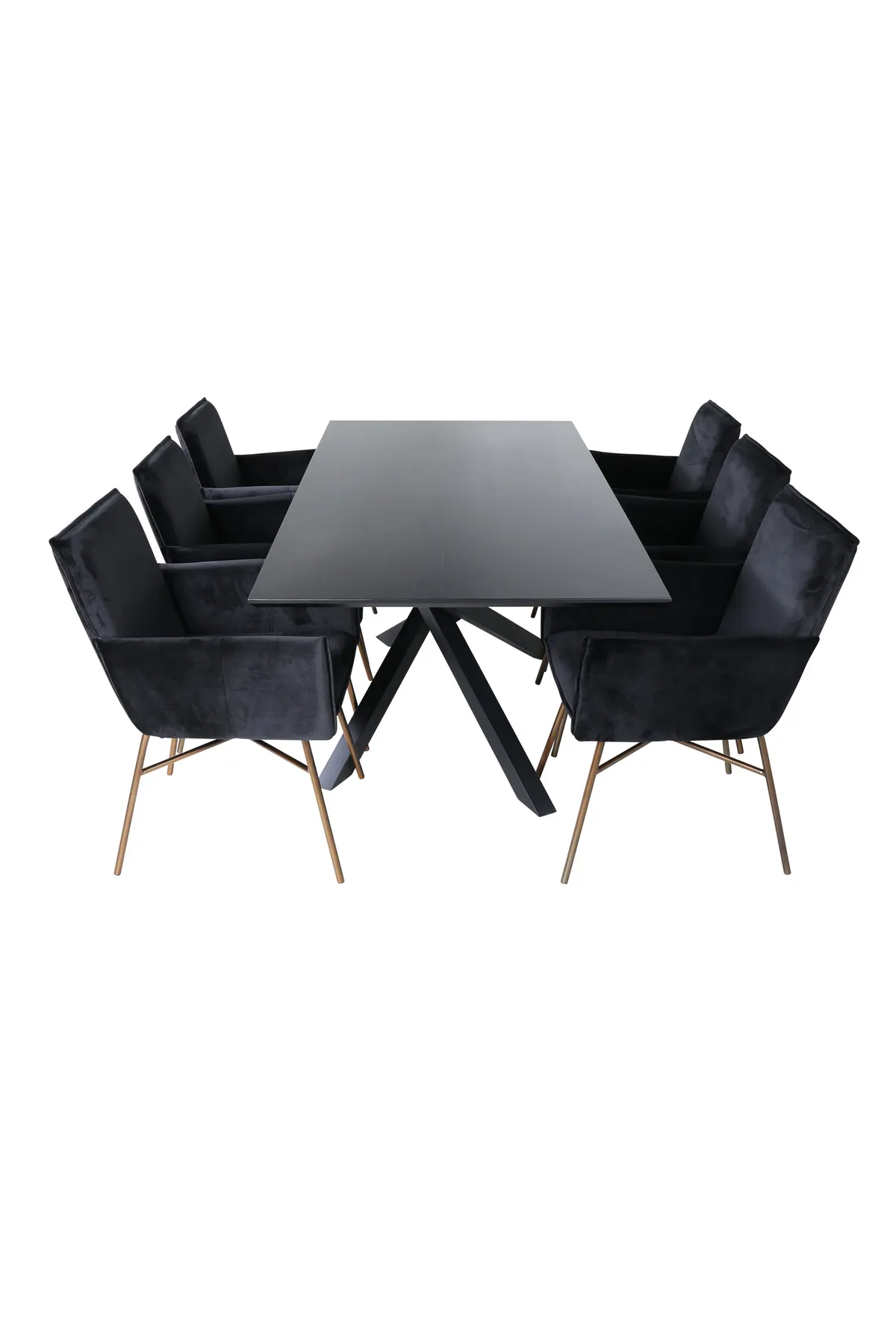 Stilvoll, komfortabel und elegant – was kann man sich mehr wünschen? Piazza ist unser beliebter rechteckiger Esstisch mit luxuriöser Ausstrahlung und trendigen Details im Design. Die Tischplatte ist aus MDF-Furnieren in schwarzer Farbe gefertigt und der Korpus bildet mit den gekreuzten Beinen aus schwarzem Eisen einen ständigen Blickfang. Hier zusammen mit unseren tollen Esszimmerstühlen Petra. Die Stühle haben eine bequeme Sitztiefe, die Stuhlbeine sind stilvoll schmal in kupferfarbenem Eisen und die Sitzfläche ist in schwarzem Samtstoff, der dem Raum einen schönen Glanz verleiht. Genießen Sie angenehme Mahlzeiten in Zukunft!