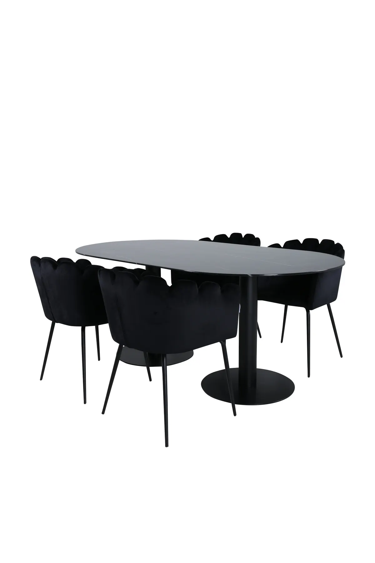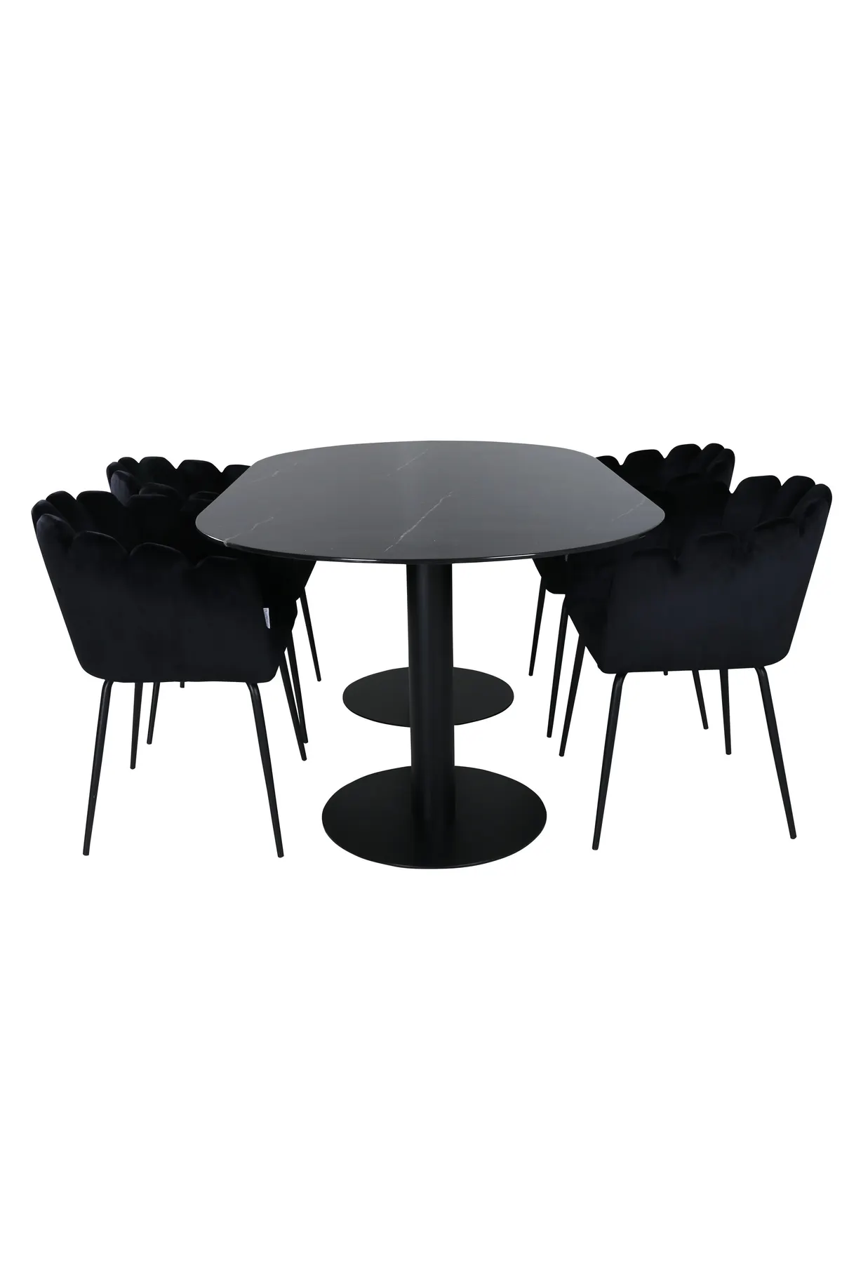 Schaffen Sie eine angenehme Atmosphäre im Wohnzimmer und heben Sie den Einrichtungsstil auf die nächste Stufe! Der Esstisch Pillan besticht durch sein elegantes Design und seine einladende, ovale Form. Das Gesamtdesign ist sehr gut durchdacht mit einer dünnen Tischplatte aus schwarzem Marmorglas und zwei stabilen Tischbeinen aus schwarzem Metall. Tischabmessungen: Länge: 180cm, Breite: 100cm, Höhe: 74cm. Hier zusammen mit 4 Limhamn-Esszimmerstühlen, die mindestens genauso bequem sind wie gut aussehen! Die Sitzfläche und die Rückenlehne sind aus feinem schwarzem Samtstoff und die Stuhlbeine aus pulverbeschichtetem Metall. Maße der Stühle: Höhe: 76,56cm, Sitzhöhe: 48cm, Breite: 61cm, Tiefe: 54cm.