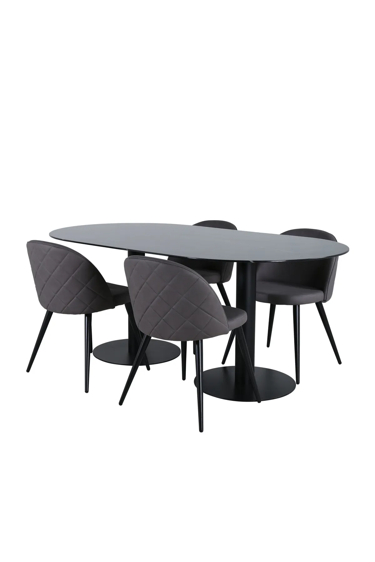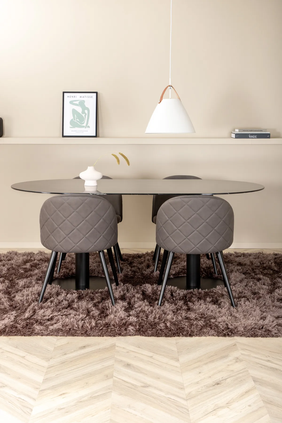 Ebenso stilvoll wie einladend – Esstisch Pillan schafft einen modebewussten Eindruck und eine angenehme Atmosphäre in Ihrem Zuhause! Die ovale Form und das Gesamtdesign sind gut durchdacht mit einer dünnen Tischplatte aus schwarzem Marmorglas und zwei stabilen Tischbeinen aus schwarzem Metall. Tischabmessungen: Länge: 180cm, Breite: 100cm, Höhe: 74cm. Hier zusammen mit 4 unserer ausgefallenen Esszimmerstühle Velvet in beigem Polyesterleinen und schmalen Stuhlbeinen aus Eisen. Abmessungen der Stühle: Höhe: 76,5cm, Sitzhöhe: 46,5cm, Breite: 50cm, Tiefe: 57cm. Der hohe Sitzkomfort der Stühle lädt zu langen und schönen Momenten der Geselligkeit ein!