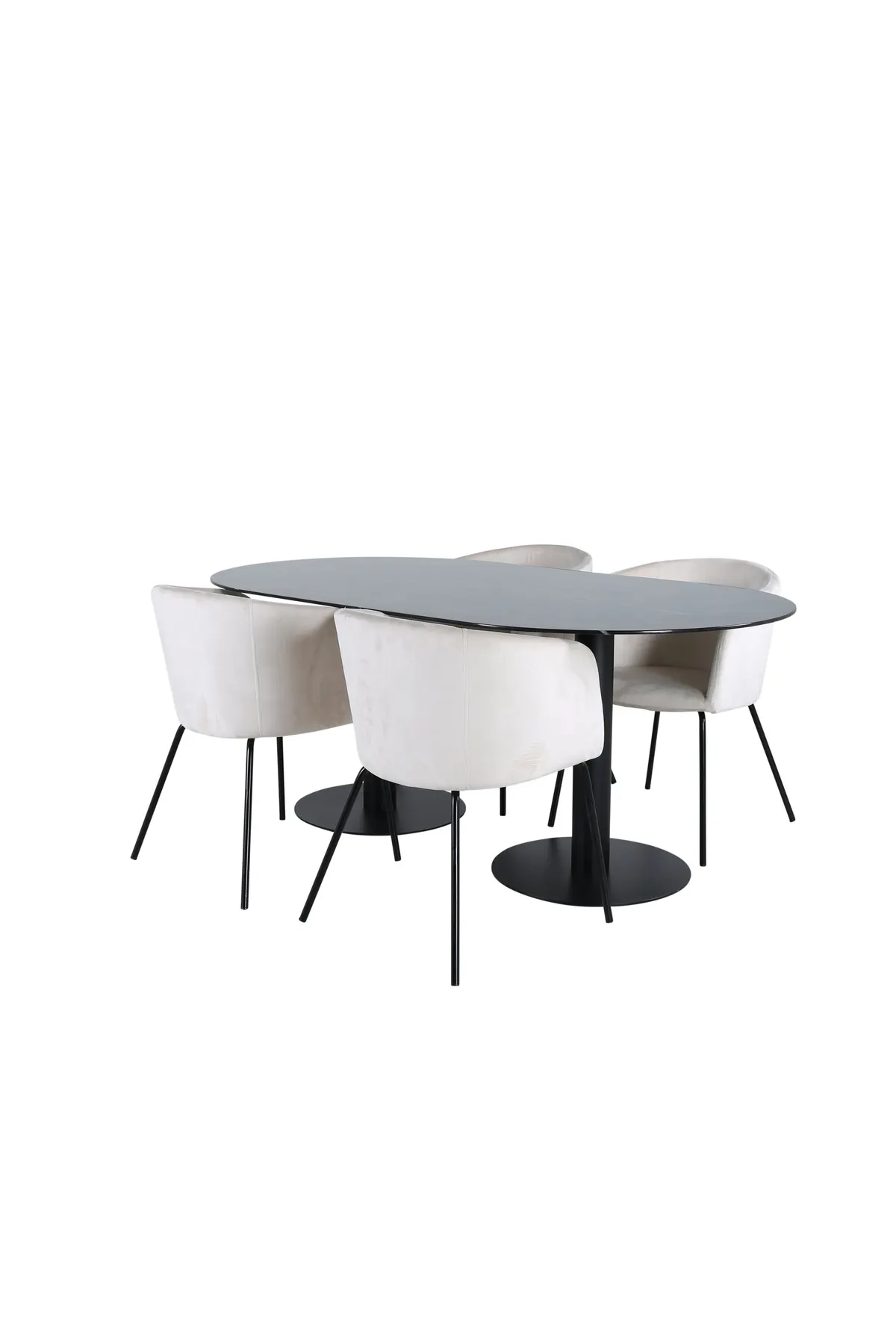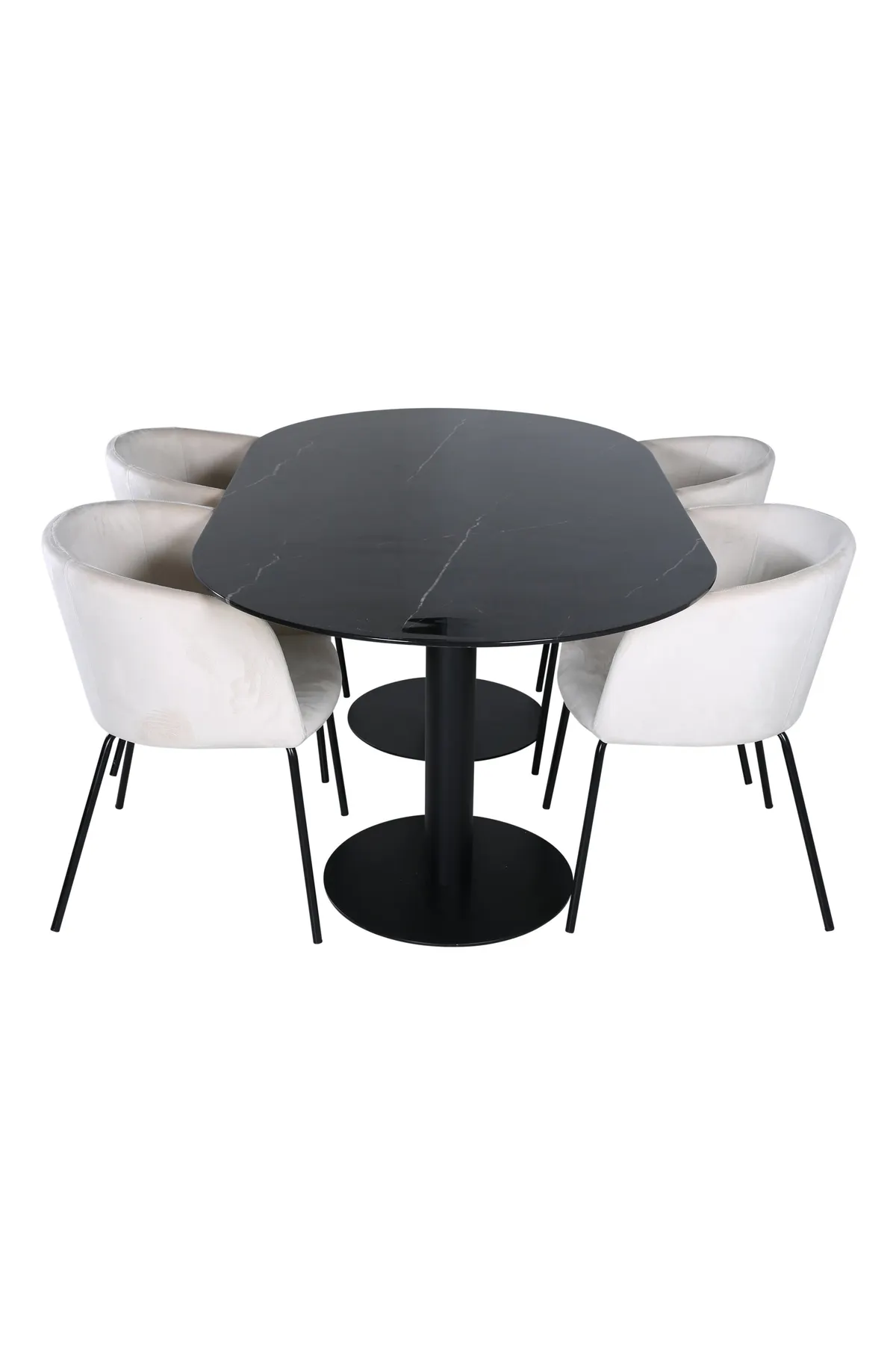 Stilvoll, luxuriös und einladend – der Esstisch Pillan schafft einen modebewussten Eindruck und eine angenehme Atmosphäre in Ihrem Zuhause! Die ovale Form und das Gesamtdesign sind gut durchdacht mit einer dünnen Tischplatte aus schwarzem Marmorglas und zwei stabilen Tischbeinen aus schwarzem Metall. Tischabmessungen: Länge: 180cm, Breite: 100cm, Höhe: 74cm. Hier zusammen mit 4 unserer pompösen Esszimmerstühle Berit in beigem Samt und schmalen Stuhlbeinen in Eisen. Stuhl Maße: Höhe: 78cm, Sitzhöhe: 49cm, Breite: 55cm, Tiefe: 55cm. Der hohe Sitzkomfort der Stühle lädt zu langen und schönen Momenten der Geselligkeit ein!