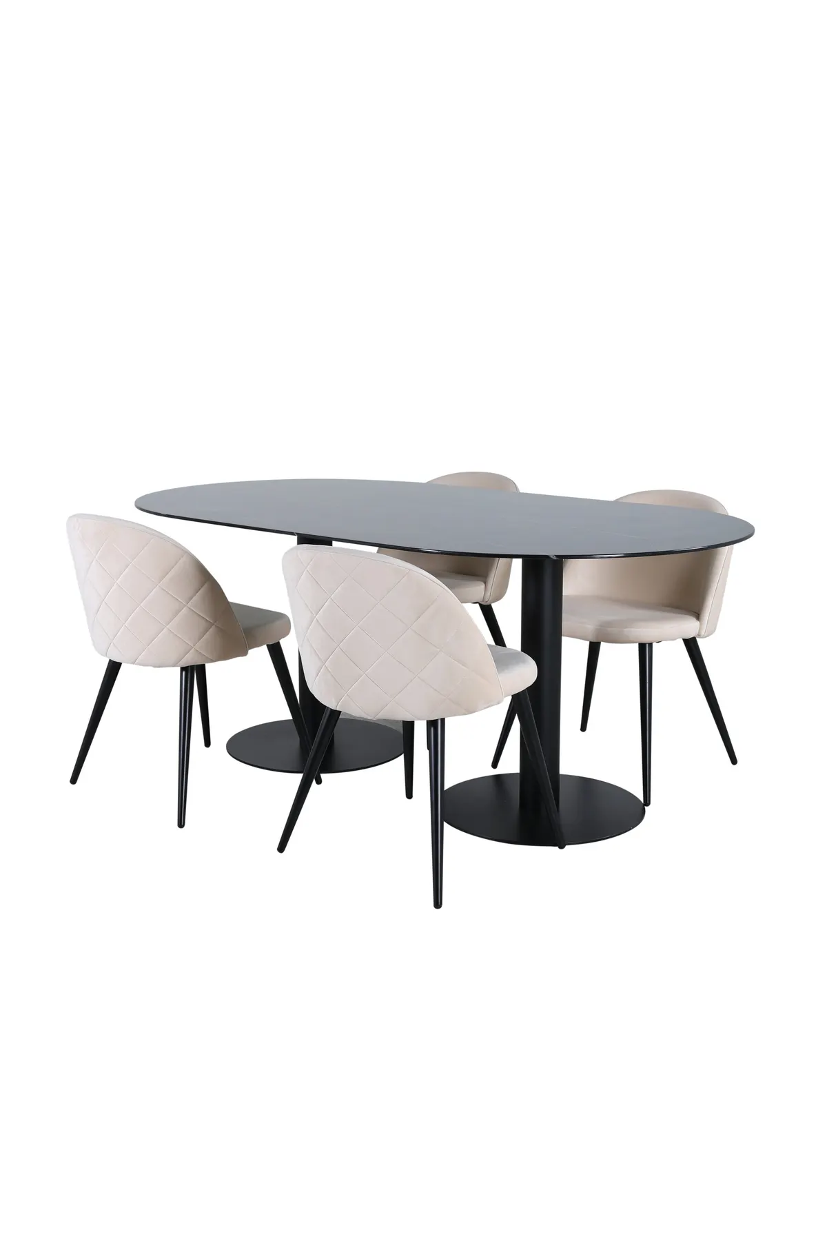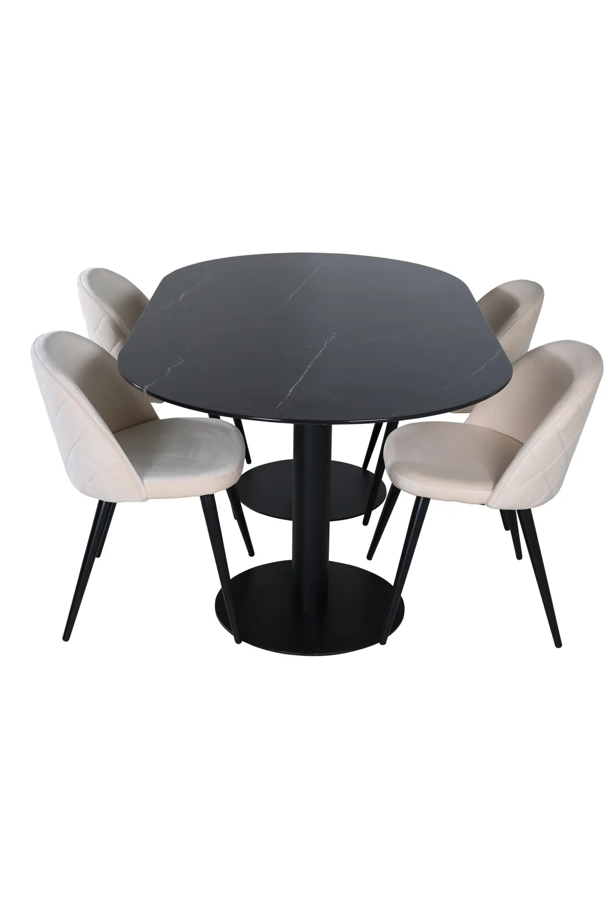 Ebenso stilvoll wie einladend – Esstisch Pillan schafft einen modebewussten Eindruck und eine angenehme Atmosphäre in Ihrem Zuhause! Die ovale Form und das Gesamtdesign sind gut durchdacht mit einer dünnen Tischplatte aus schwarzem Marmorglas und zwei stabilen Tischbeinen aus schwarzem Metall. Tischabmessungen: Länge: 180cm, Breite: 100cm, Höhe: 74cm. Hier zusammen mit 4 unserer ausgefallenen Esszimmerstühle Velvet in beigem Samt und schmalen Stuhlbeinen aus Eisen. Maße der Stühle: Höhe: 76,5cm, Sitzhöhe: 46,5cm, Breite: 50cm, Tiefe: 57cm. Der hohe Sitzkomfort der Stühle lädt zu langen und schönen Momenten der Geselligkeit ein!