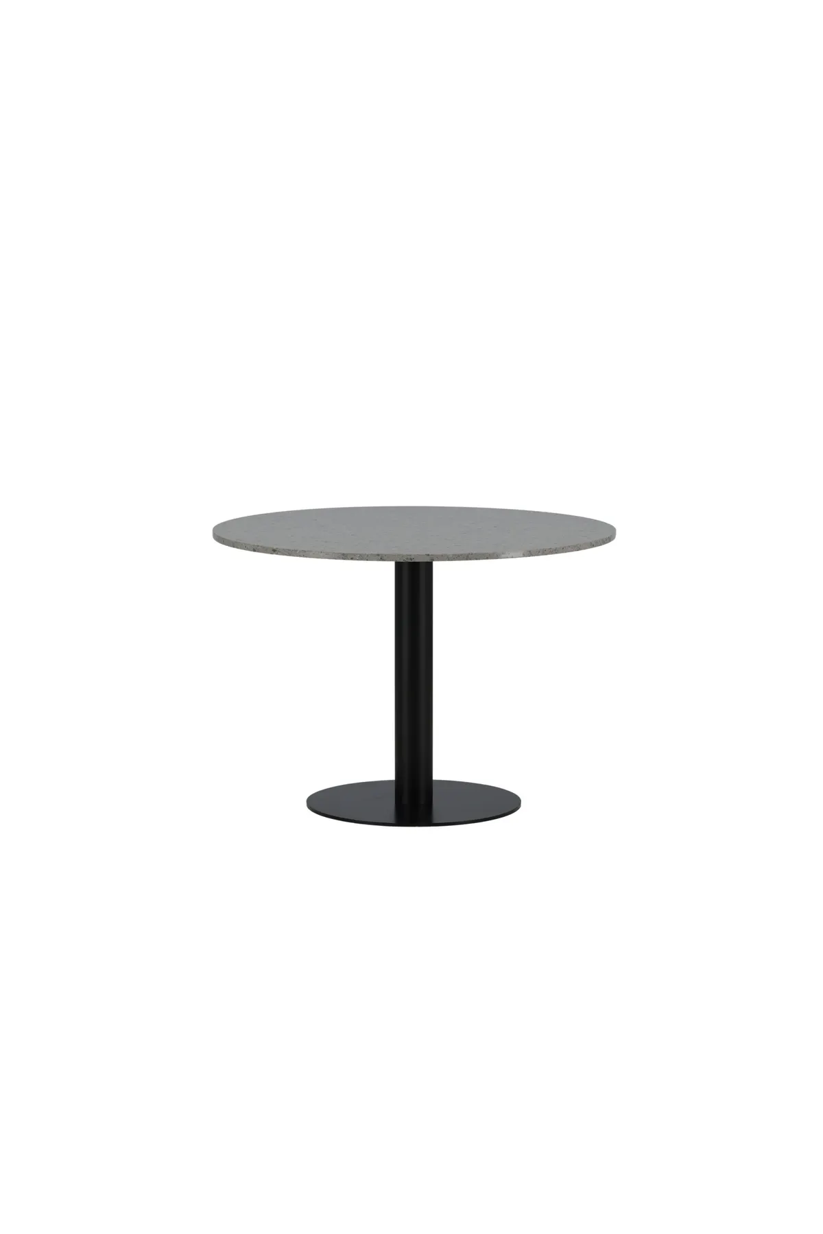 Razzia, ein moderner, runder Esstisch in schönem Terazzo mit grauem Finish und einem Gestell aus schwarzem Metall. Hier wird robustes Design mit sauberen Formen kombiniert. Die runde Tischplatte verleiht dem Raum einen wohnlichen und einladenden Eindruck – hier landet niemand auf der Kante! Richten Sie sich smart, ordentlich und stilvoll mit einem auffälligen Esstisch ein. Kombinieren Sie ihn mit optionalen Stühlen, um der Einrichtung eine persönliche Note zu verleihen.