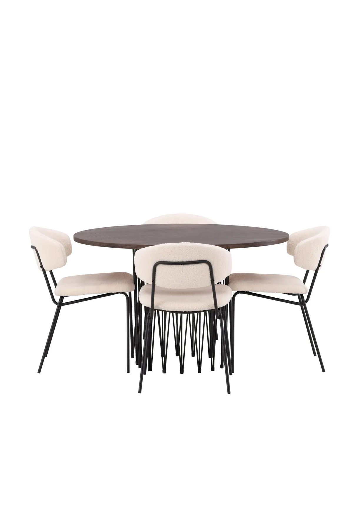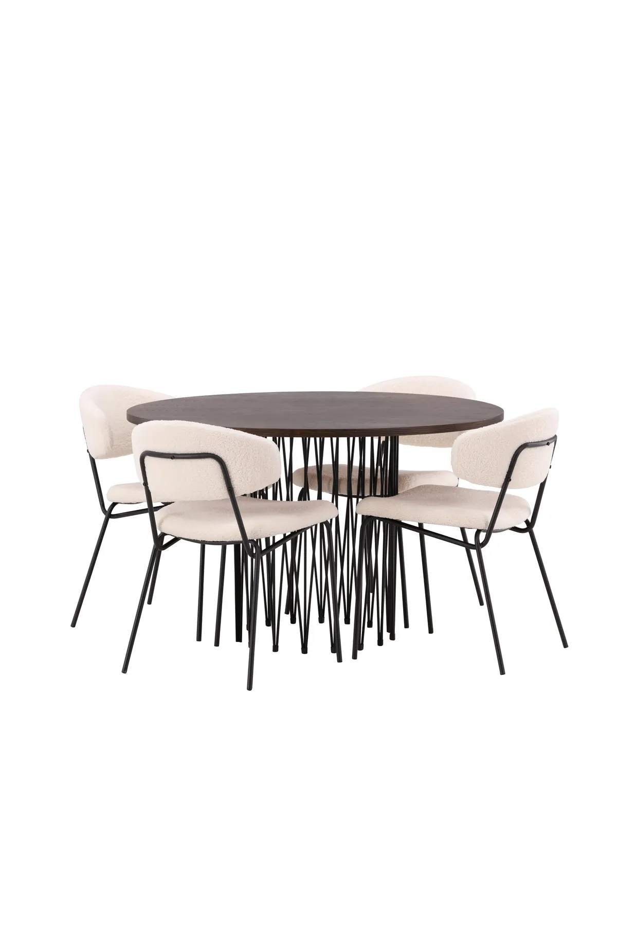 Perfekt aufeinander abgestimmt – diese Essgruppe beeindruckt! Unser runder Esstisch Stone hat ein fantastisches, skandinavisches Design, das in die Menge passt. Der Tisch hat eine schöne braunfarbene Tischplatte aus MDF mit Furnier und ein dekoratives zylinderförmiges Gestell aus schwarzem Metall. Hier zusammen mit unseren trendigen Esszimmerstühlen aus der Chico-Serie. Die Stühle haben ein minimalistisches und komfortables Design mit einer Rückenlehne und Sitzfläche aus weißem Bouclestoff und einem schmalen Gestell aus schwarzem Stahl. Hier erhalten Sie eine gemütliche und moderne Gruppe in Ihrem Zuhause!