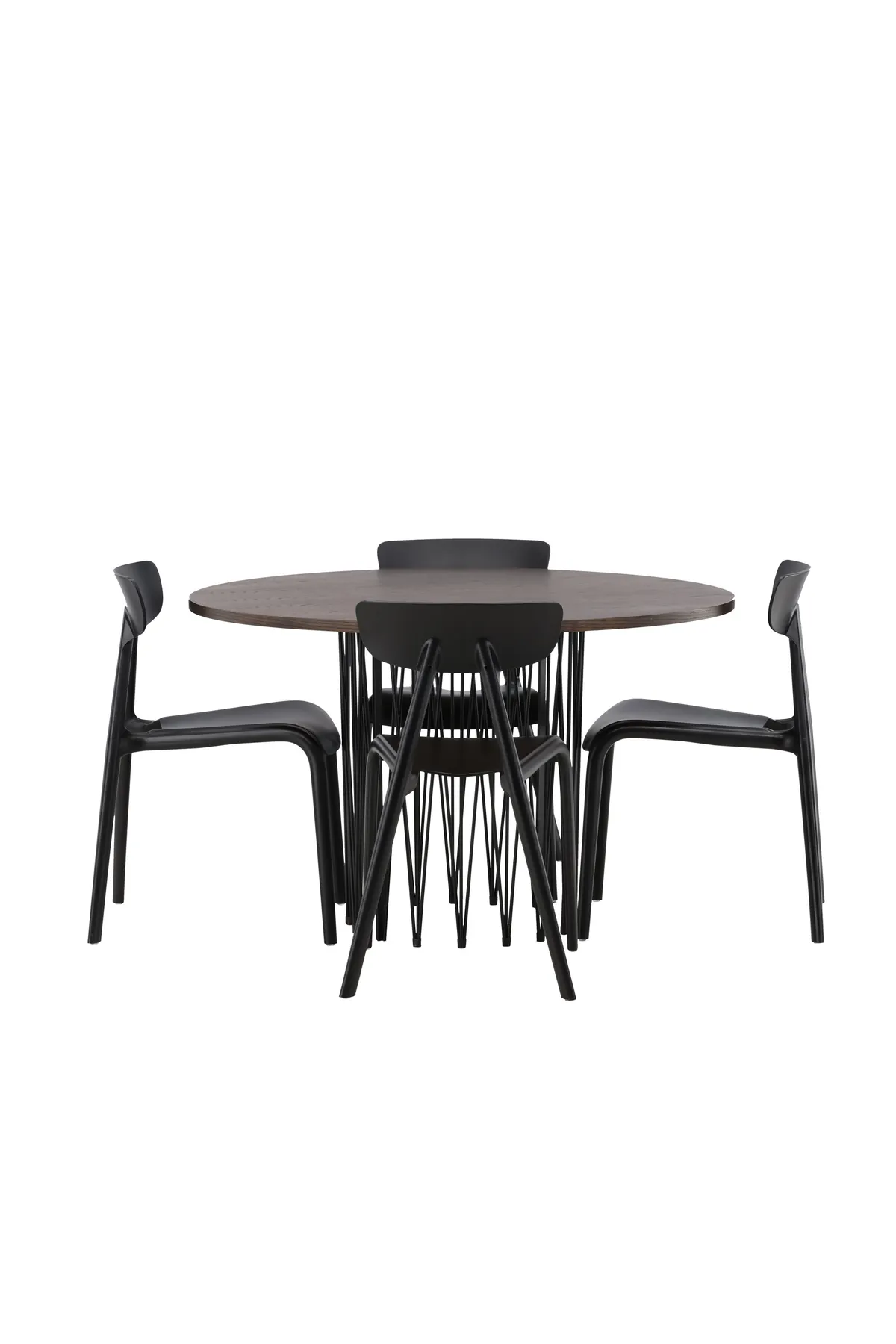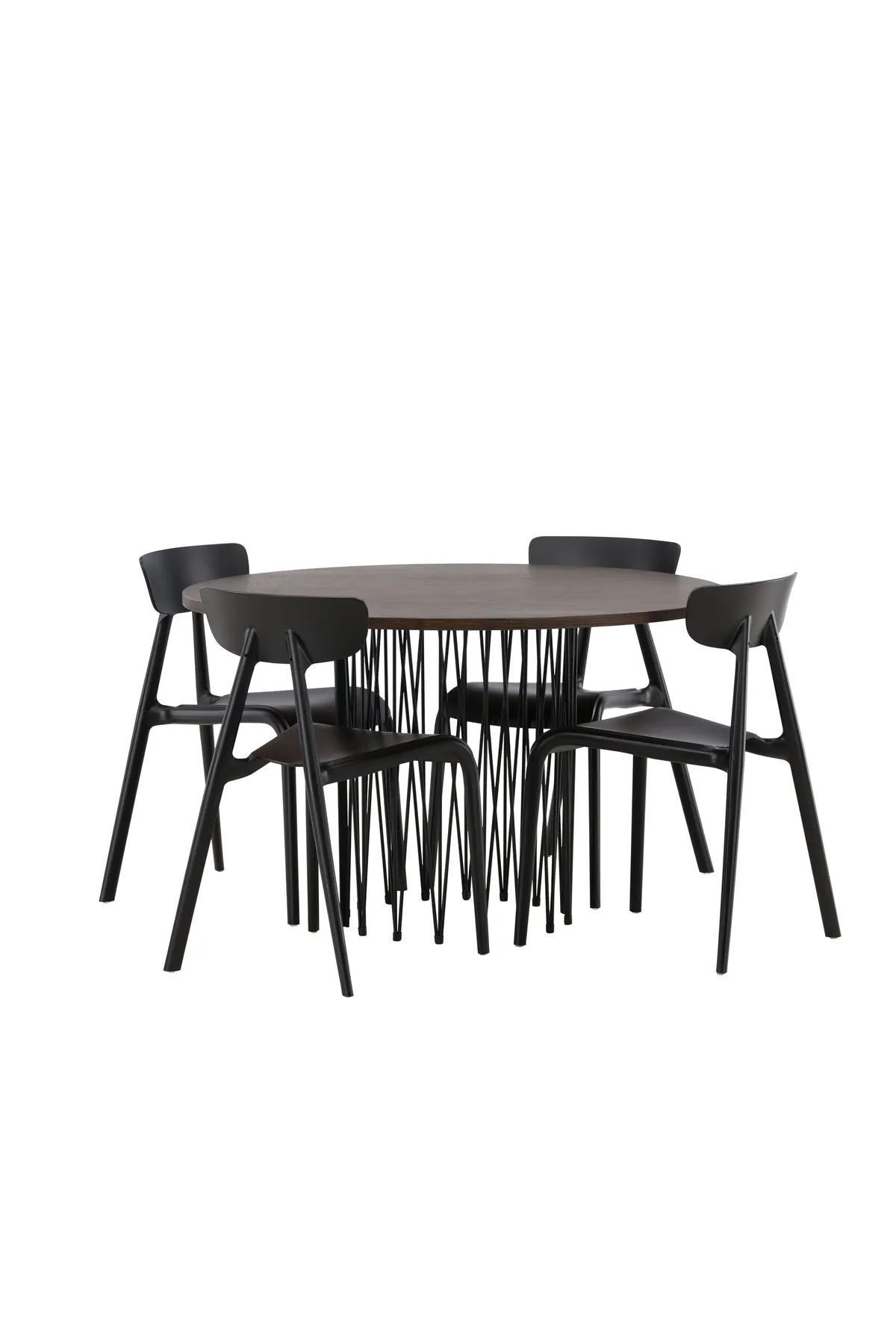Gehen Sie keine Kompromisse zwischen klassischem Stil und modernem Design ein. Unser runder Esstisch Stone hat ein fantastisches, skandinavisches Design, das in die Menge passt. Der Tisch hat eine schöne braunfarbene Tischplatte aus MDF mit Furnier und ein dekoratives zylinderförmiges Gestell aus schwarzem Metall. Hier zusammen mit unseren geschmackvollen Stühlen aus der Ursholmen-Serie. Diese schwarzen Stühle aus robustem Kunststoff haben eine zeitlose schwarze Farbe und ausgestellte Formen, die perfekt zum Tisch passen. Genießen Sie in Zukunft angenehme Mahlzeiten an einem Esstisch, an dem niemand auf der Kante landet!