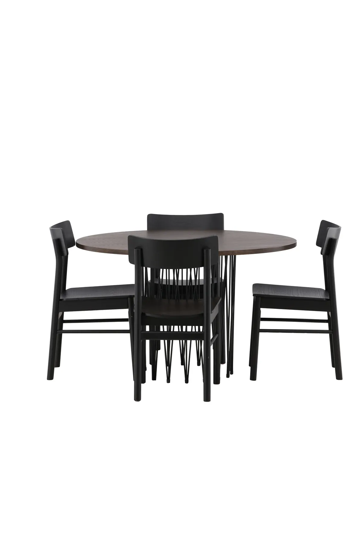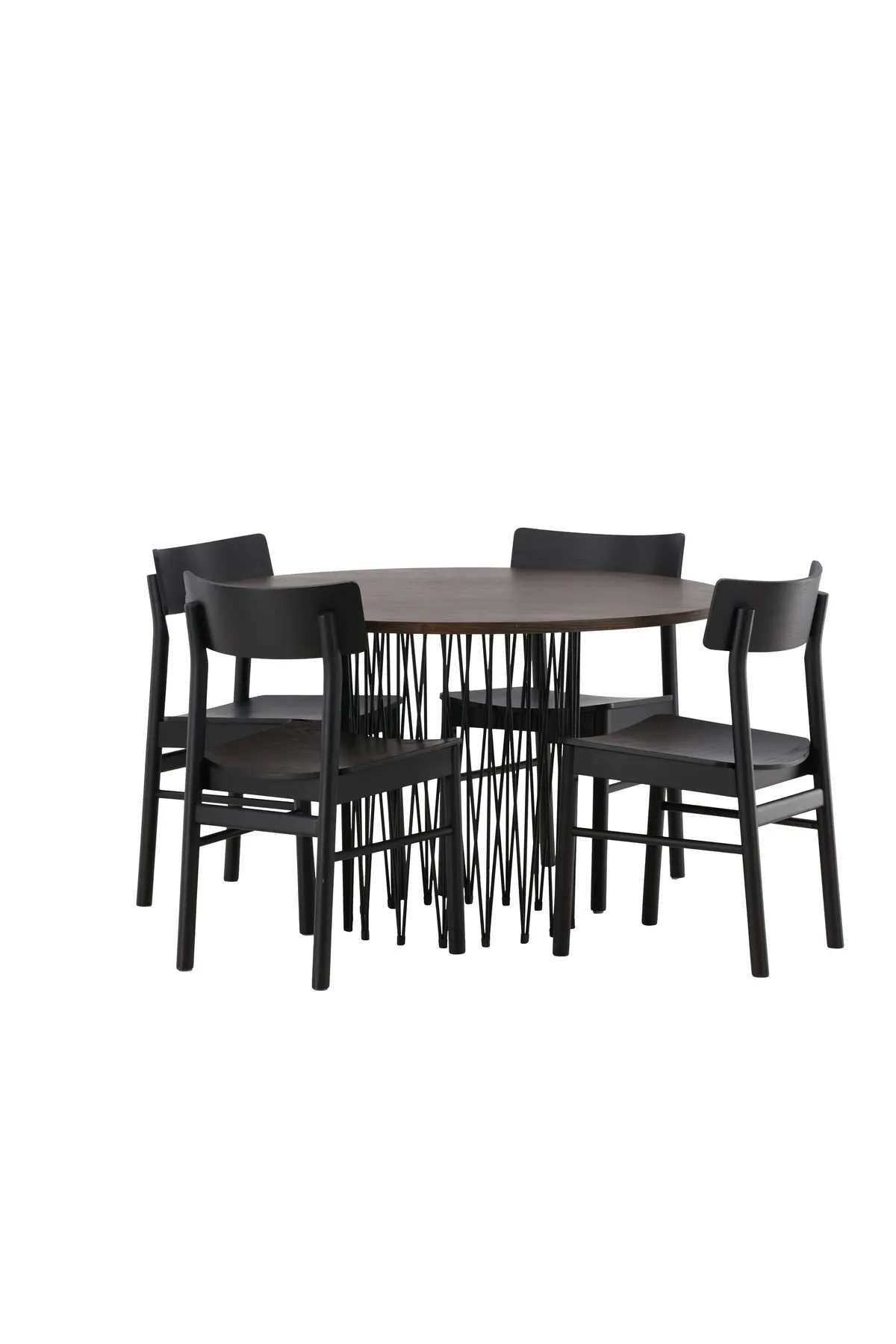 Eine wundervoll passende Essgruppe mit den richtigen Eigenschaften! Unser runder Esstisch Stone hat ein fantastisches, skandinavisches Design, das in die Menge passt. Der Tisch hat eine schöne braunfarbene Tischplatte aus MDF mit Furnier und ein dekoratives zylinderförmiges Gestell aus schwarzem Metall. Hier in perfekter Kombination mit unseren beliebten Esszimmerstühlen Montros. Der Stuhl hat ein klassisches und nostalgisches Design mit geraden nordischen Formen, alles zusammen aus schwarzem Kautschukholz. Richten Sie Ihr Zuhause klassisch und einladend ein!
