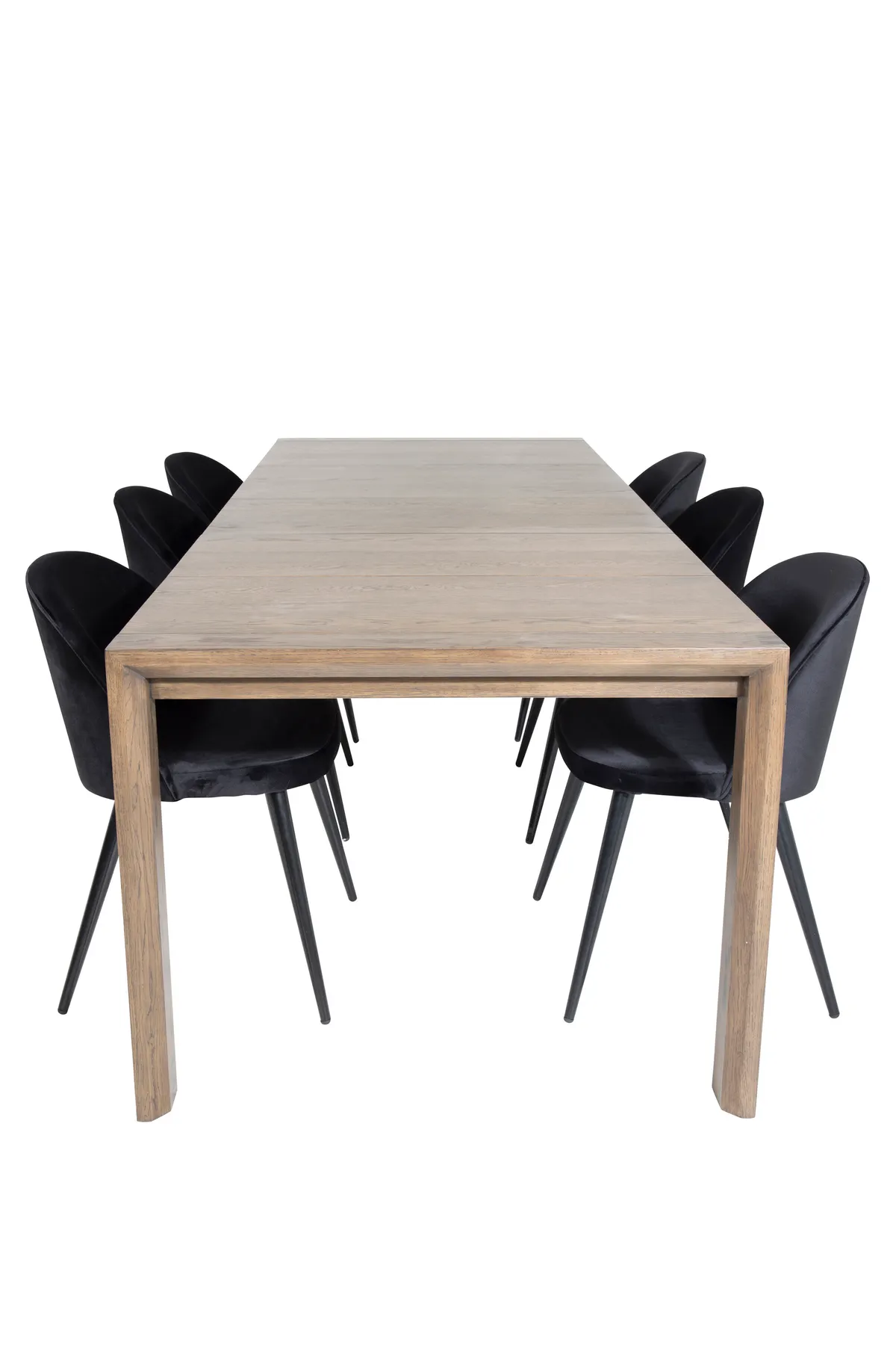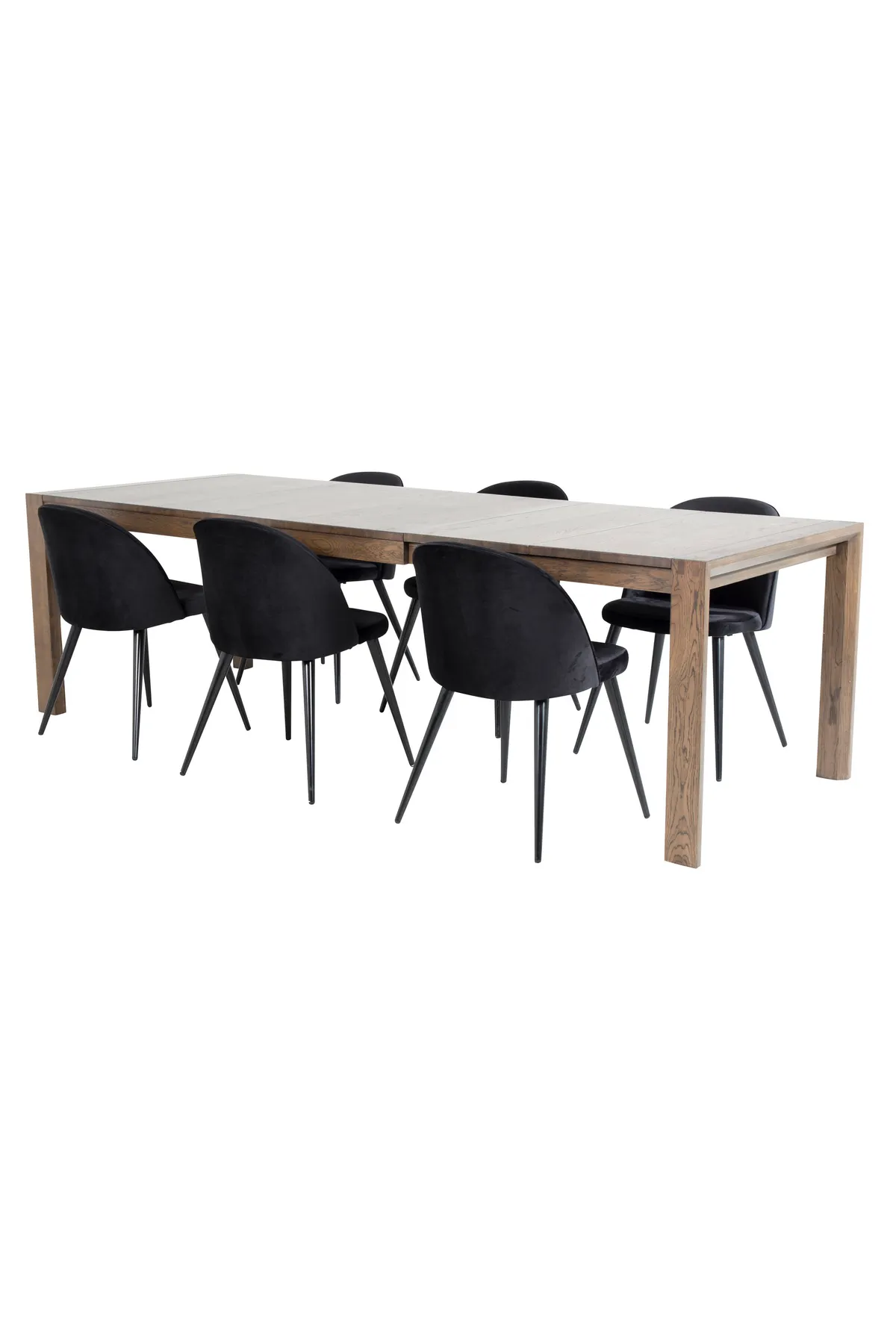 Velvet, unsere adretten, aber sitzfreundlichen Esszimmerstühle. Hier kombiniert mit dem Esstisch Slider in einer stilvollen Eichenoptik Erweiterungsmöglichkeit. Eine Essgruppe, die sowohl bei kleinen als auch bei großen Festen gut funktioniert!