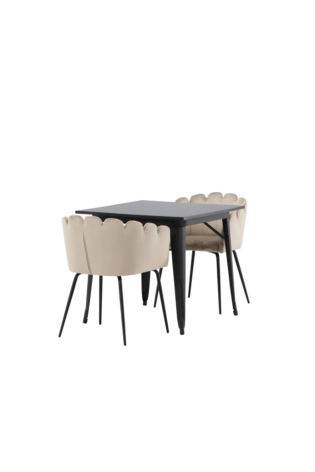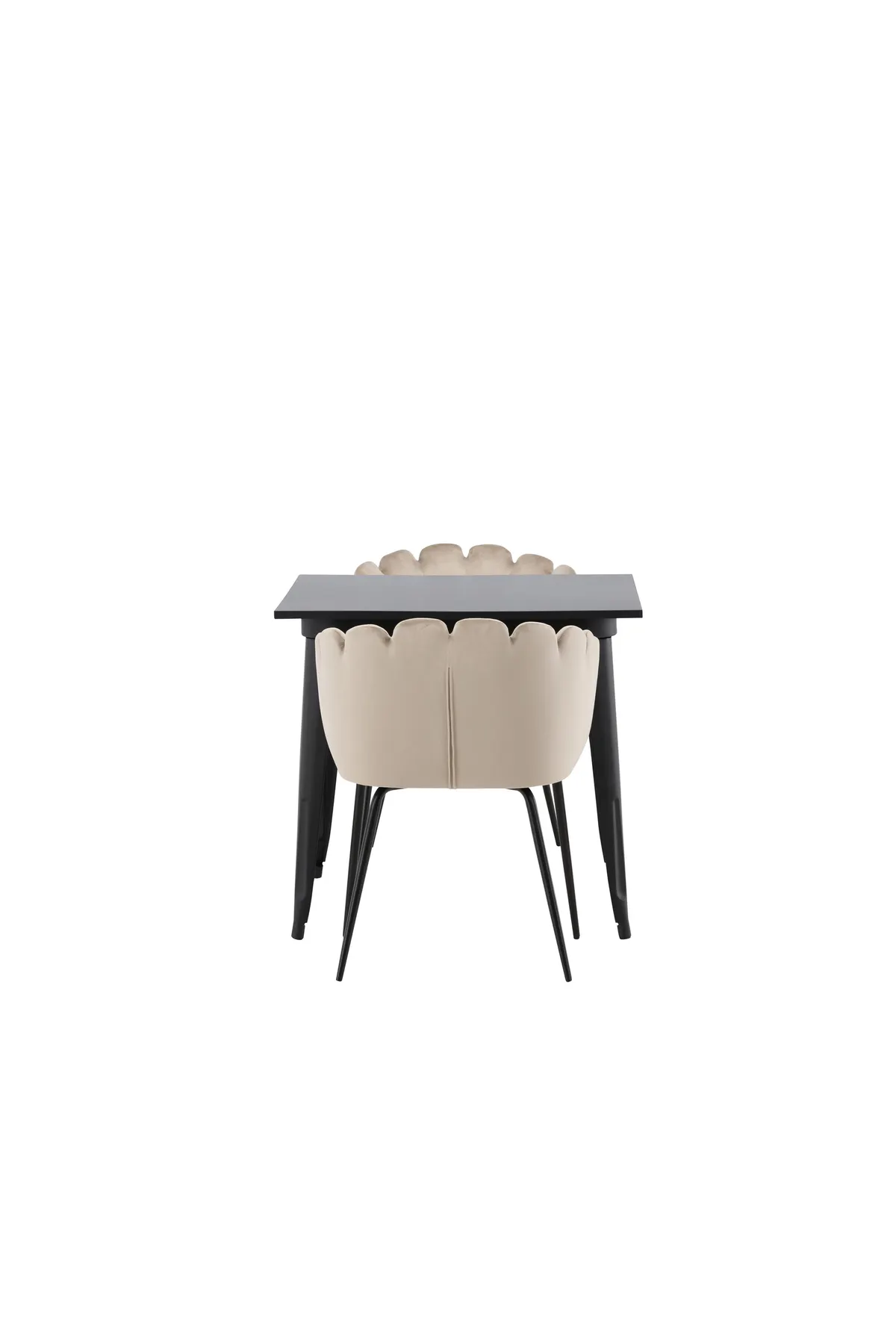 Eine gepflegte Essgruppe, die Luxus und Eleganz ausstrahlt! Dieser Esstisch aus der Tempe-Serie hat ein klassisches, quadratisches Design und eine zeitlose schwarze Farbe. Die Tischplatte ist aus schwarzem MDF und die Tischbeine aus schwarzem Metall. Hier in geschmackvoller Kombination mit zwei bequemen Esszimmerstühlen aus der Limhamn-Serie. Der Stuhl ist mit seinem einladenden Design, der dekorativen muschelförmigen Rückenlehne mit Ziernähten und einer runden Sitzfläche aus geschmackvollem beigem Samtstoff ein moderner Favorit in vielen Haushalten. Die Beine sind aus schwarz pulverbeschichtetem Metall. Sitzen Sie bequem und herrschaftlich!