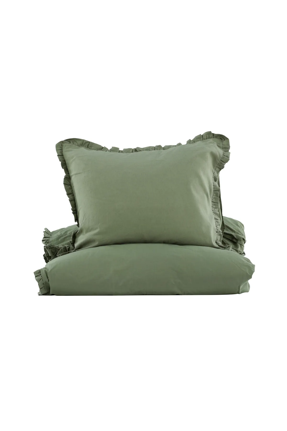 Komfortabler Bettbezug aus Leinen und Baumwolle in der Farbe Grün. Abmessungen: 150×200. Pflegehinweise: Maschinenwäsche 60 Grad.