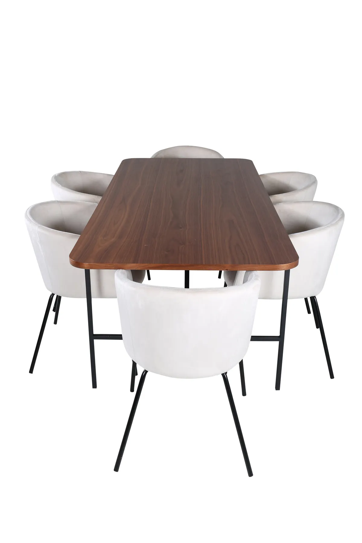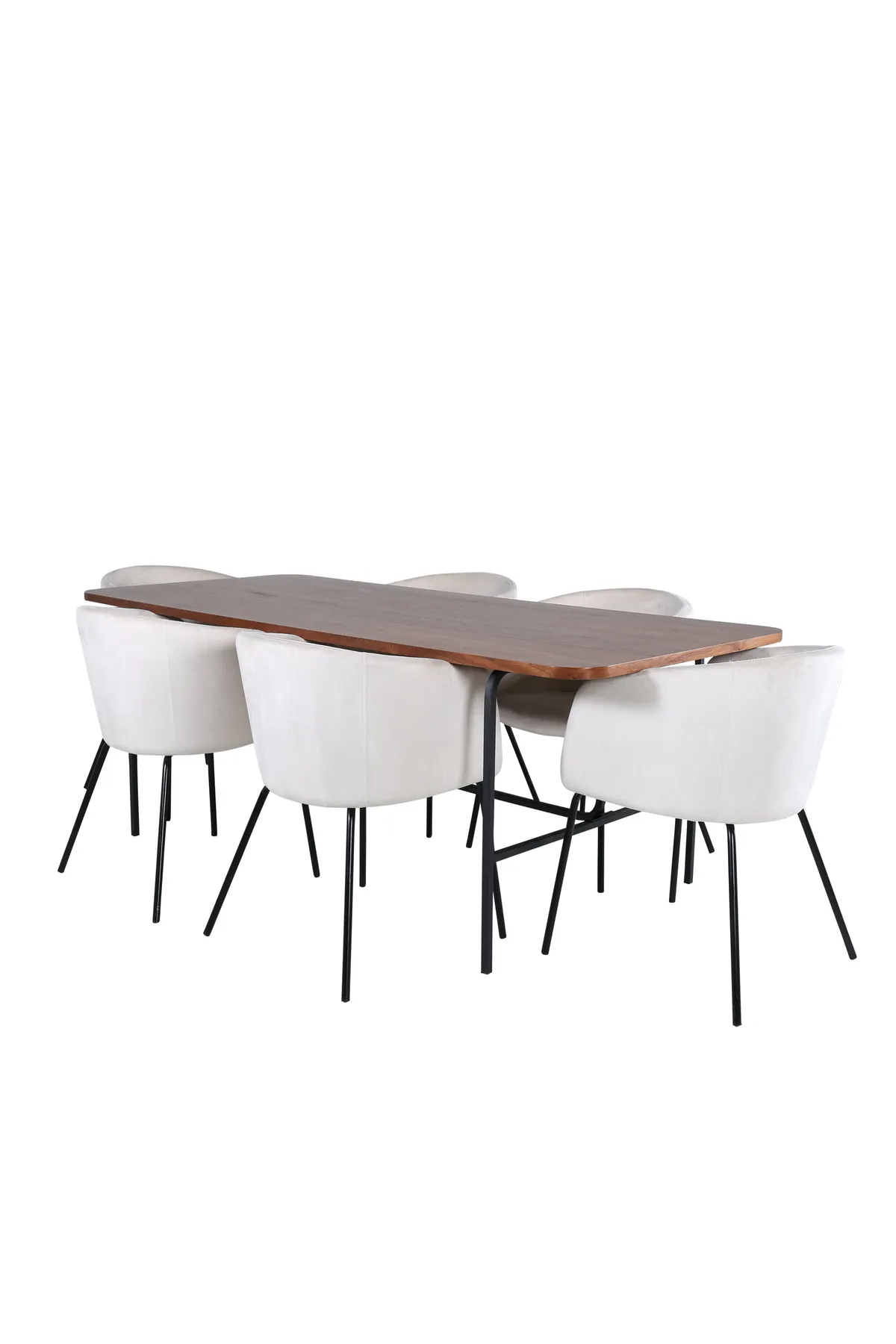 Unser beliebter Esstisch Uno ist so stilvoll wie zeitlos! Der Tisch hat ein rechteckiges Design mit leicht abgerundeten Ecken, eine Tischplatte aus nussbaumfarbenem MDF mit Furnier und ein stilvolles Untergestell aus schwarzem Metall. Maße des Tisches: Länge: 200cm, Breite: 90cm, Höhe: 74cm. Hier in perfekter Kombination mit 6 Berit Esszimmerstühlen in beigem Samtstoff und stilvollen schmalen Stuhlbeinen aus schwarzem Eisen. Stuhl-Maße: Höhe: 78cm, Sitzhöhe: 49cm, Breite: 55cm, Tiefe: 55cm. Eine Essgruppe, die auf Komfort und Eleganz setzt!
