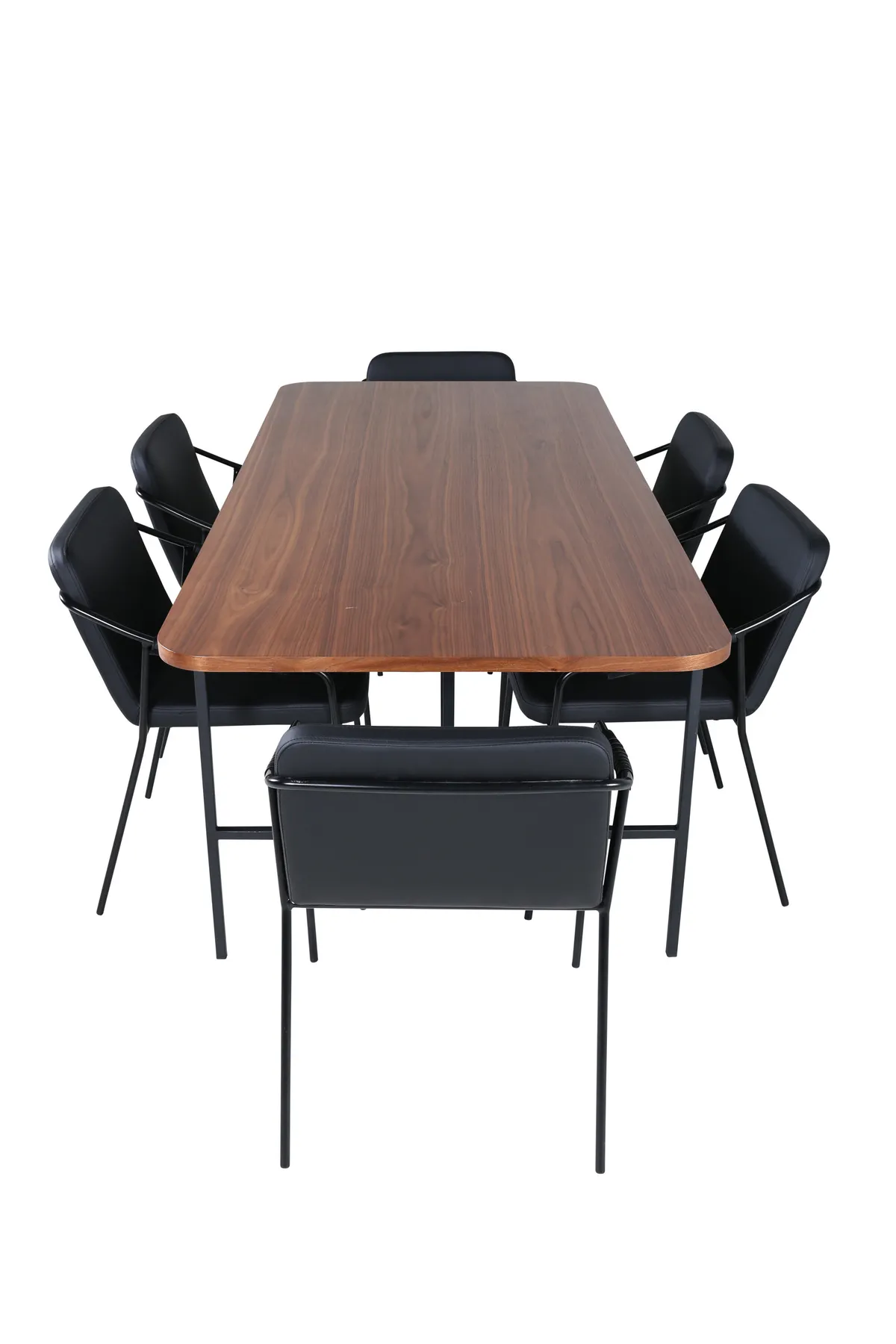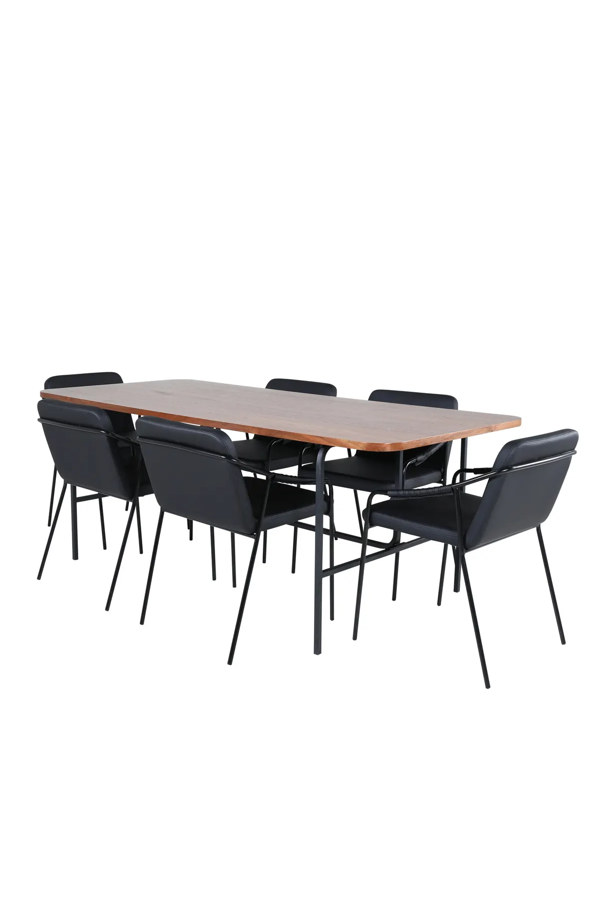 Eine Essgruppe, die modernes Design und einladende Gefühle ausstrahlt! Der Esstisch Uno ist rechteckig mit leicht abgerundeten Ecken, einer Platte aus nussbaumfarbenem MDF mit Furnier und einem stilvollen Untergestell aus schwarzem Metall. Maße des Tisches: Länge: 200cm, Breite: 90cm, Höhe: 74cm. Kombiniert mit 6 Streit Esszimmerstühlen im Smack-Design. Die Sitze sind aus schwarzem Kunstleder und haben integrierte Armlehnen sowie Stuhlbeine aus schwarzem Eisen. Abmessungen der Stühle: Höhe: 77cm, Sitzhöhe: 48cm, Breite: 53cm, Tiefe: 59cm. Eine luxuriöse und stilvolle Essgruppe, die zu langen Dinner-Momenten einlädt!