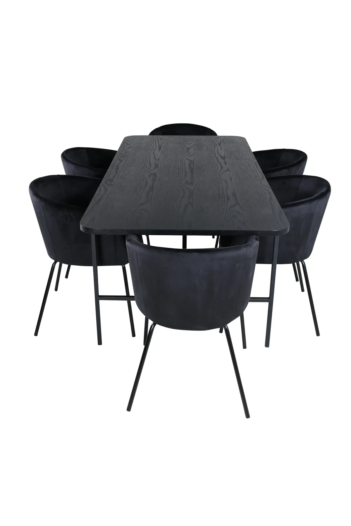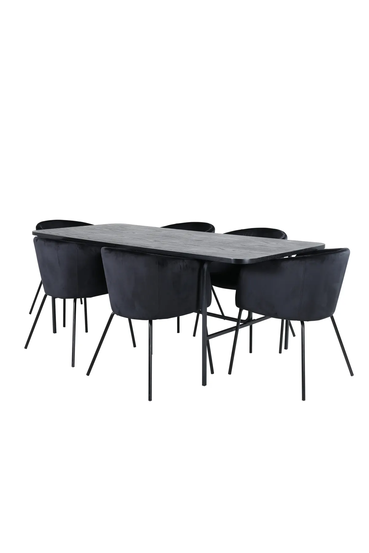 Eine Lebensmittelgruppe, die auf Komfort und Eleganz setzt! Unser beliebter Esstisch Uno ist ebenso stilvoll wie zeitlos. Der Tisch hat ein rechteckiges Design mit leicht abgerundeten Ecken, einer Tischplatte aus schwarzem MDF mit Furnier und einem stilvollen Untergestell aus schwarzem Metall. Tischabmessungen: Länge: 200cm, Breite: 90cm, Höhe: 74cm. Hier in perfekter Kombination mit 6 Berit Esszimmerstühlen in schwarzem Samtstoff und stilvollen schmalen Stuhlbeinen aus schwarzem Eisen. Maße der Stühle: Höhe: 78cm, Sitzhöhe: 49cm, Breite: 55cm, Tiefe: 55cm.