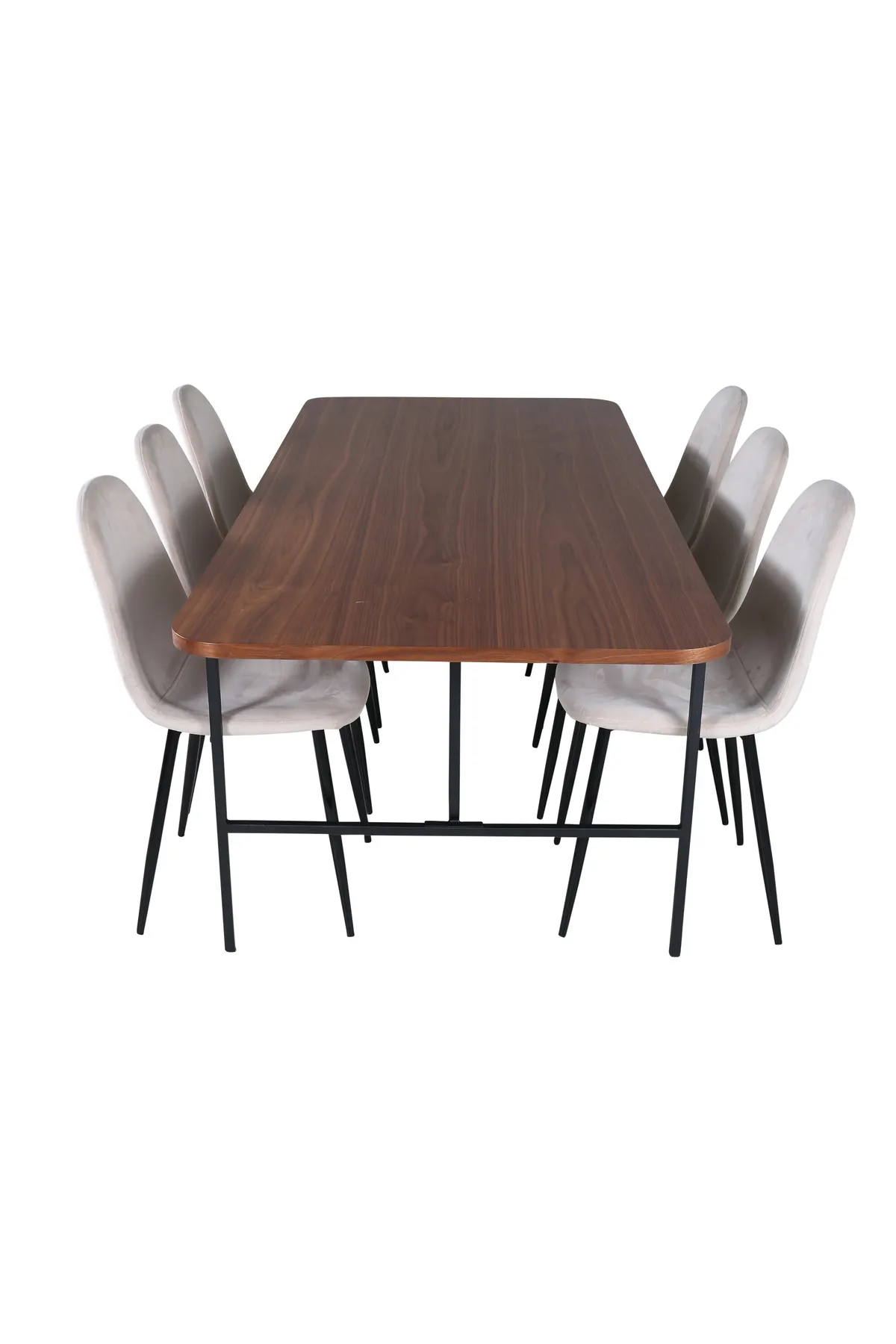 Erhöhen Sie das Einrichtungsniveau im Wohnzimmer mit einer köstlich passenden Essgruppe in modernen Farben! Der Esstisch Uno ist rechteckig mit leicht abgerundeten Ecken, einer Platte aus nussbaumfarbenem MDF mit Furnier und einem stilvollen Untergestell aus schwarzem Metall. Tisch-Abmessungen: Länge: 200cm, Breite: 90cm, Höhe: 74cm. Hier zusammen mit 6 Polar Esszimmerstühlen in klassischem Design. Die Stuhlbeine sind aus schwarzem Metall und die Sitze aus feinem beigen Samtstoff. Maße der Stühle: Höhe: 87cm, Sitzhöhe: 45,5cm, Breite: 44cm, Tiefe: 53cm. Eine fertig zusammengestellte Essgruppe zu kaufen ist sowohl trend-sicher als auch praktisch!