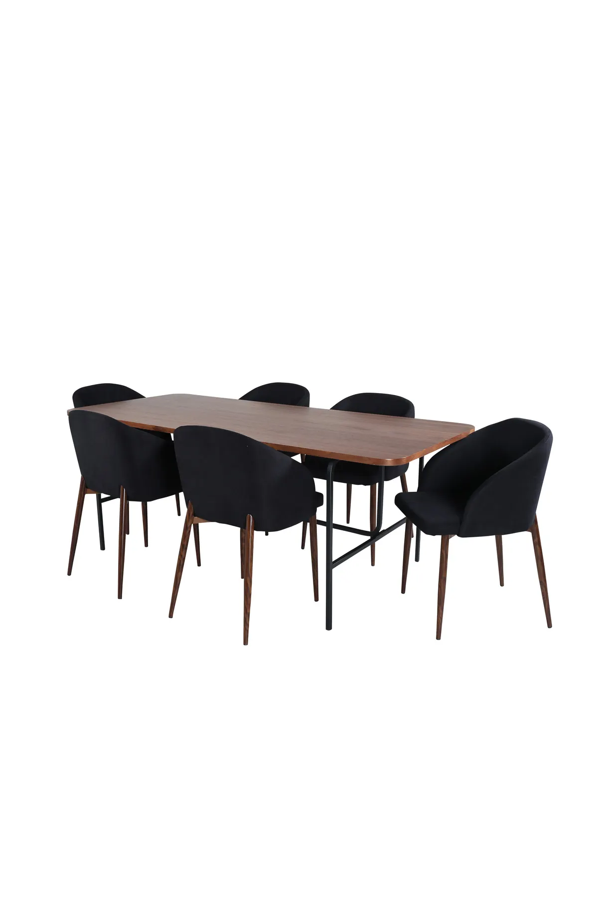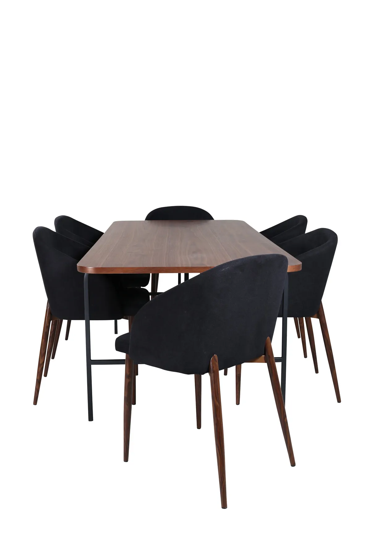 Die köstliche Kombination aus Schwarz und Walnuss klettert auf die Einrichtungslisten! Der Esstisch Uno ist rechteckig mit leicht abgerundeten Ecken, einer Platte aus nussbaumfarbenem MDF mit Furnier und einem stilvollen Untergestell aus schwarzem Metall. Maße des Tisches: Länge: 200cm, Breite: 90cm, Höhe: 74cm. Hier zusammen mit 6 Arch-Esszimmerstühlen mit nussbaumfarbenem Metallgestell und schwarzen Sitzen aus Polyester – eine perfekte Ergänzung, die einfach ein auffälliges Ganzes in Ihrem Wohnzimmer bildet! Maße der Stühle: Höhe: 83cm, Sitzhöhe: 53cm, Breite: 48,5cm, Tiefe: 55cm.