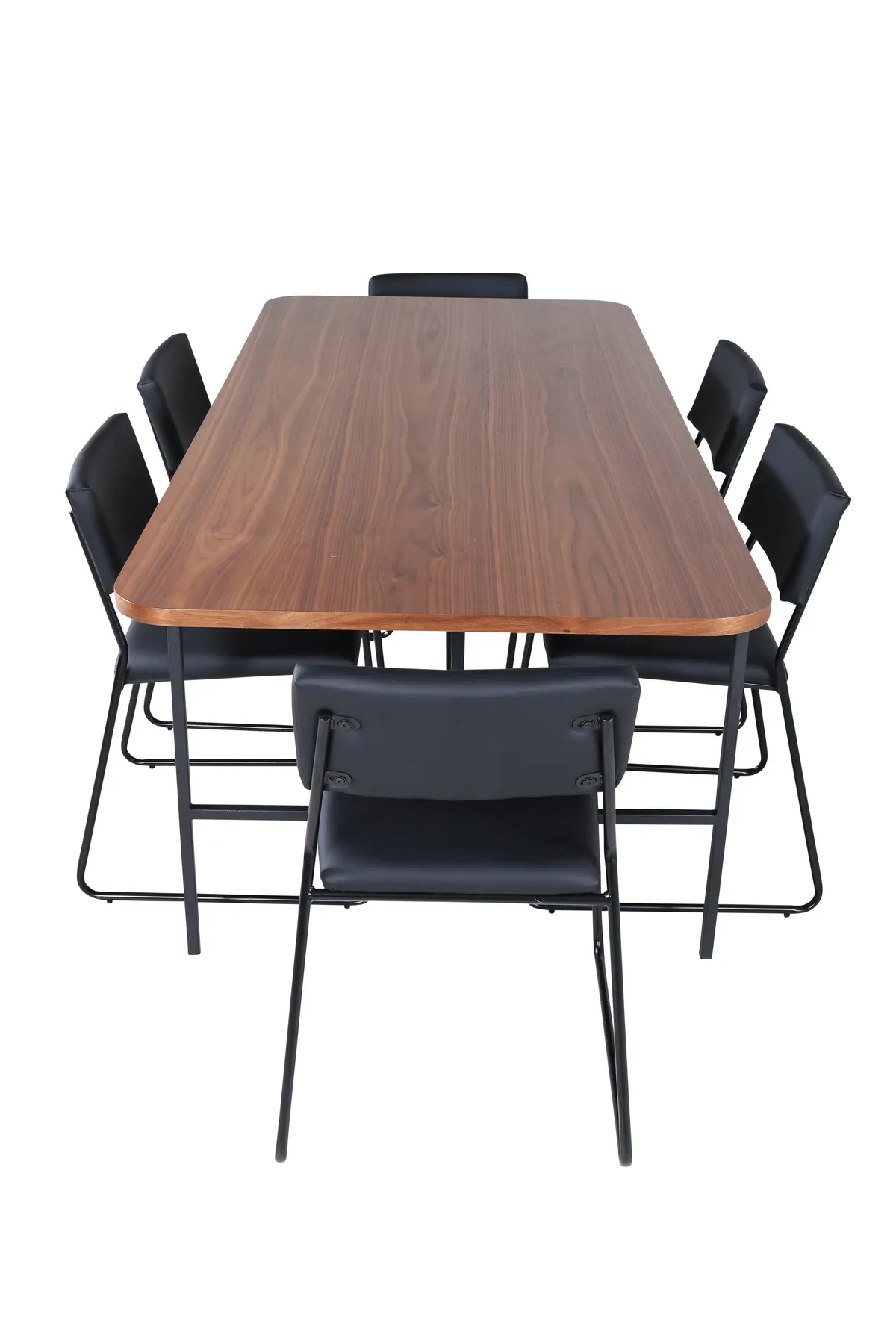 Stilvolle und luftige Essgruppe für alle Gelegenheiten – richten Sie Ihr Wohnzimmer elegant und einladend ein! Esstisch Uno ist rechteckig gestaltet mit leicht abgerundeten Ecken, einer Platte aus nussbaumfarbenem MDF mit Furnier und einem stilvollen Untergestell aus schwarzem Metall. Maße des Tisches: Länge: 200cm, Breite: 90cm, Höhe: 74cm. Hier in schlanker Kombination mit 6 Kenth Esszimmerstühlen in minimalistischem Design. Die Stuhlbeine sind stilvoll schmal in schwarzem Eisen und die Sitze in frechem schwarzen Kunstleder. Maße der Stühle: Höhe: 76cm, Sitzhöhe: 48,5cm, Breite: 40cm, Tiefe: 52cm. Genießen Sie angenehme Mahlzeiten in Zukunft!