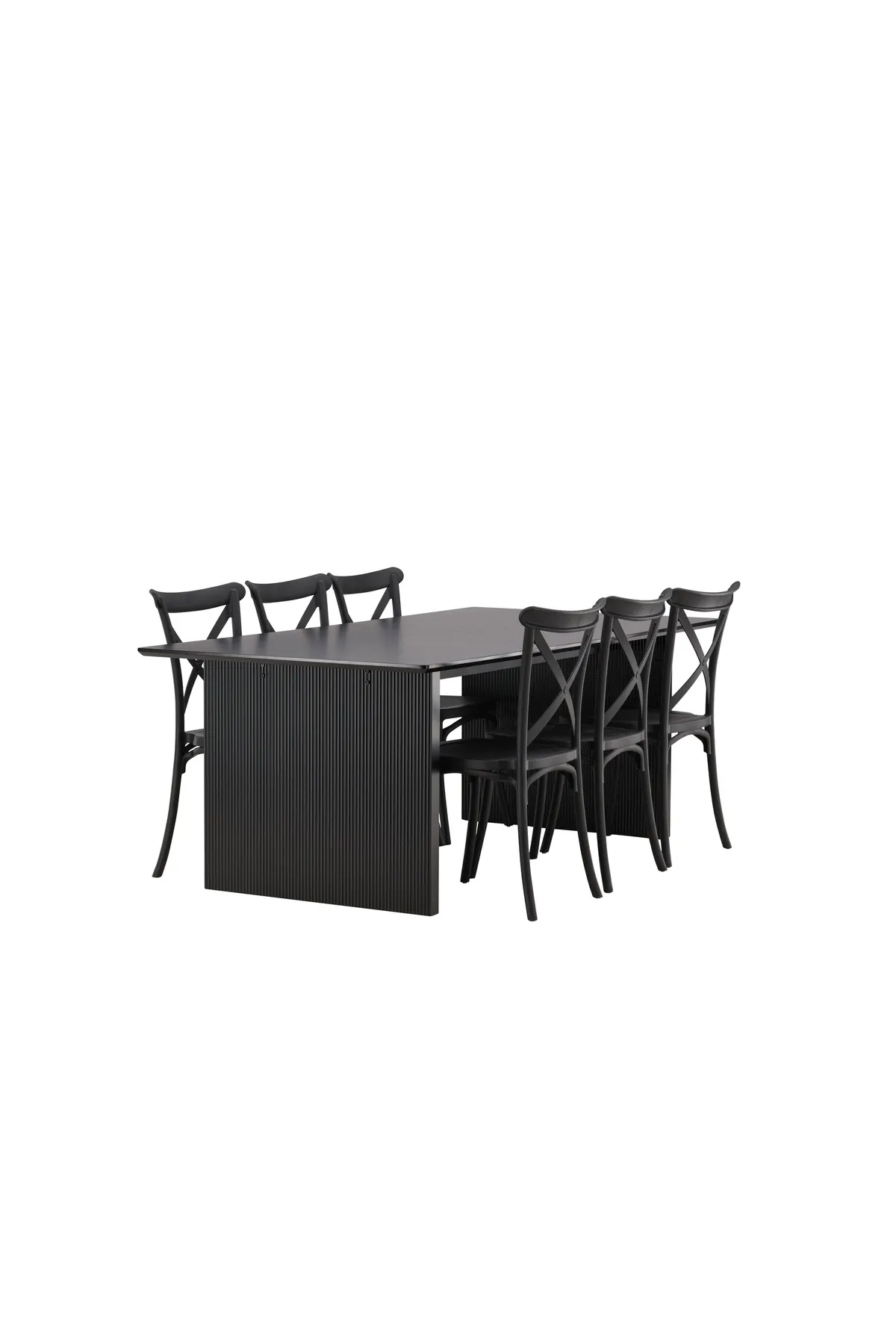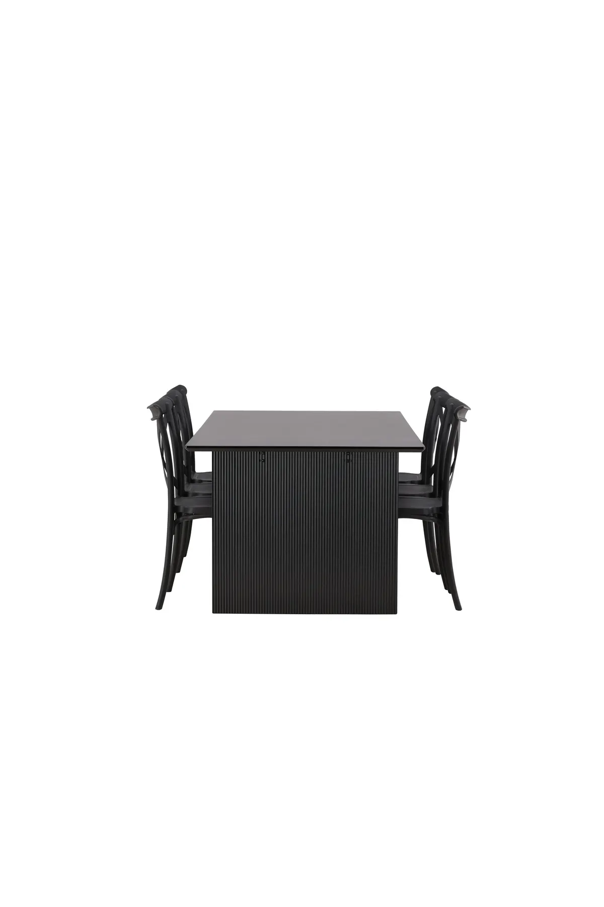 Hier werden klassisches Design und moderne Formen kombiniert! Unser rechteckiger Esstisch aus der Serie Vail hat geradlinige nordische Formen und ist aus langlebigem MDF in rußschwarzer Farbe gefertigt. Die Tischplatte ist dünn und balanciert auf zwei stabilen Holzplatten, die das Untergestell bilden – ebenso ordentlich wie haltbar. Hier zusammen mit Esszimmerstühlen aus der Serie Crosett. Die Stühle haben ein nostalgisches Design mit gekreuzter Rückenlehne und geraden Linien, konsequent aus schwarzem Kunststoff. Hier bekommen Sie eine stilvolle Essgruppe zum Einrichten Ihres Zuhauses!