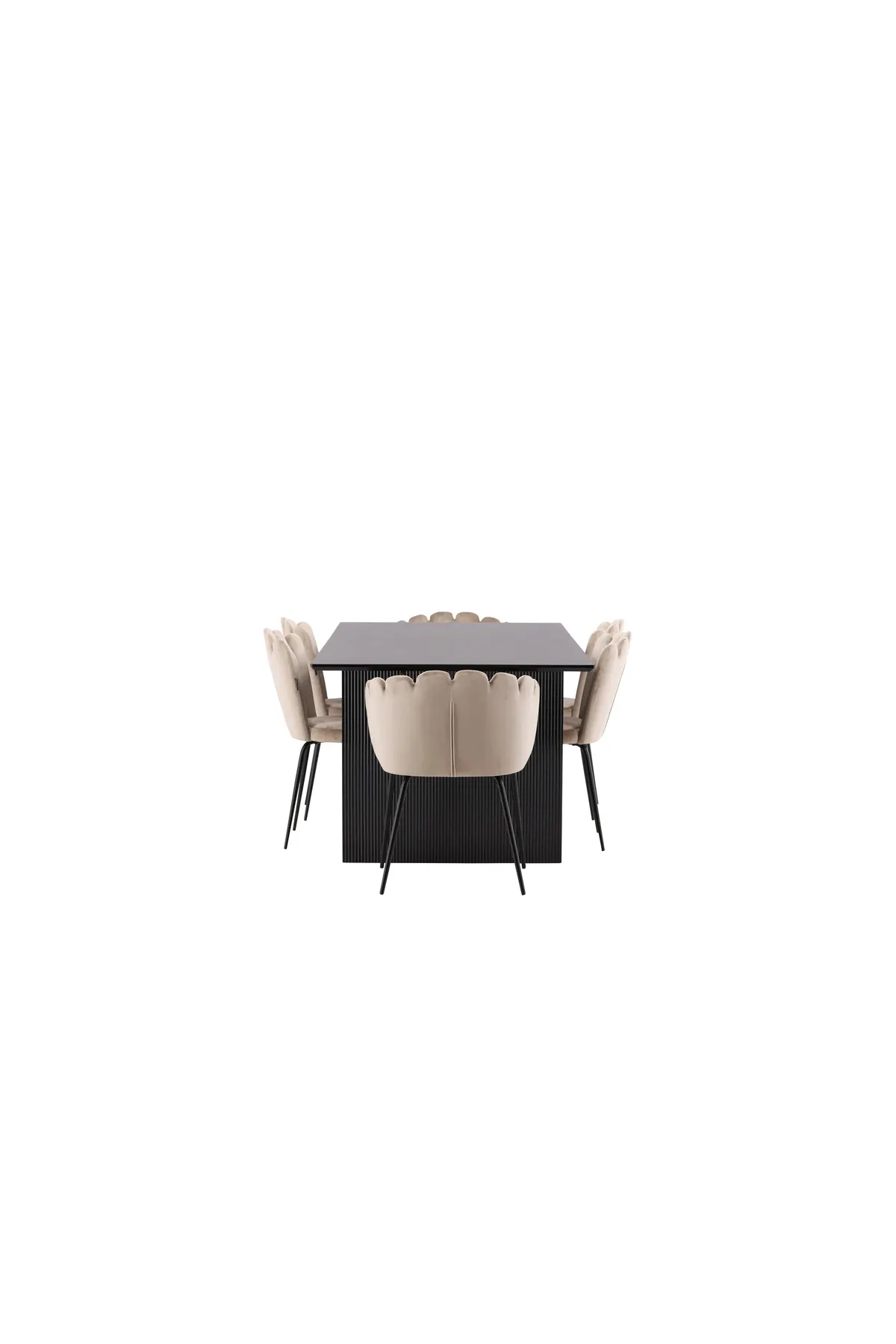 Richten Sie das Herzstück Ihres Zuhauses charmant und einladend ein! Unser rechteckiger Esstisch aus der Serie Vail hat geradlinige nordische Formen und ist aus langlebigem MDF in rußschwarzer Farbe gefertigt. Die Tischplatte ist dünn und balanciert auf zwei stabilen Holzplatten, die das Untergestell bilden – ebenso ordentlich wie haltbar. Hier zusammen mit Esszimmerstühlen aus der Limhamn-Serie in luxuriösem Beige. Der Stuhl ist ein moderner Favorit in vielen Haushalten mit seinem einladenden Design, der dekorativen muschelförmigen Rückenlehne mit Ziernähten und einer runden Sitzfläche aus geschmackvollem beigem Samtstoff. Die Beine sind aus schwarz pulverbeschichtetem Metall. Zurücklehnen, bequem sitzen und genießen!